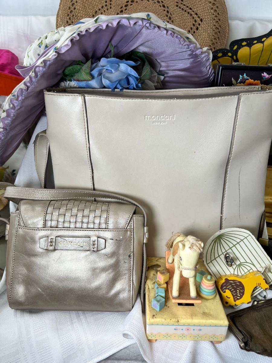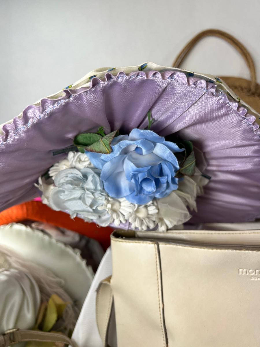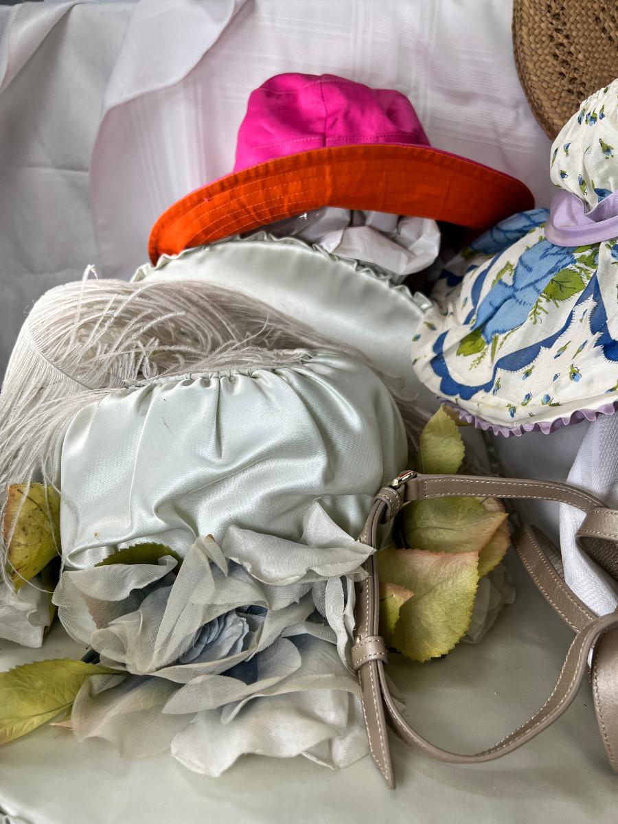 Collectibles, woven round purse, 3 Kentucky Derby hats, hand made designers, small purses