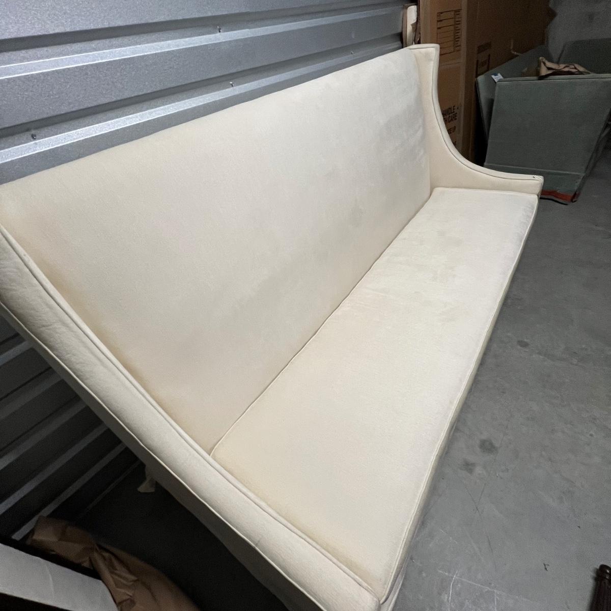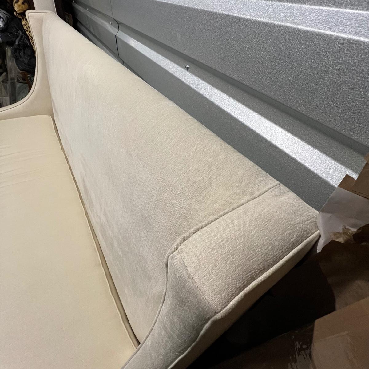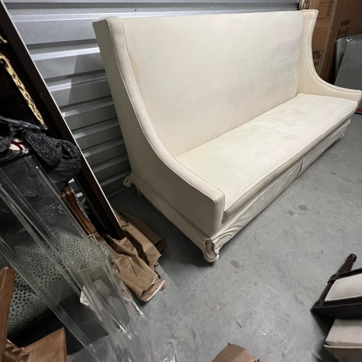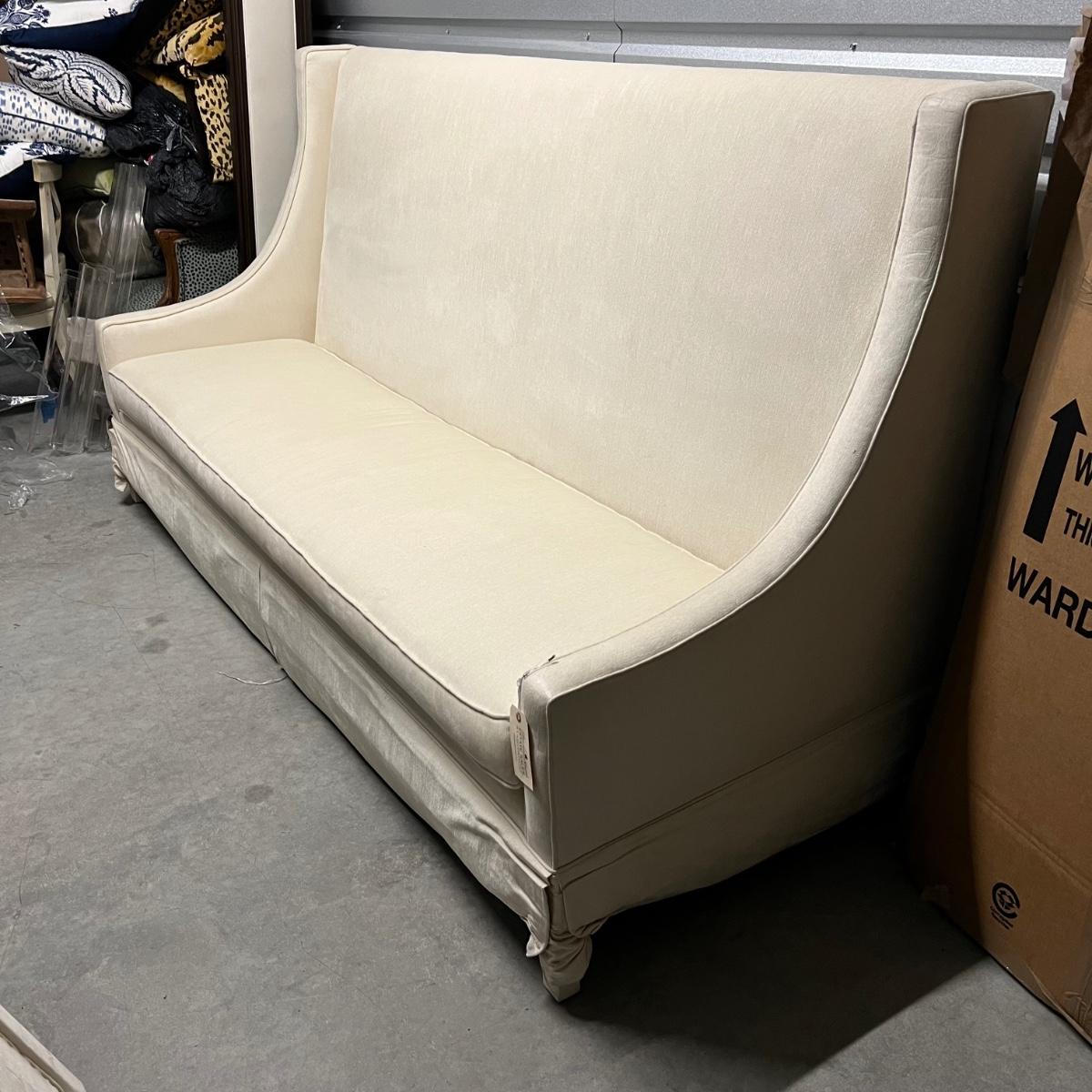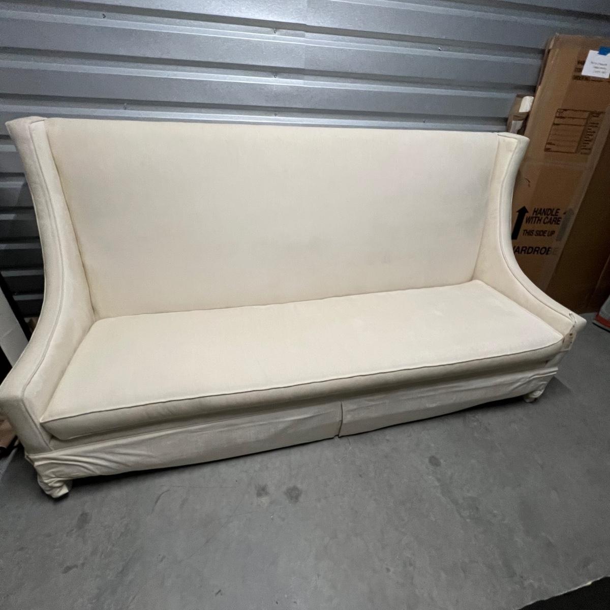 This high back sofa has a super soft cream upholstery. It was wrapped in plastic, which is why the fabric on the corners by the sofas feet is a little wrinkled. It has one long seat cushion which has a removable cover. No identifying marks found.