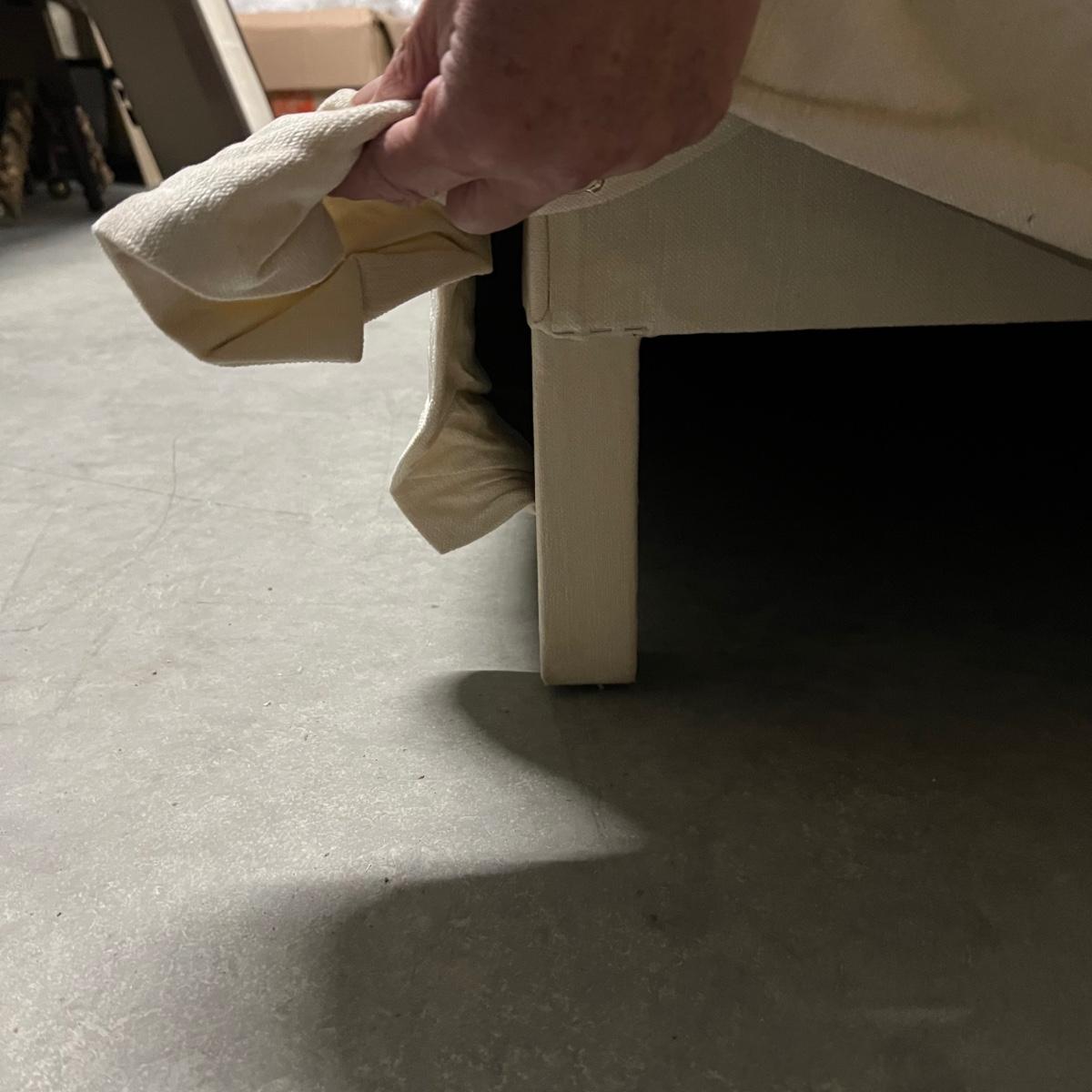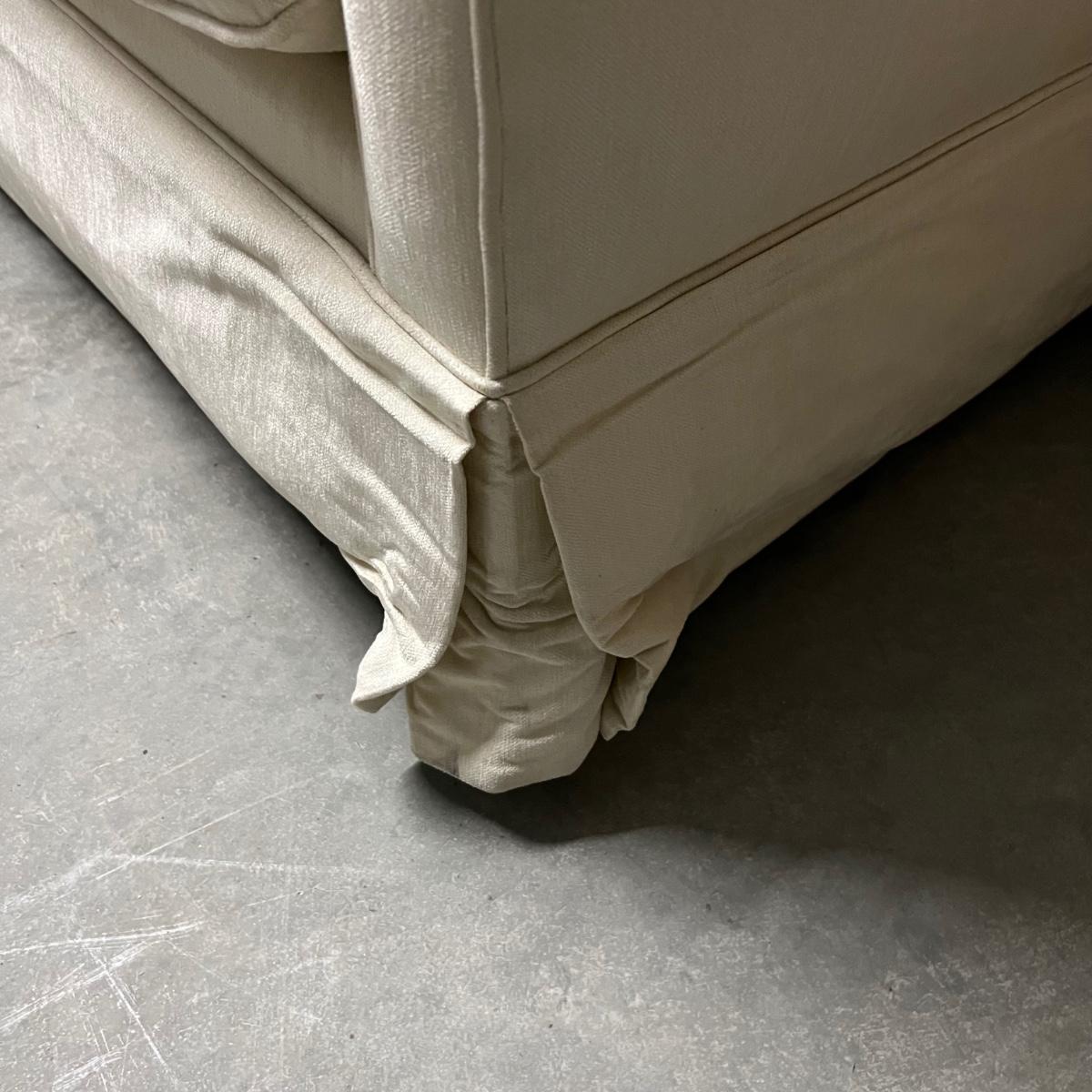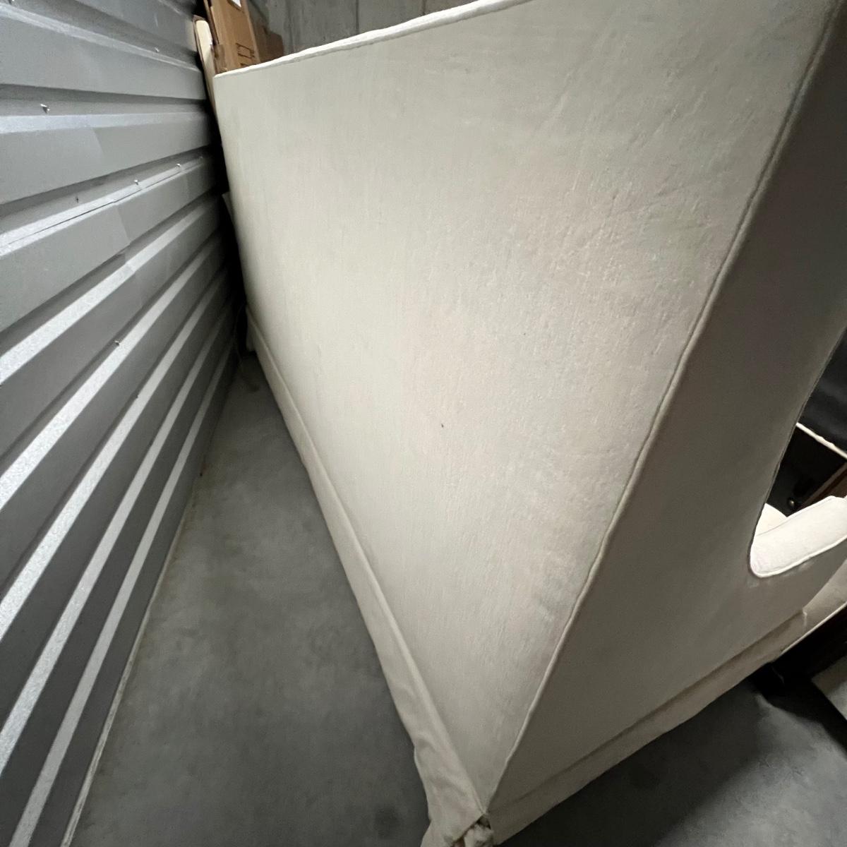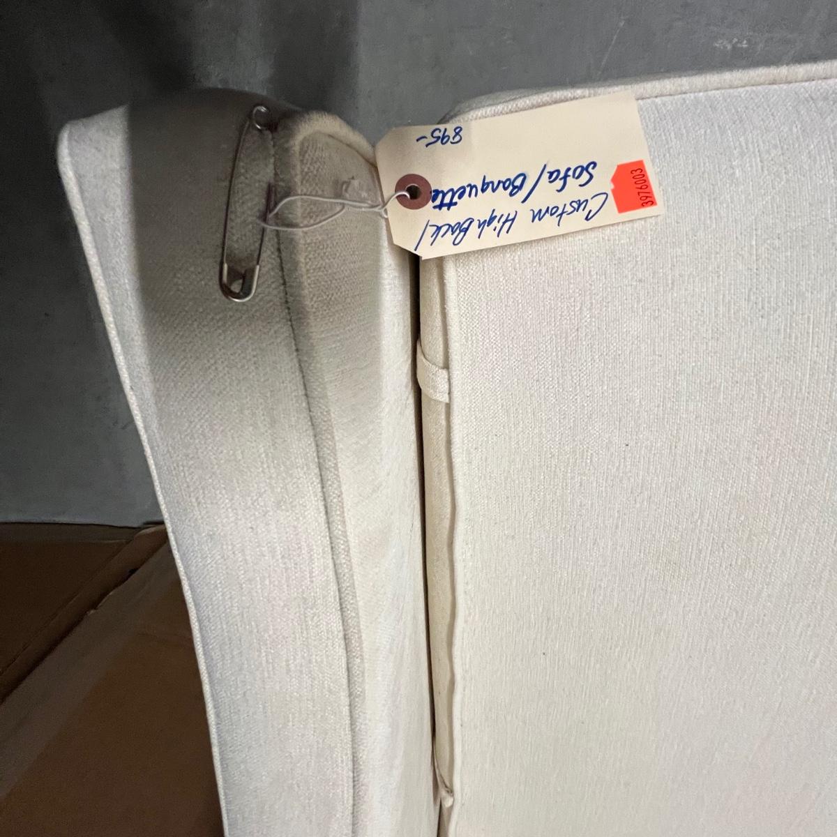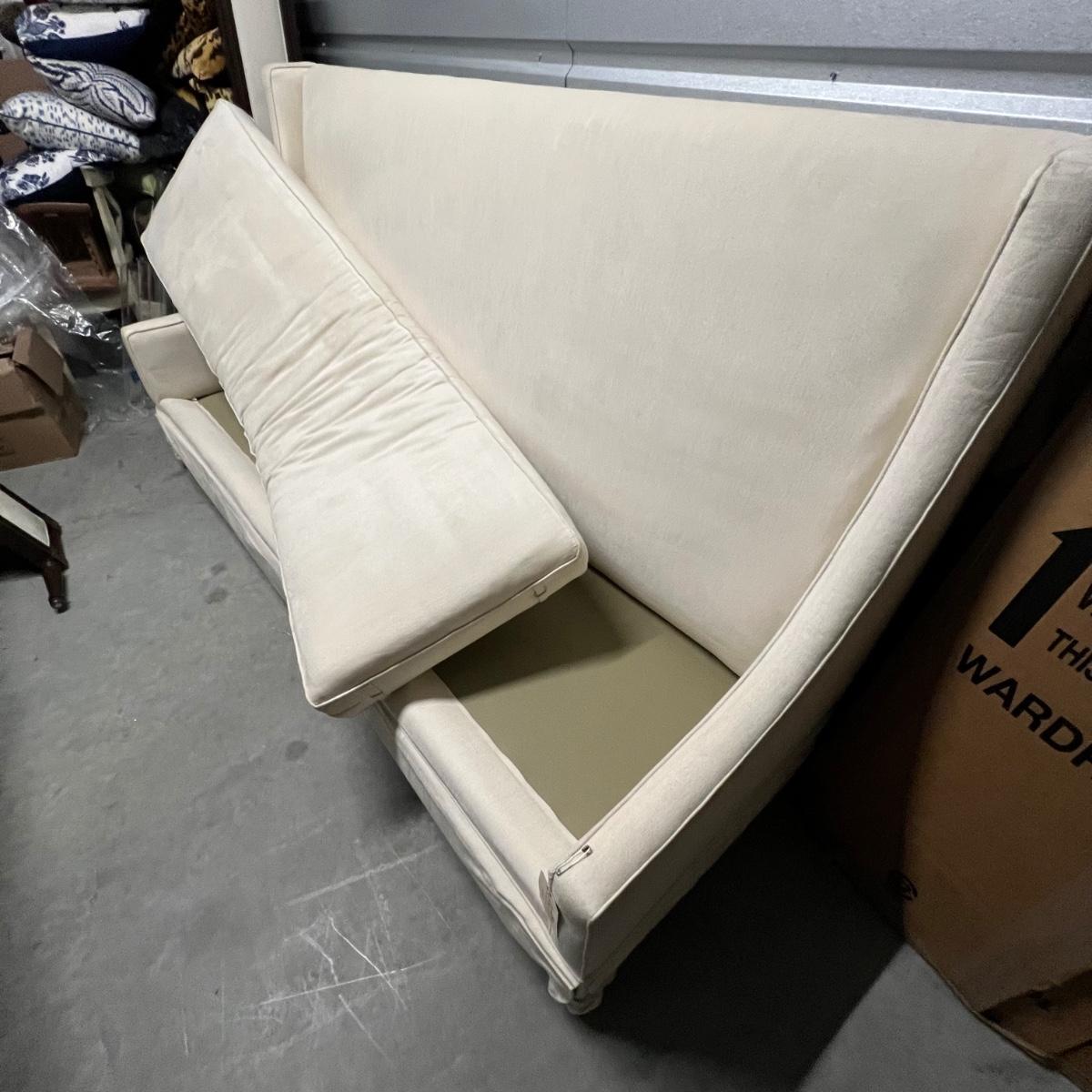 This high back sofa has a super soft cream upholstery. It was wrapped in plastic, which is why the fabric on the corners by the sofas feet is a little wrinkled. It has one long seat cushion which has a removable cover. No identifying marks found.