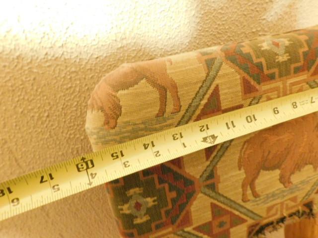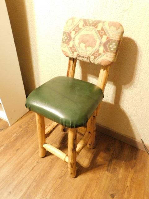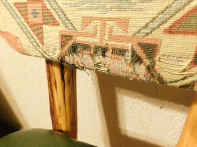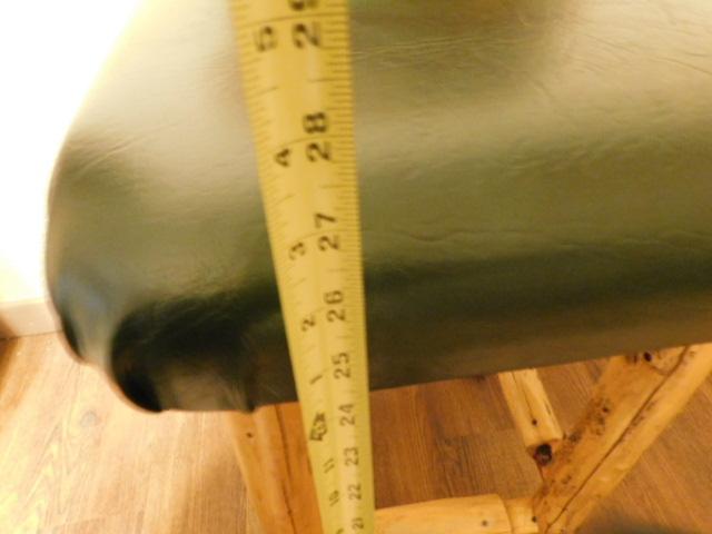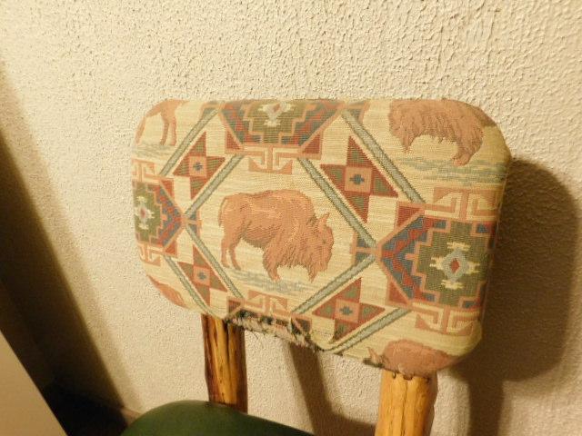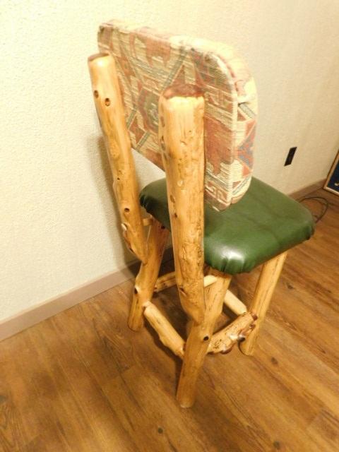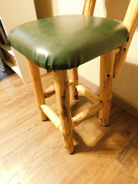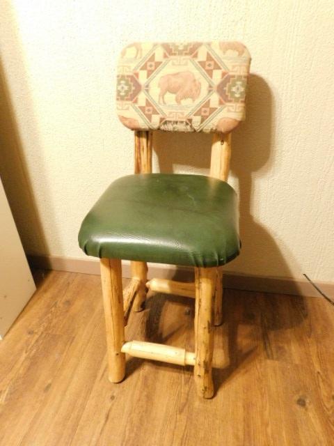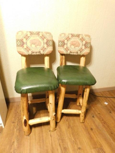 Custom Log Cabin Bar Stools with Buffalo Themed Upholstery Live Wood Log Frame 27" Seat Height lower portion of seat back is worn as shown