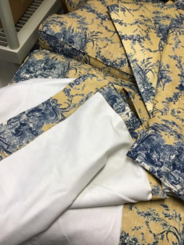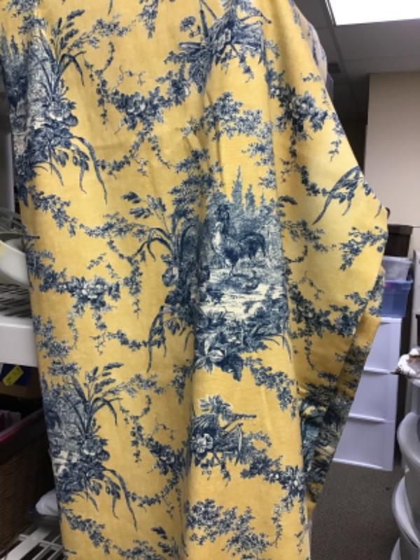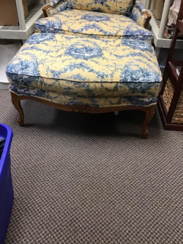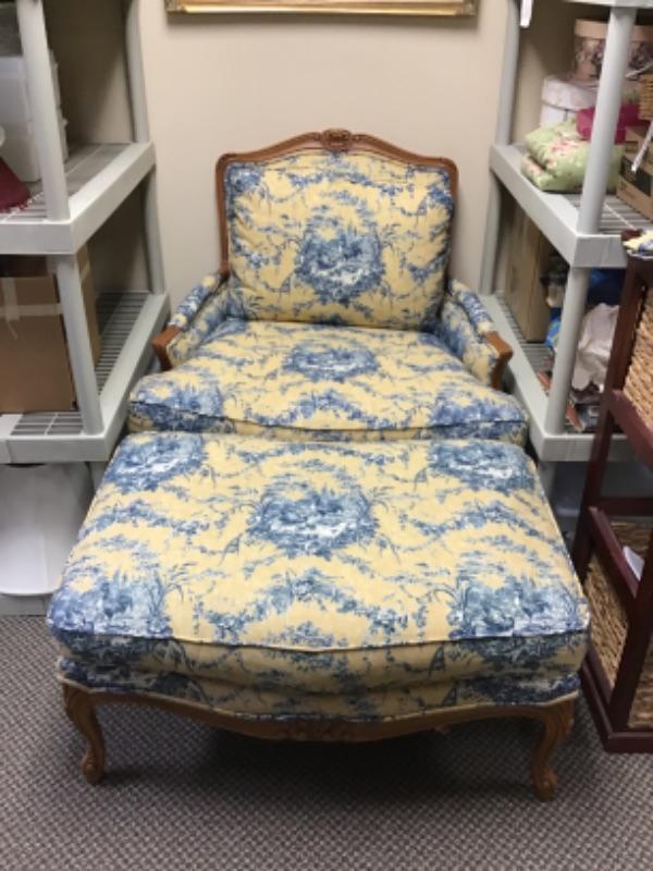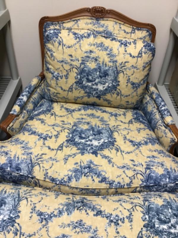 Blue and Yellow toile fabric. Chair and ottoman frame is mid 20th century.
