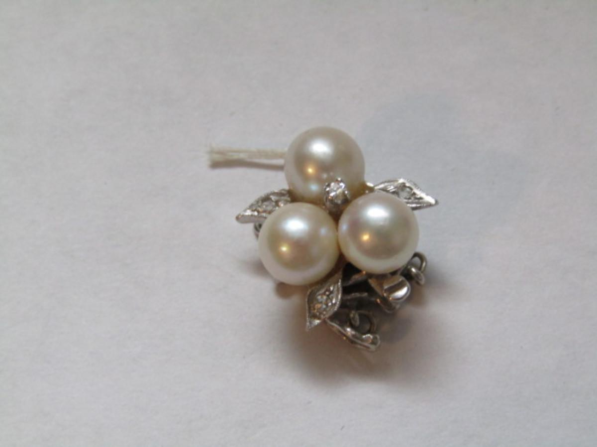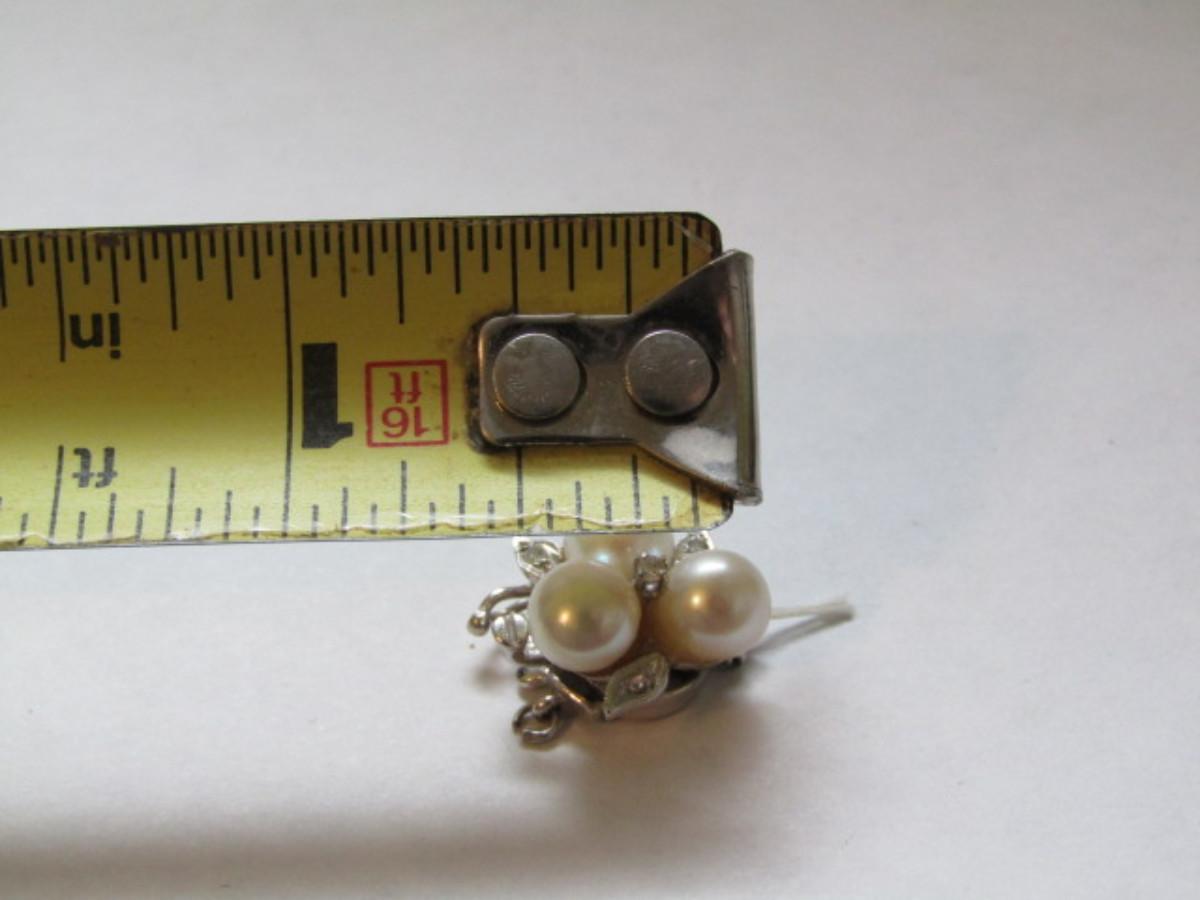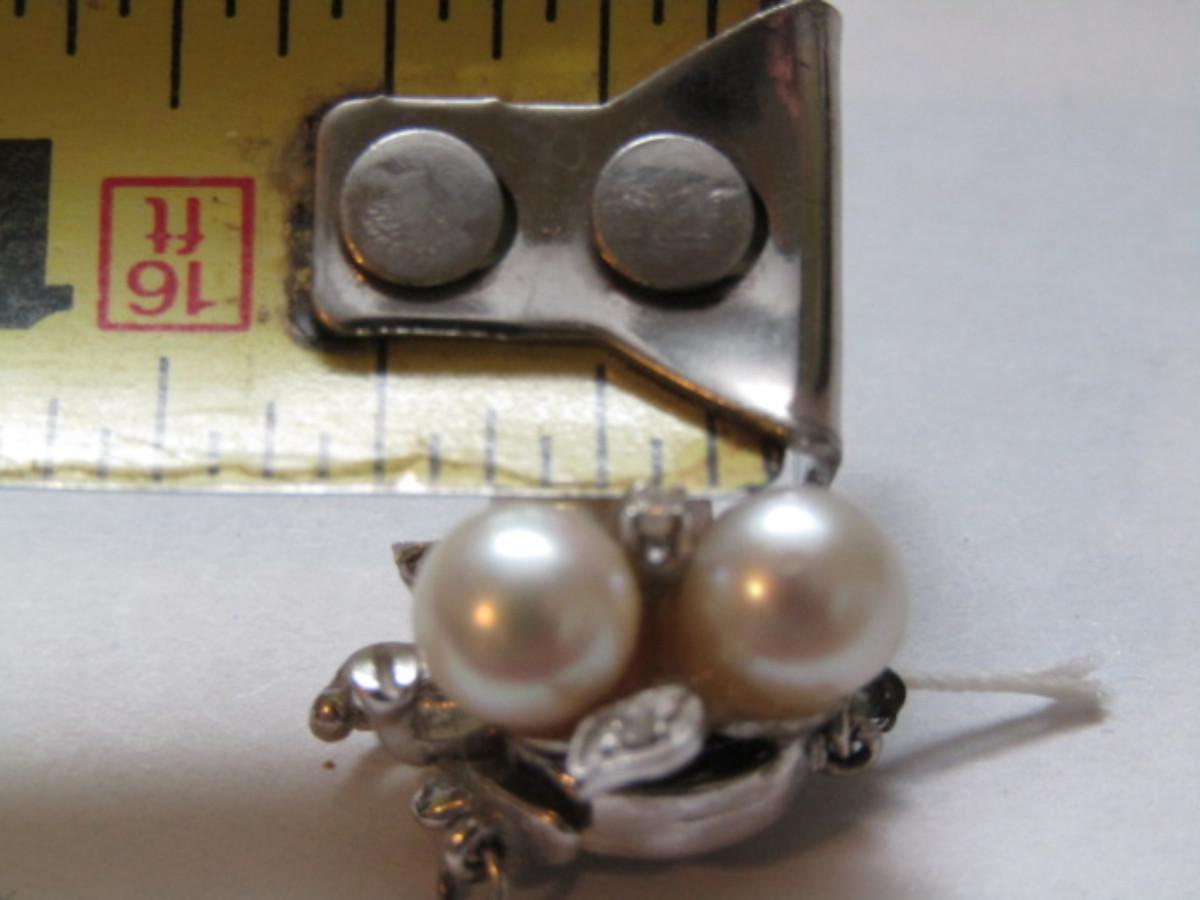 Custom Made Clasp- 14 Karat White Gold and Pearls with Diamond Accents. Pearls are approx 6mm in diameter. Total weight is approx 4 grams. All measurements are approximate.