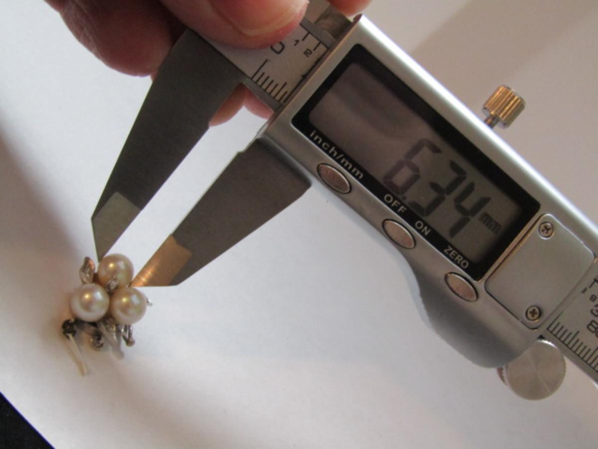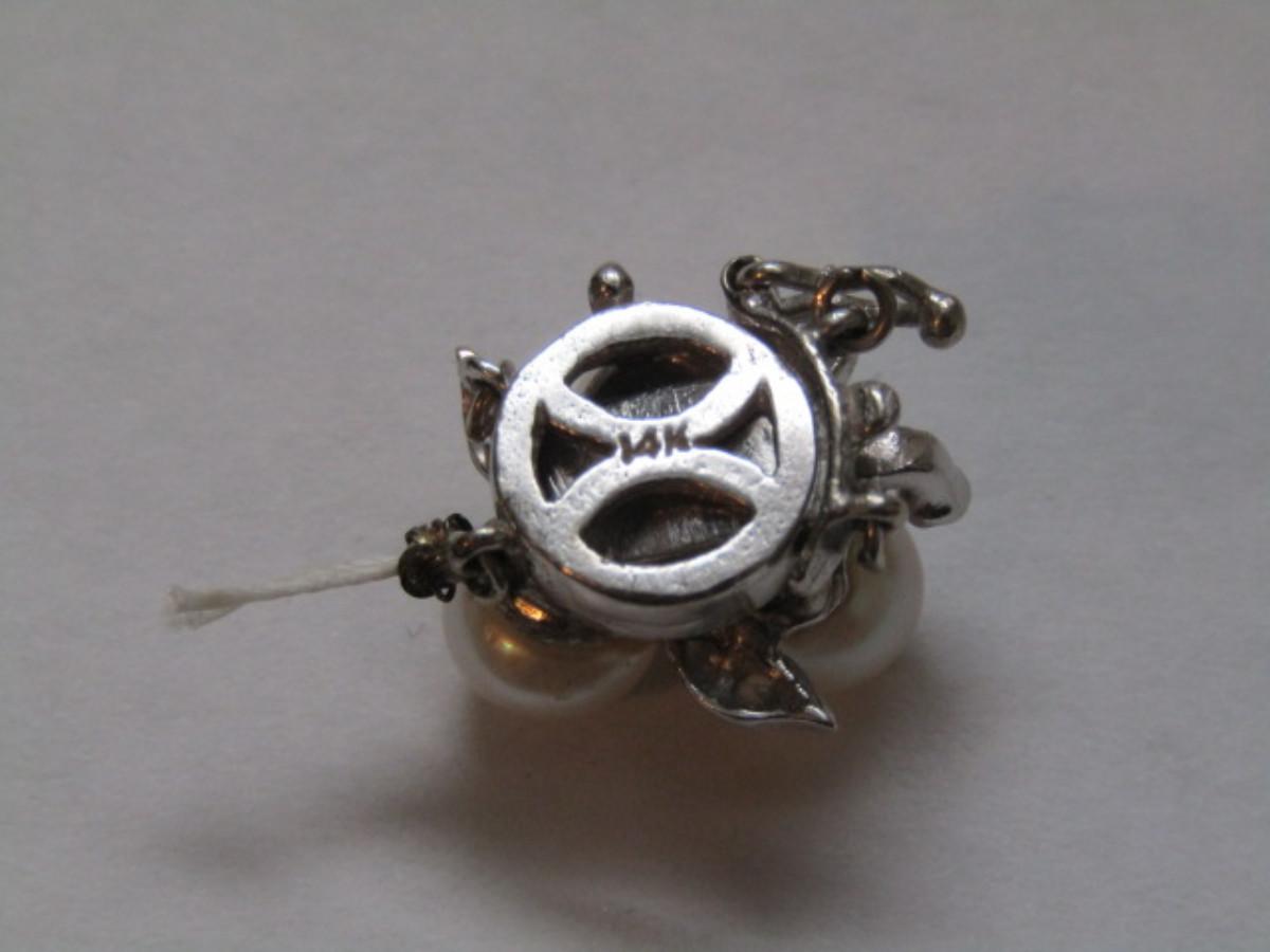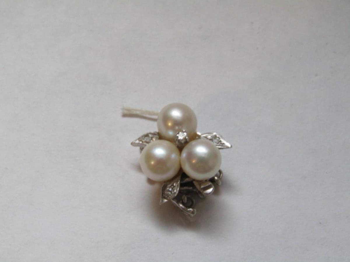 Custom Made Clasp- 14 Karat White Gold and Pearls with Diamond Accents. Pearls are approx 6mm in diameter. Total weight is approx 4 grams. All measurements are approximate.