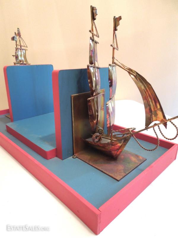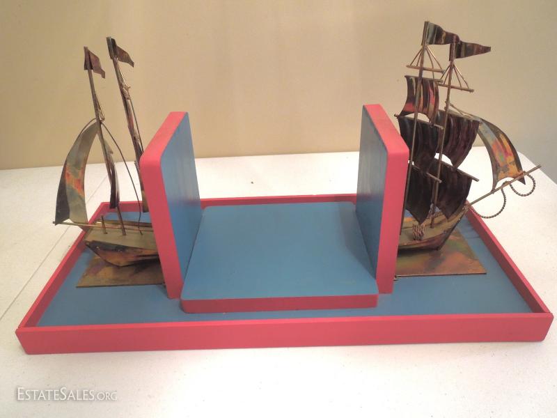 Painted wood base mounted with half of a copper ship on either end. Robert Ludlum novels. Bourne Supremecy is first edition.