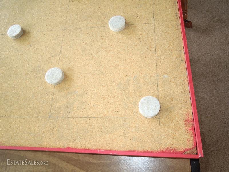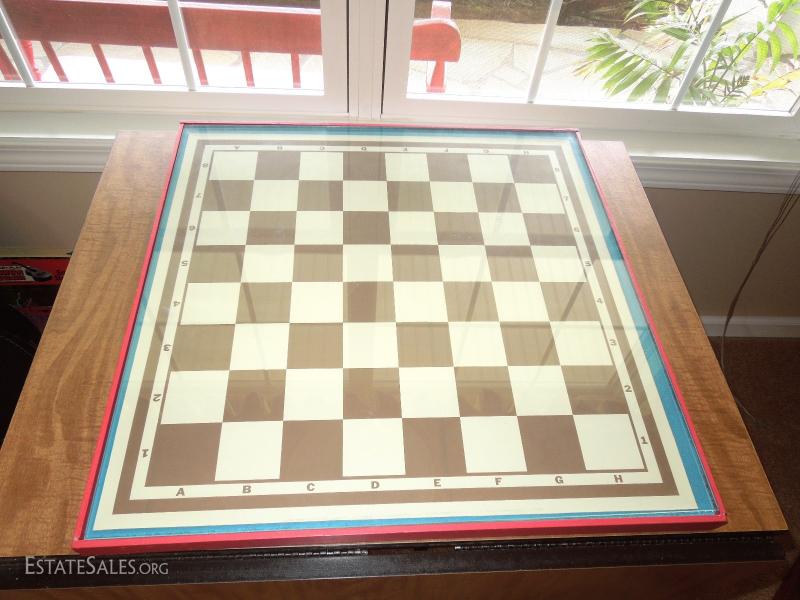 22x22x1. Trimmed in painted black, red and blue wood frame. Inlaid paper board not secured. Covered by removable glass. Can be used for other purposes as well. Felt pads on bottom. Very good condition.