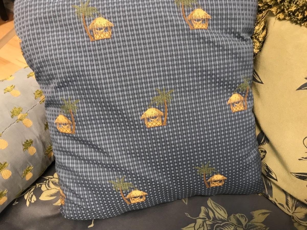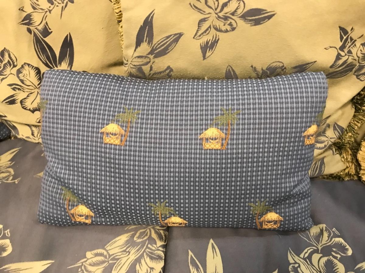2 blue pillows with tiki huts