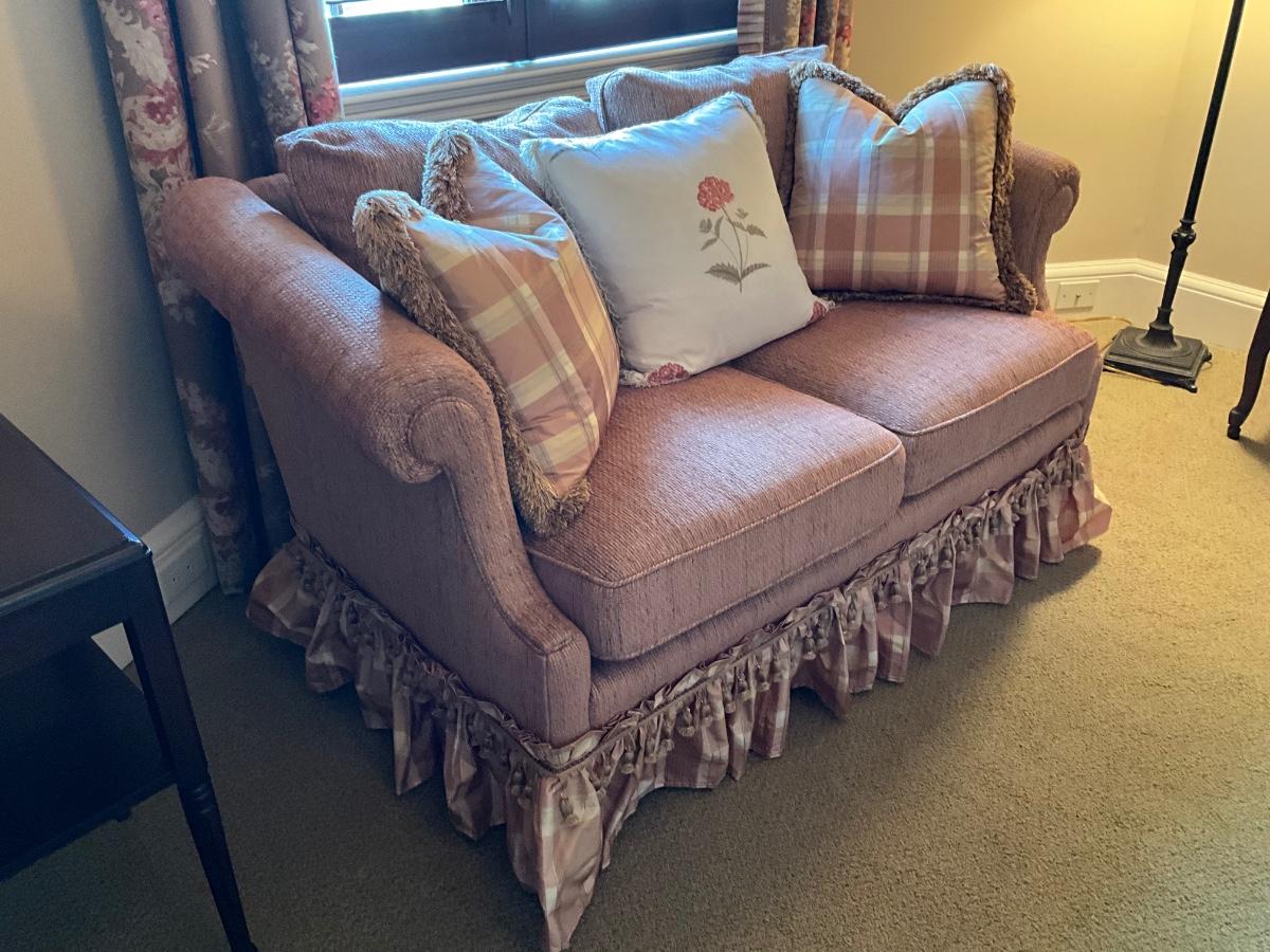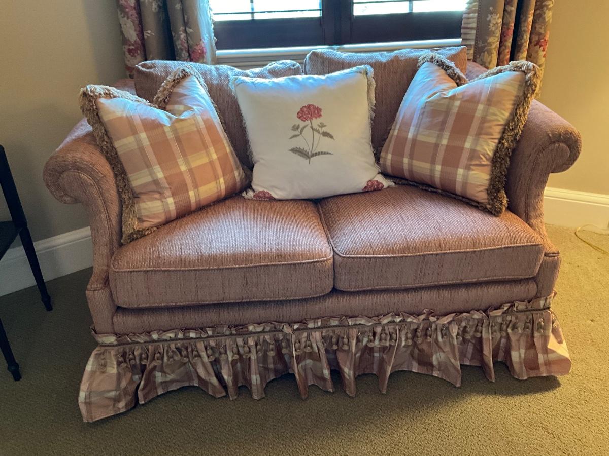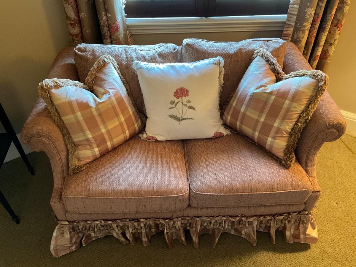 Pink colored loveseat is 37 inches wide, 32 inches deep, 32 inches tall. Seat depth is 20 inches, seat width is 43 inches, and it’s 20 inches from the floor to the seat- comes as seen in pictures