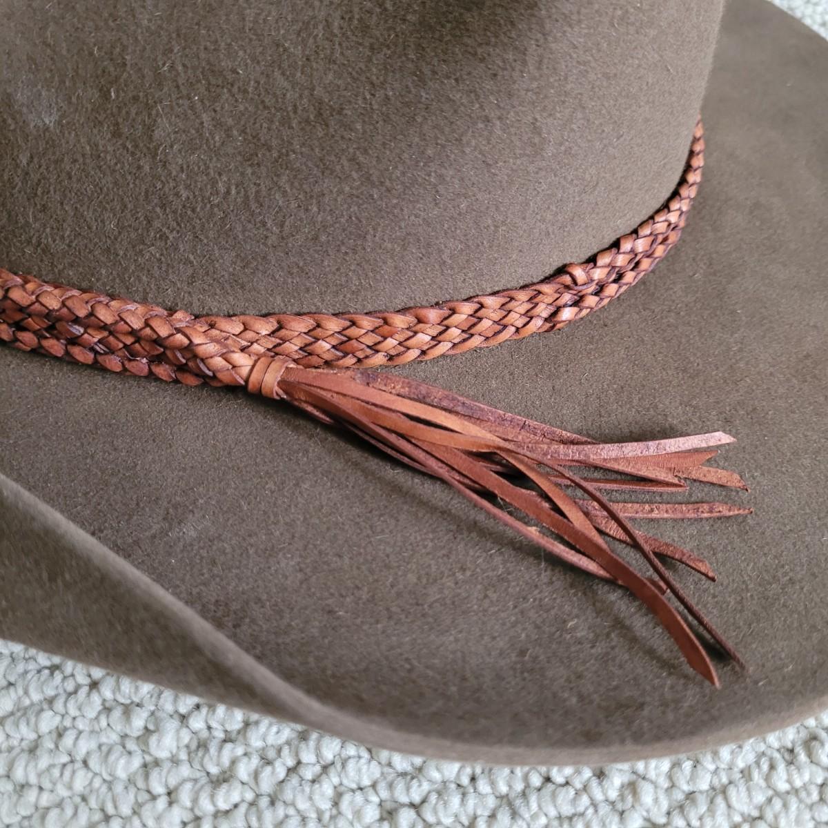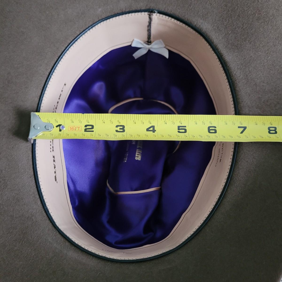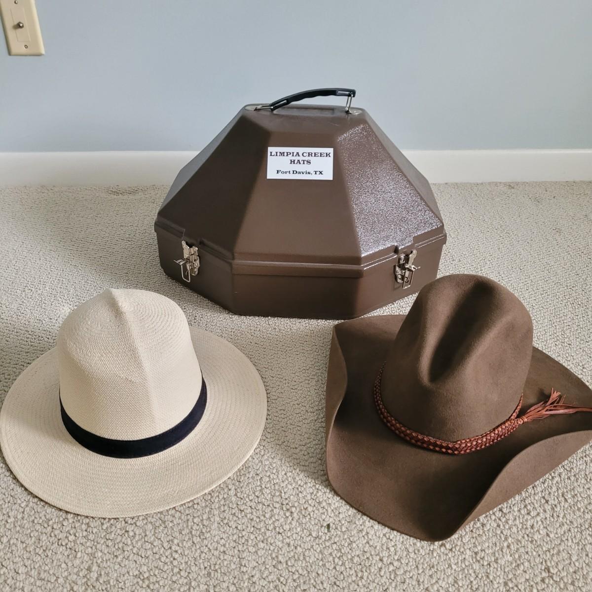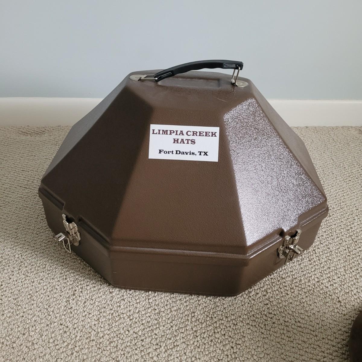 This lot of men's hats includes a custom made Stetson felt hat by Limpia Creek Hats with a hard plastic storage case, as well as a straw Salmagundi hat. Both hats appear to be XL Case measures approximately 19" x 14". Each hat’s opening measures 7”. Shipping available.
