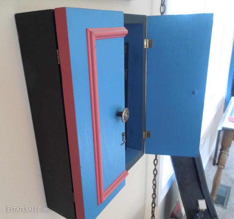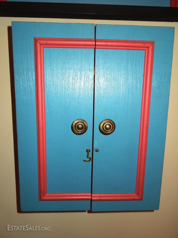 14 x 12 x4 painted wood cabinet holds a removable book, but can be used for many purposes. Metal knob and latch. Mounts directly to wall. No scratches. Book included.