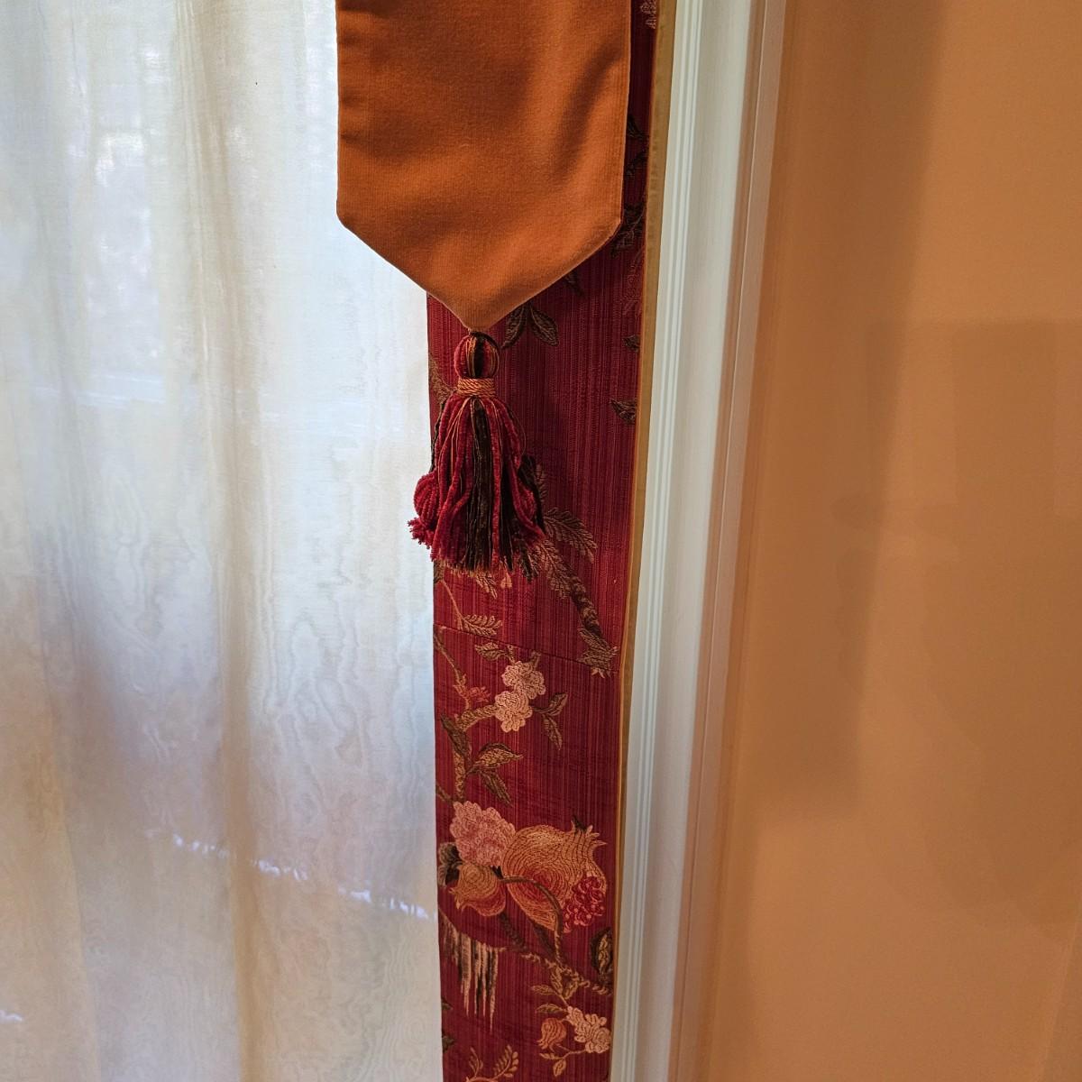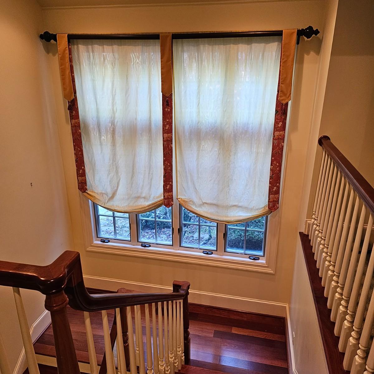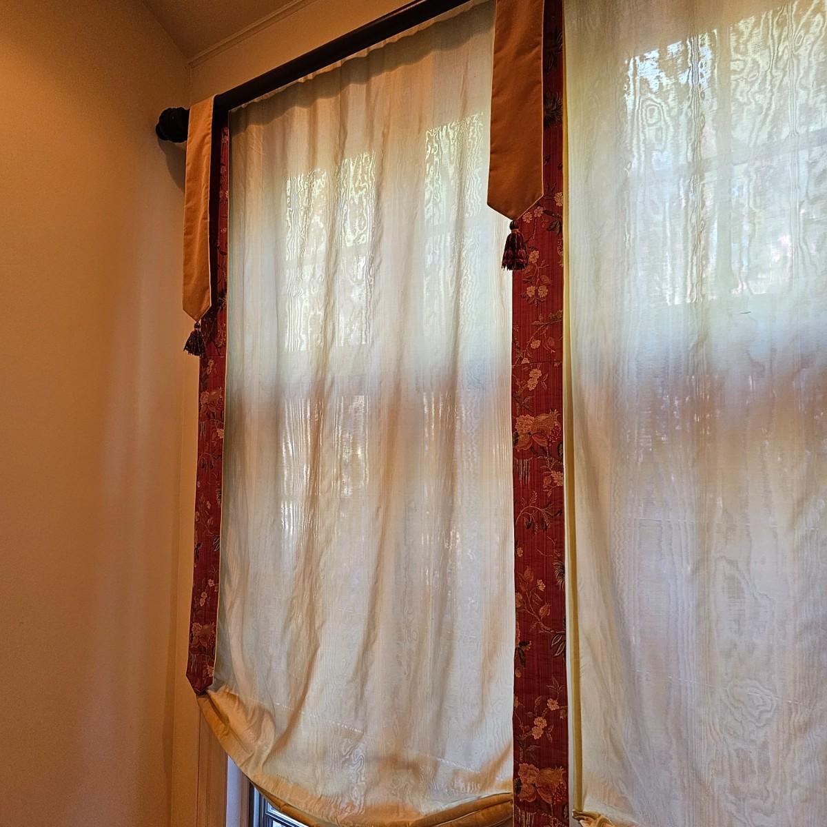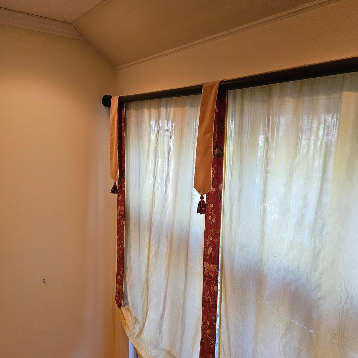 Large open window area with double panel drapes and hanging panels. Cream colored patterned drop panels with gathered bottoms, also three contrasting color ribbon panels with tassels. Each cream panel measures 46" x 84" and span a total of 100". The dark stained wood hanging rod is approximately 106" to 108". Winning bidder will need to bring tools, both Phillips and standard screwdrivers and at least a 10' stepladder or an extension ladder to remove the items. See photos for details. Local pickup only.