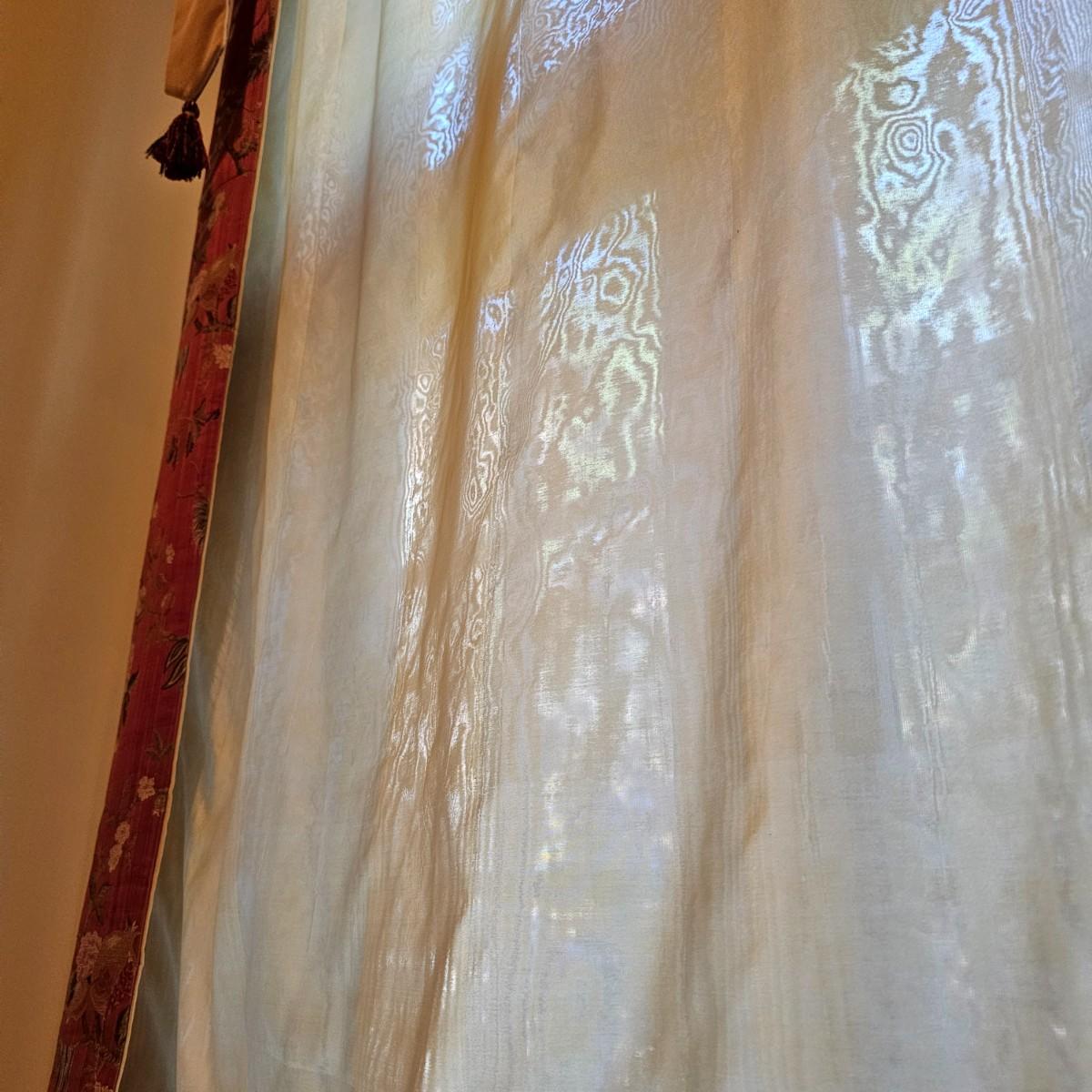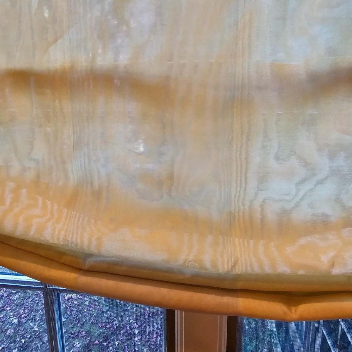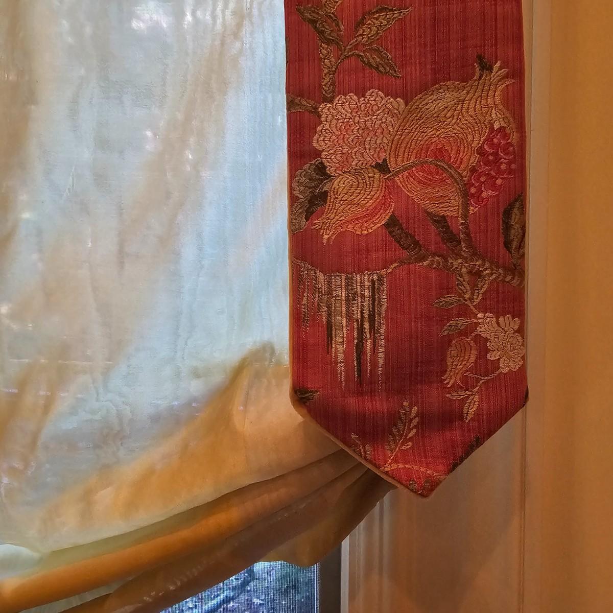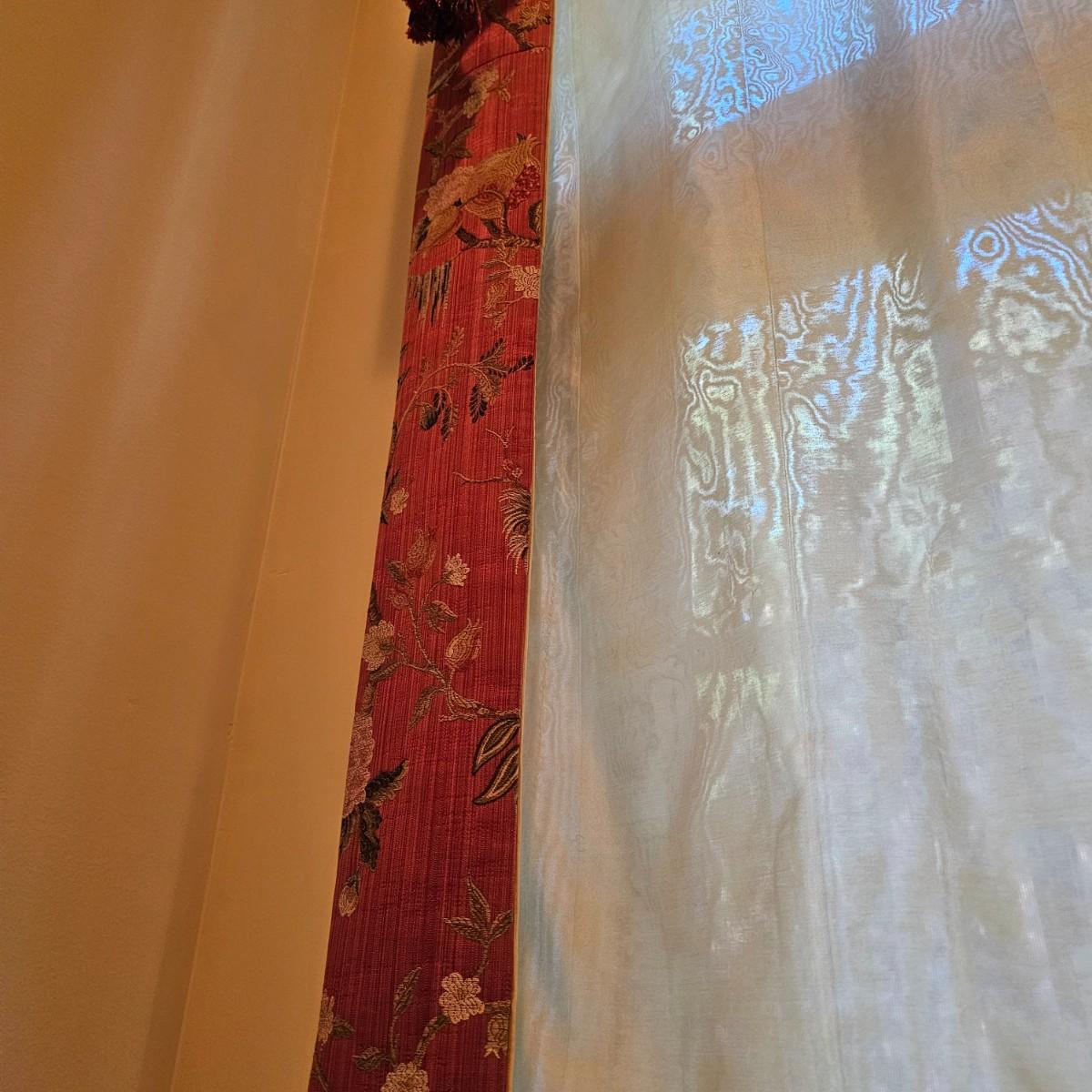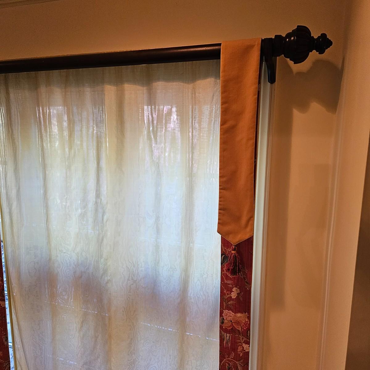 Large open window area with double panel drapes and hanging panels. Cream colored patterned drop panels with gathered bottoms, also three contrasting color ribbon panels with tassels. Each cream panel measures 46" x 84" and span a total of 100". The dark stained wood hanging rod is approximately 106" to 108". Winning bidder will need to bring tools, both Phillips and standard screwdrivers and at least a 10' stepladder or an extension ladder to remove the items. See photos for details. Local pickup only.