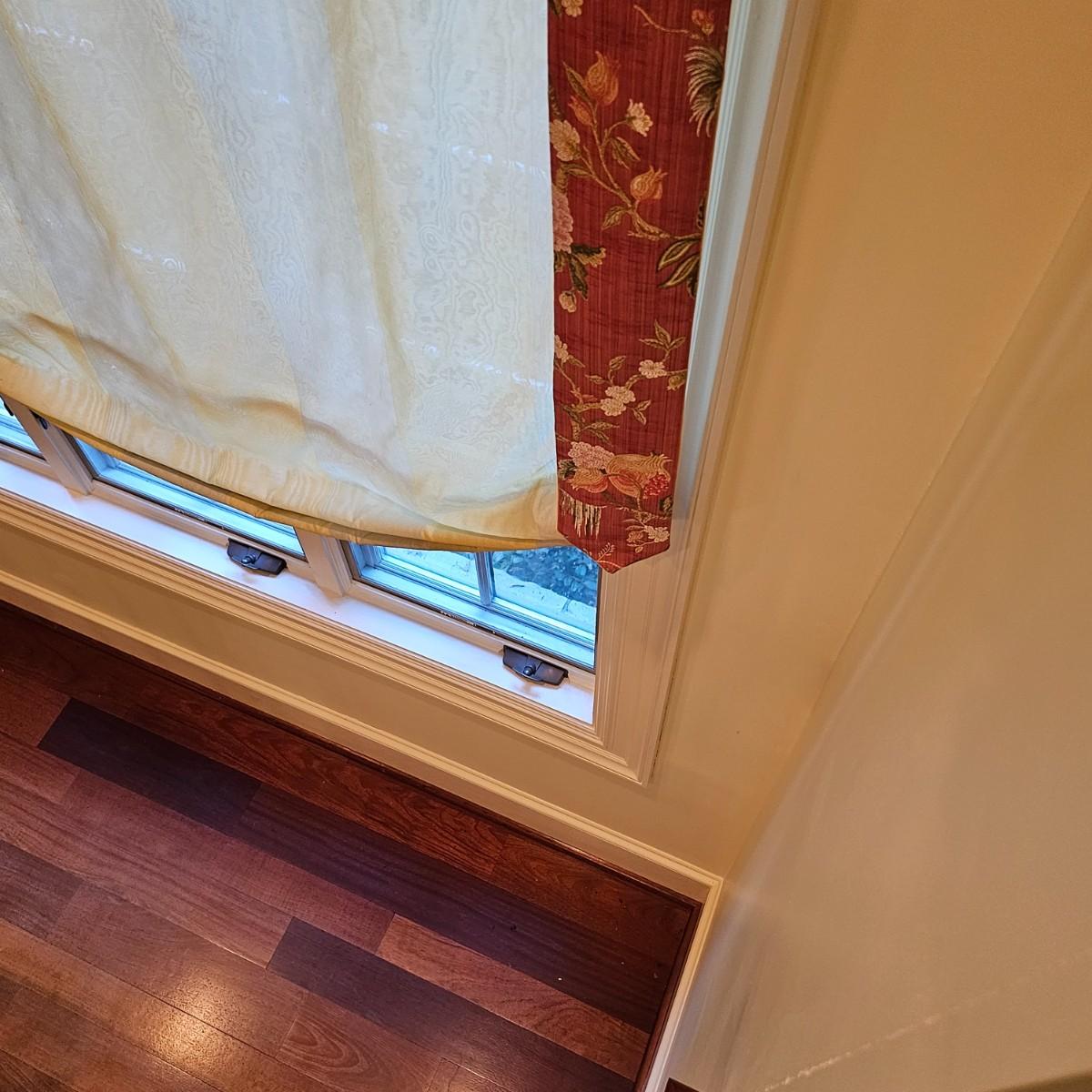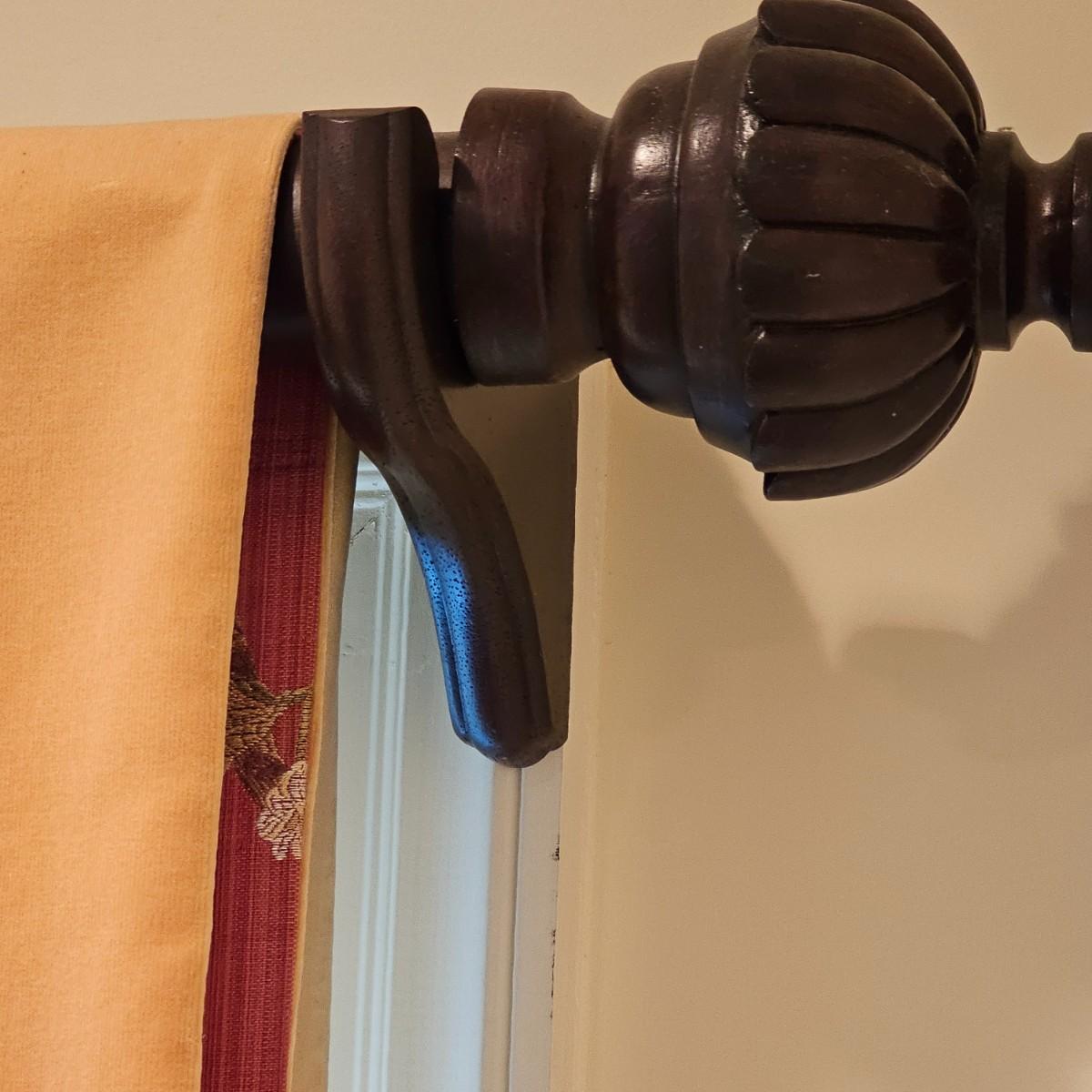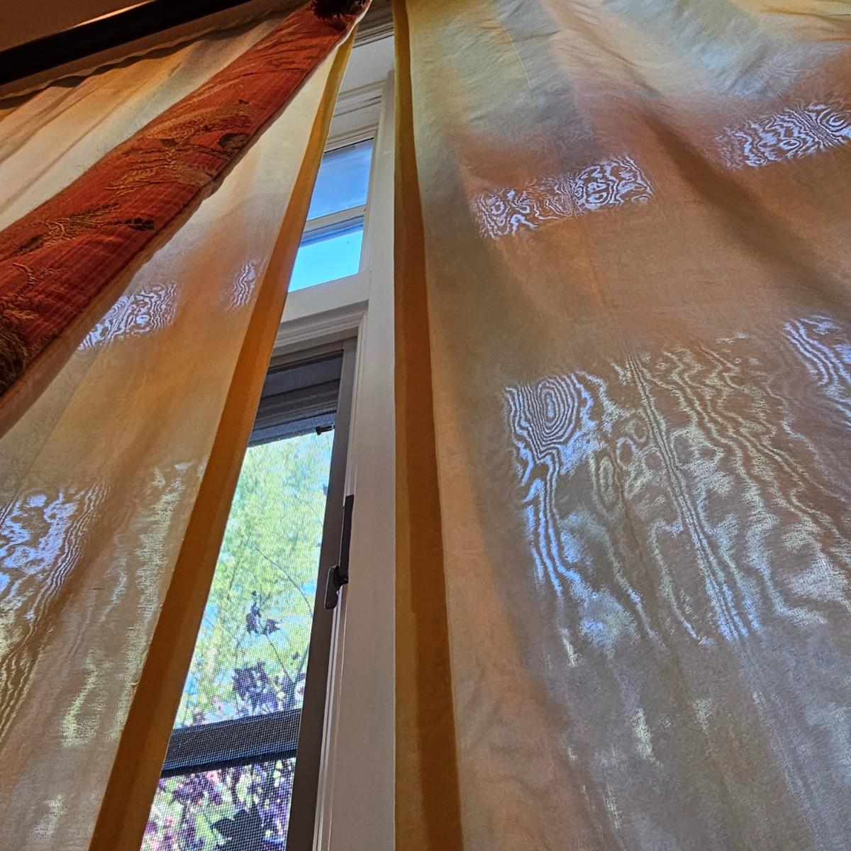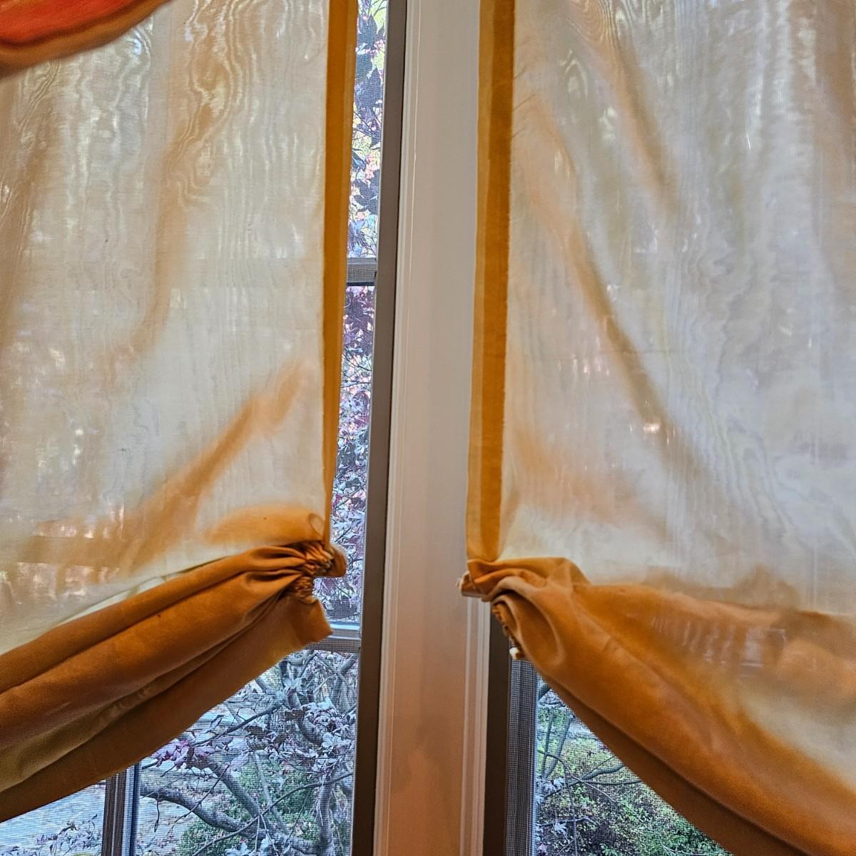 Large open window area with double panel drapes and hanging panels. Cream colored patterned drop panels with gathered bottoms, also three contrasting color ribbon panels with tassels. Each cream panel measures 46" x 84" and span a total of 100". The dark stained wood hanging rod is approximately 106" to 108". Winning bidder will need to bring tools, both Phillips and standard screwdrivers and at least a 10' stepladder or an extension ladder to remove the items. See photos for details. Local pickup only.