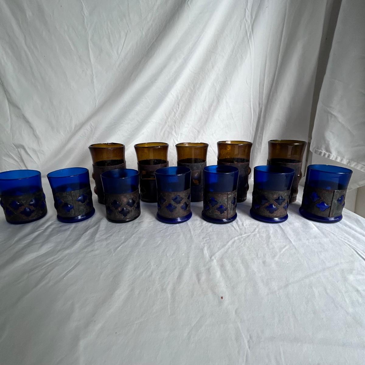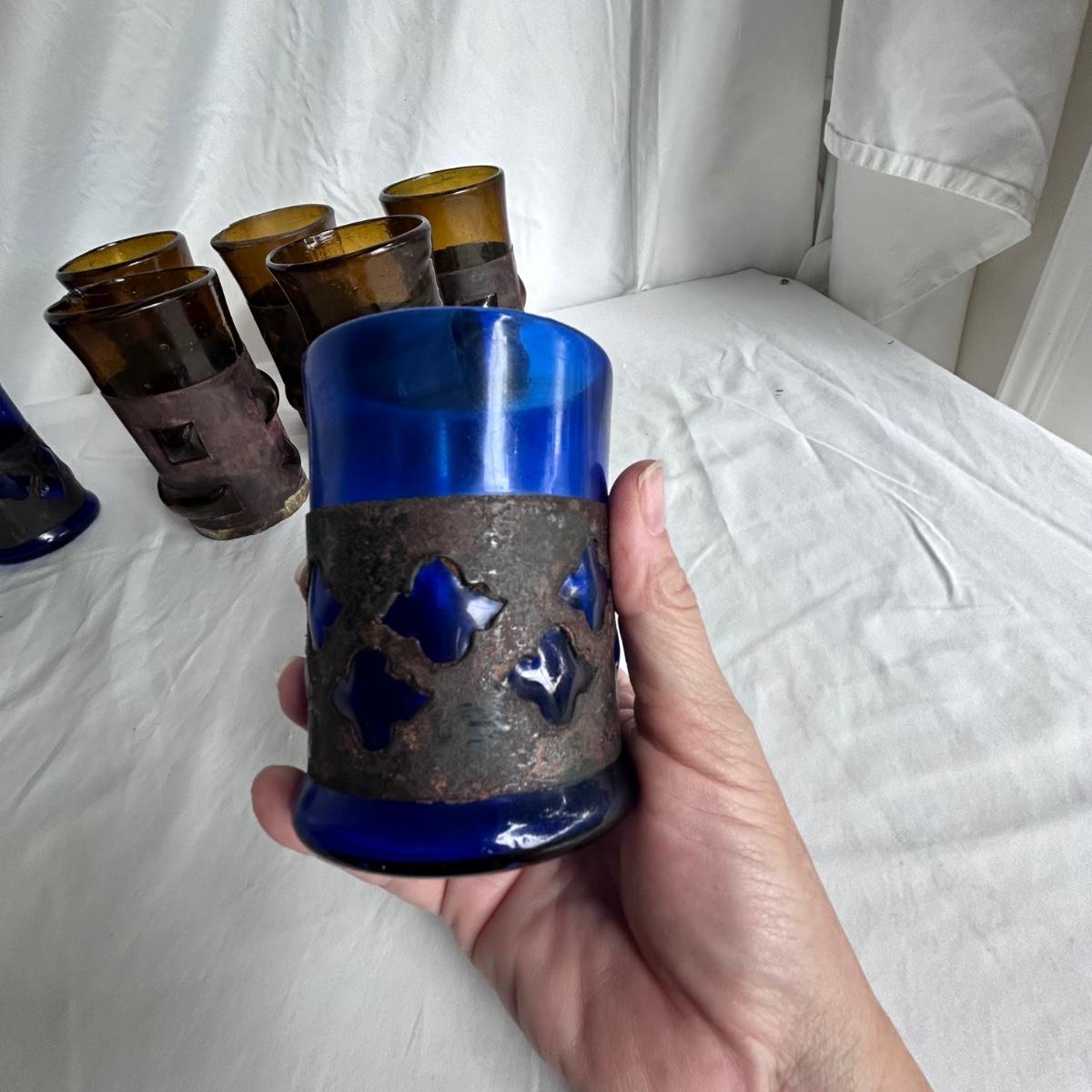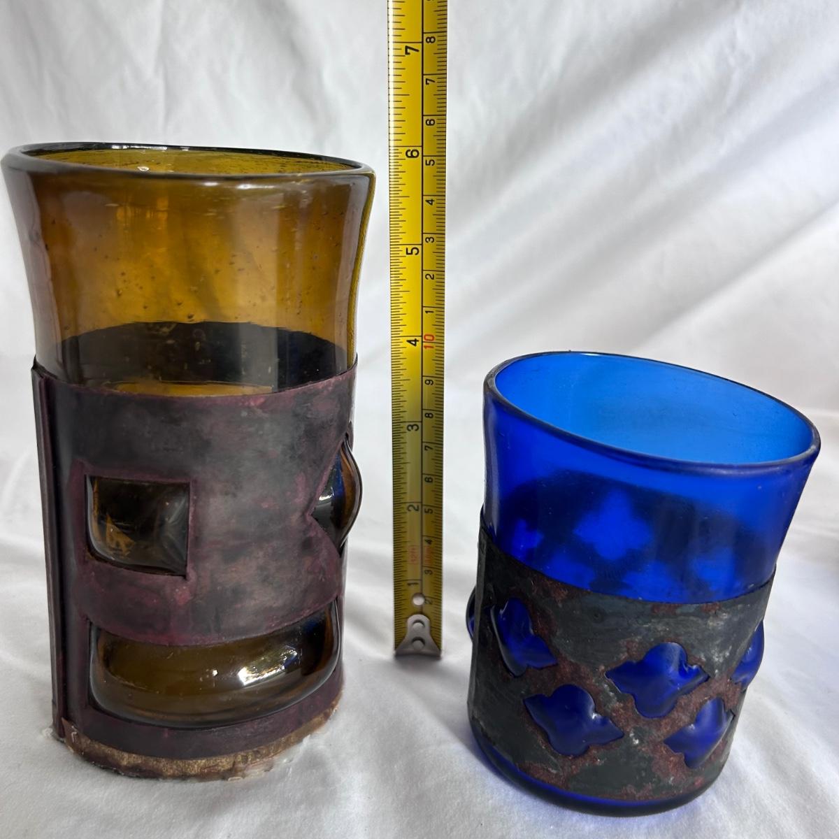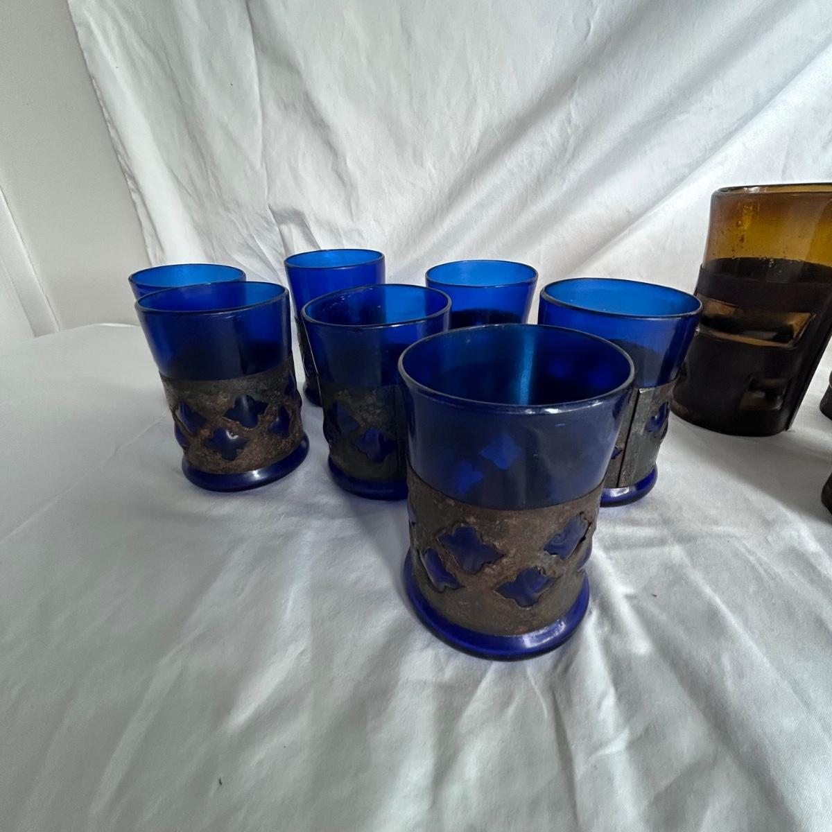 Seven blue glass blown drinking glasses with metal wrappings. The glass bubbles through the metal. Lot also contains five amber blown glass with metal wrappings made the same way but are hollow for candles or other objects. Shipping available.