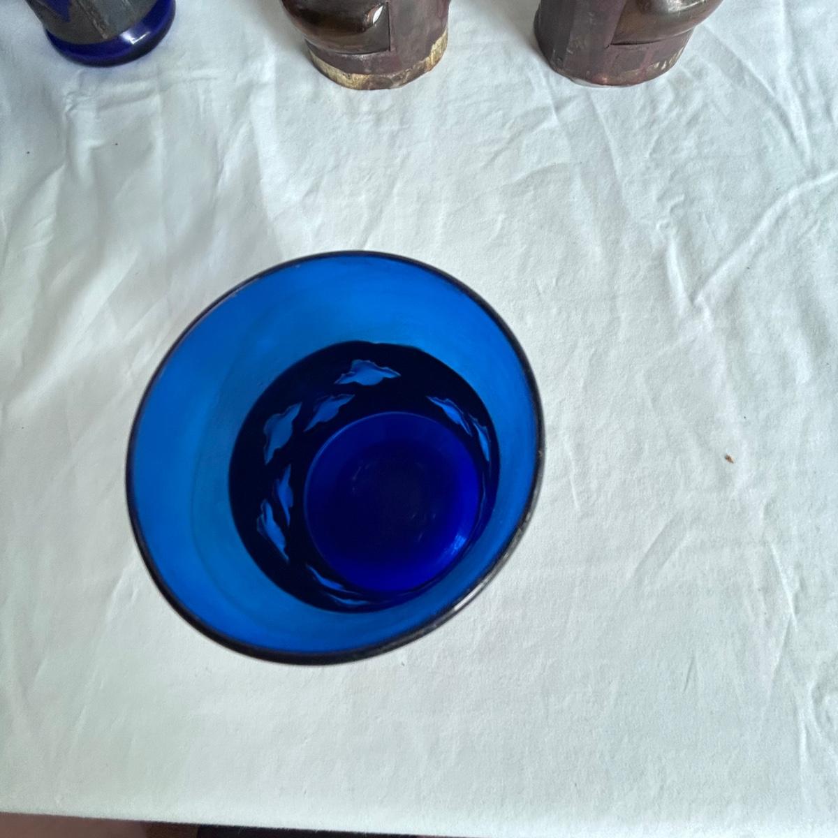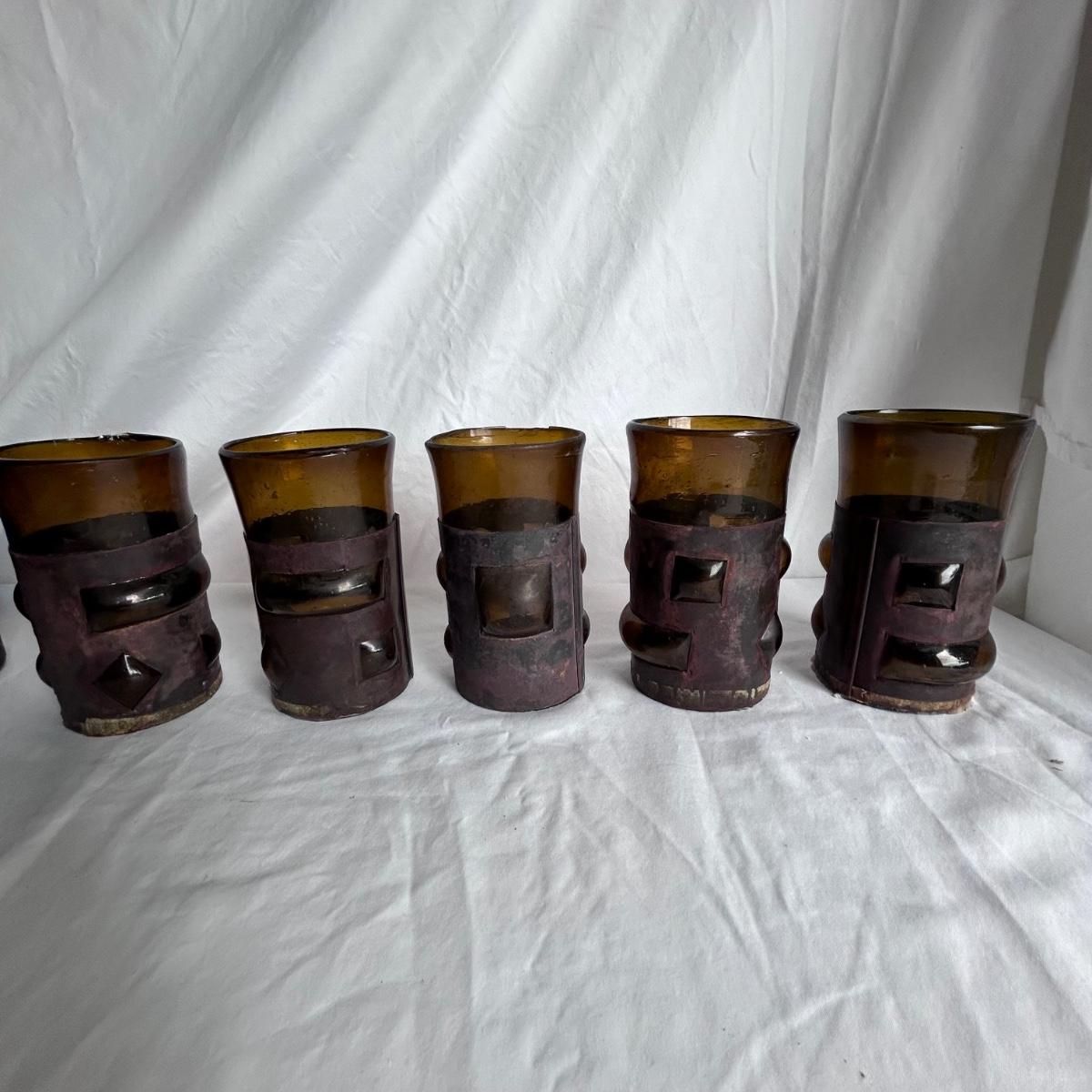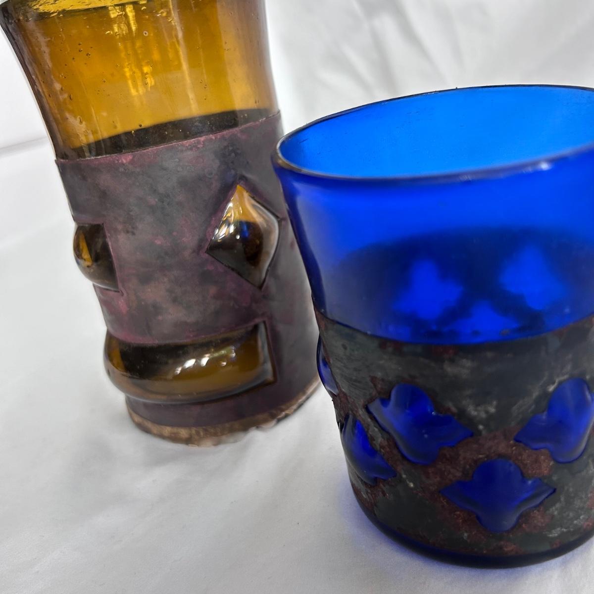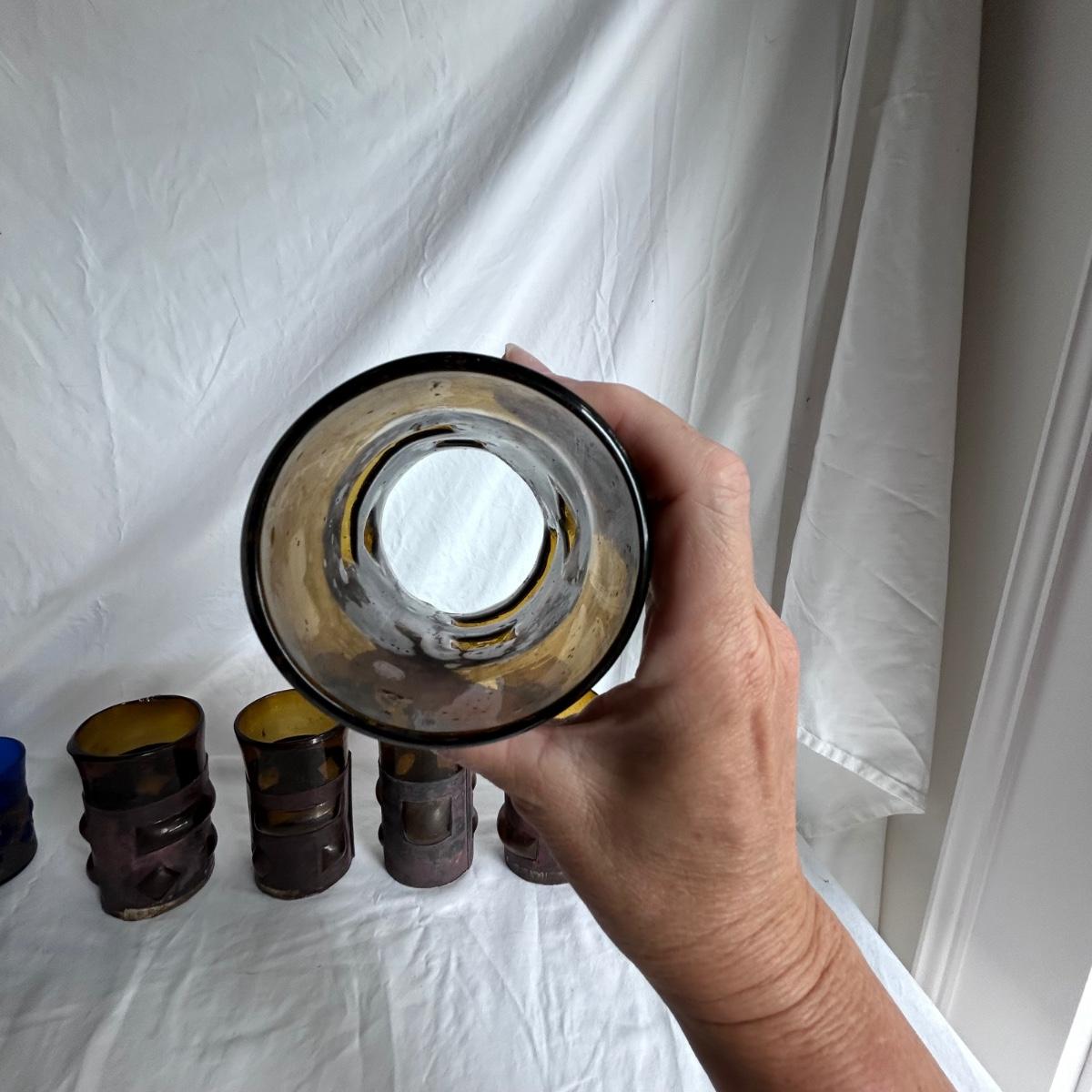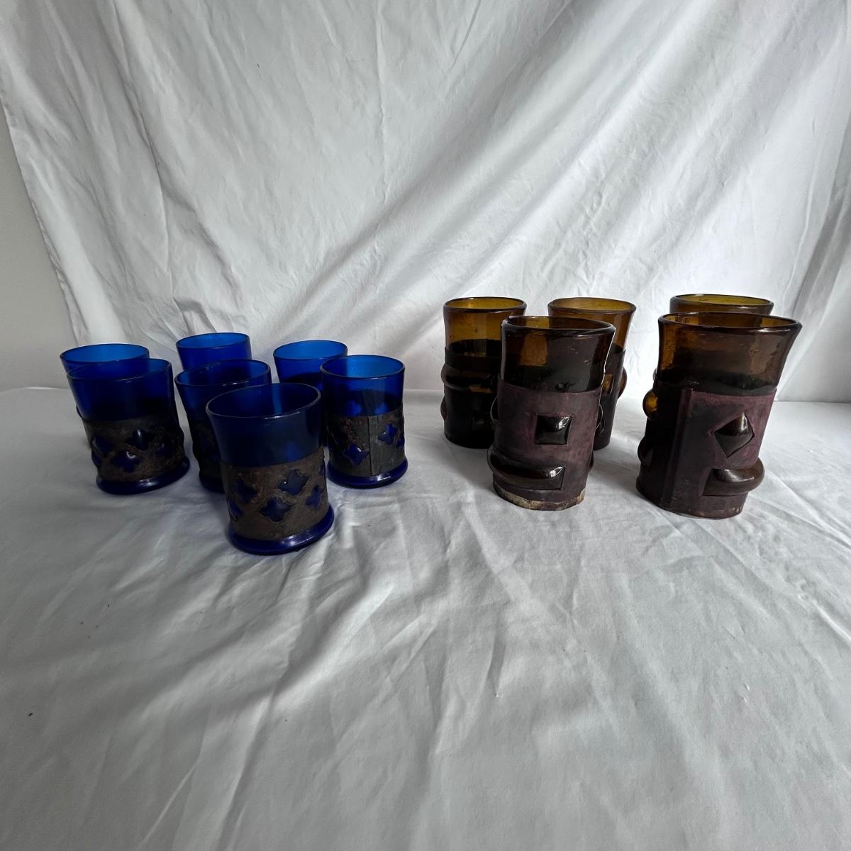 Seven blue glass blown drinking glasses with metal wrappings. The glass bubbles through the metal. Lot also contains five amber blown glass with metal wrappings made the same way but are hollow for candles or other objects. Shipping available.