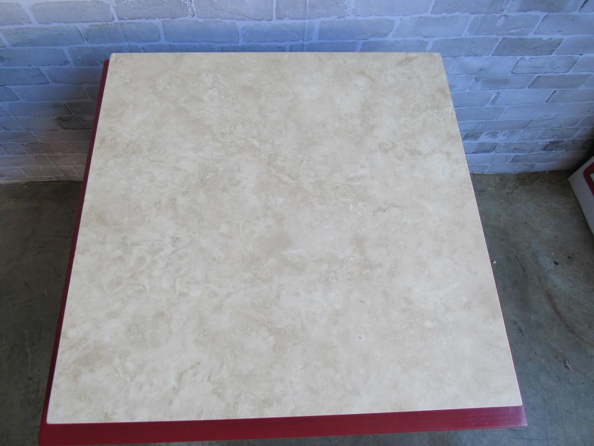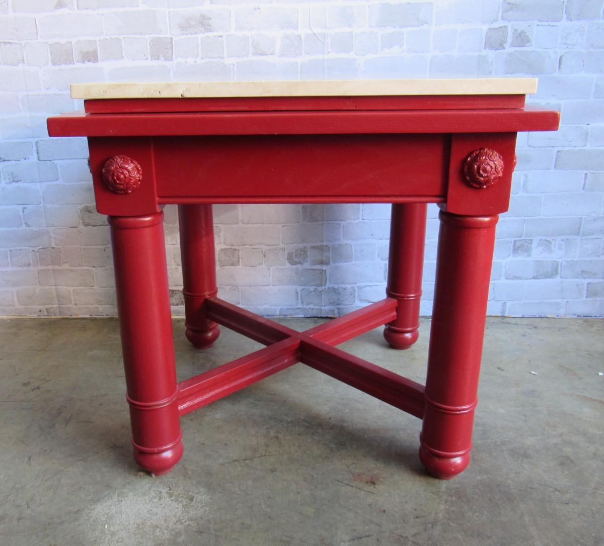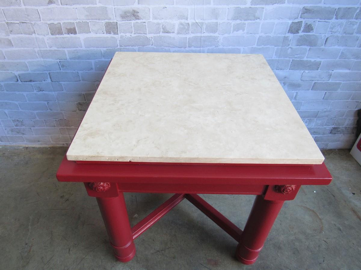 Table was custom painted with rosette accents and travertine top, which is removable. Very good condition showing little signs of wear consistent with age and use. 26" square table 25 1/2" tall.