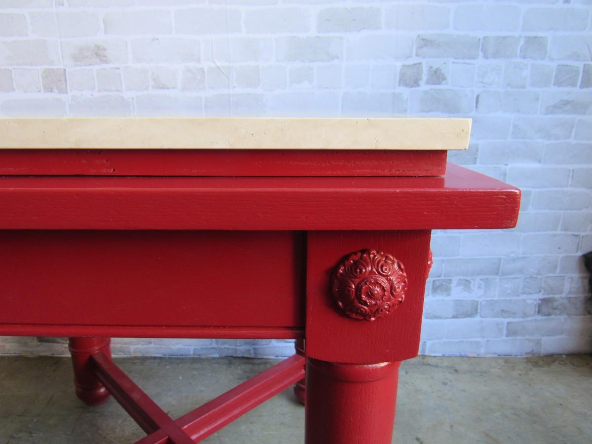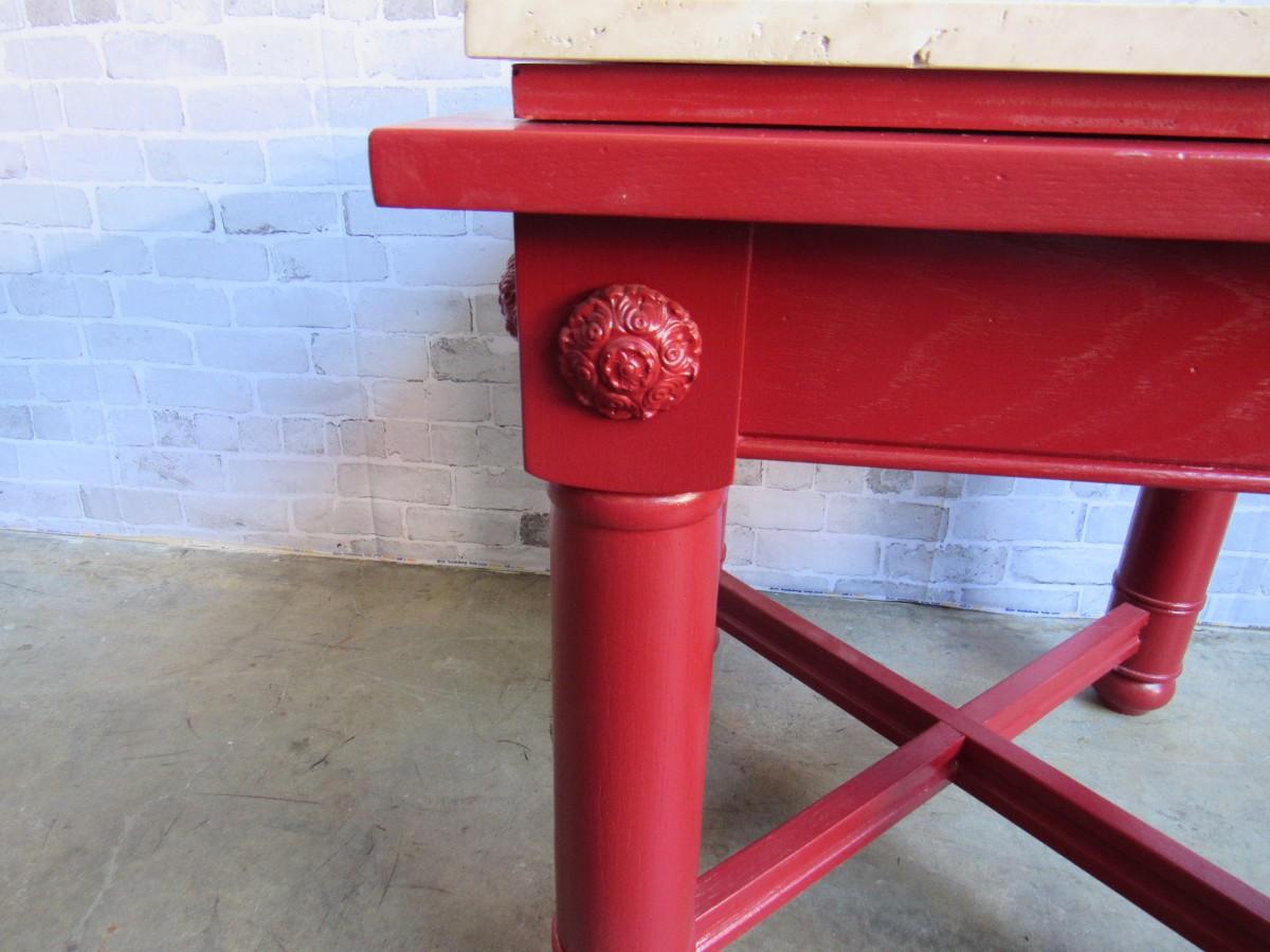 Table was custom painted with rosette accents and travertine top, which is removable. Very good condition showing little signs of wear consistent with age and use. 26" square table 25 1/2" tall.