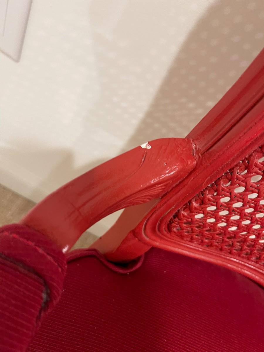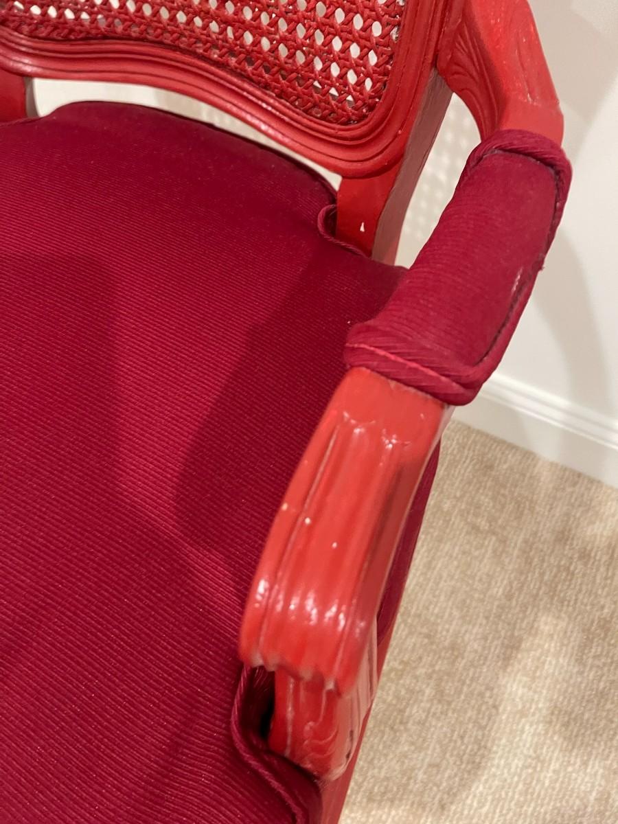 Custom upcycled cane chair with red custom upholstery. Chair has a couple chips. Upholstery is pristine. 19" wide x 22 1/2" deep x 38 3/4" high. # 1383