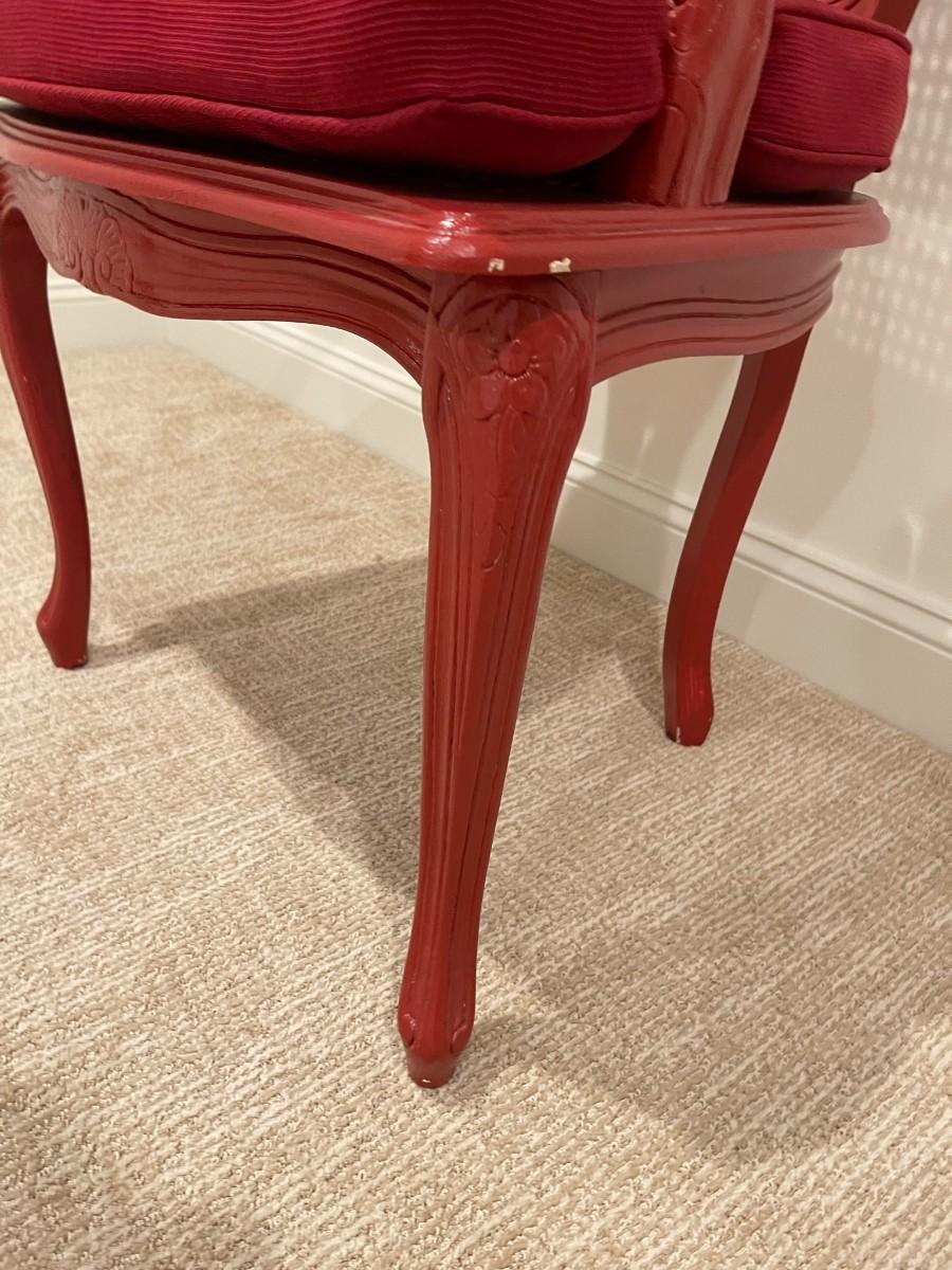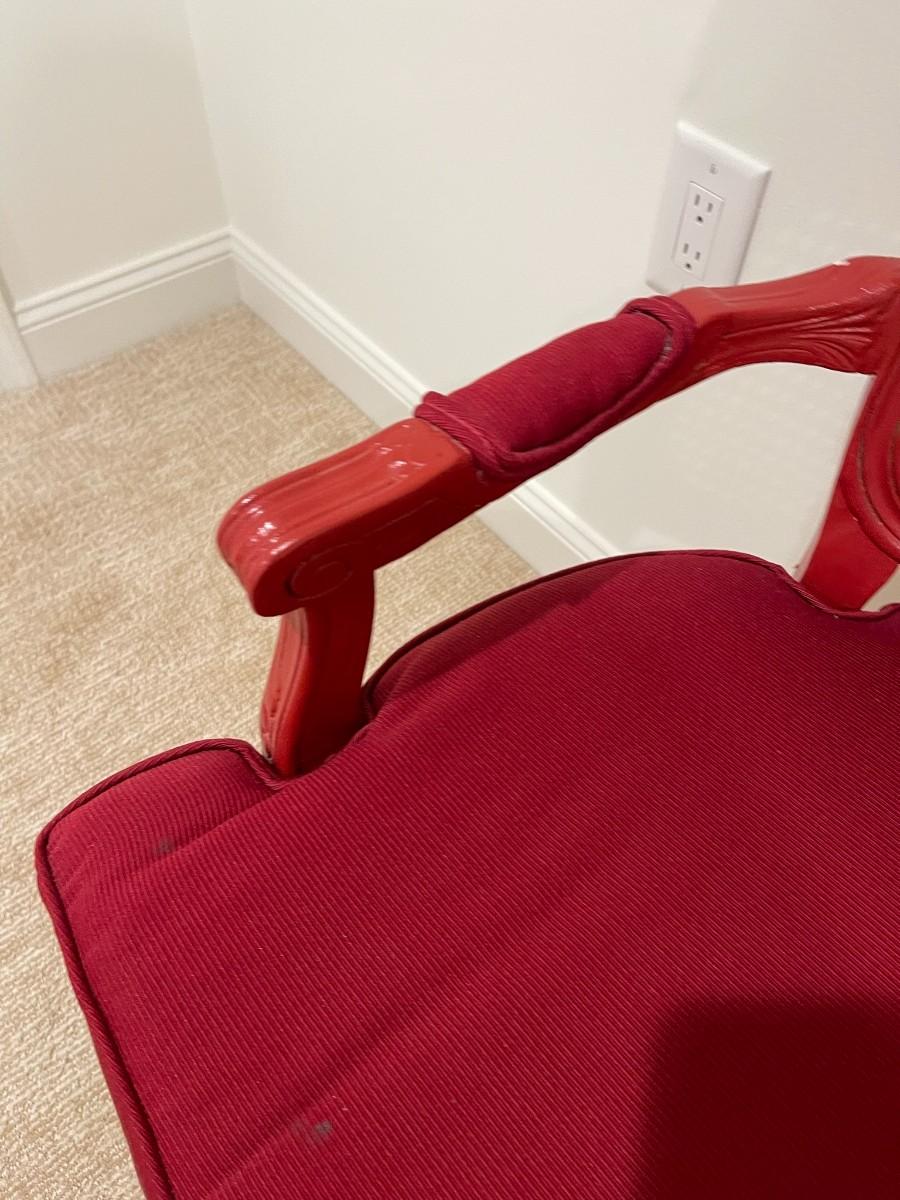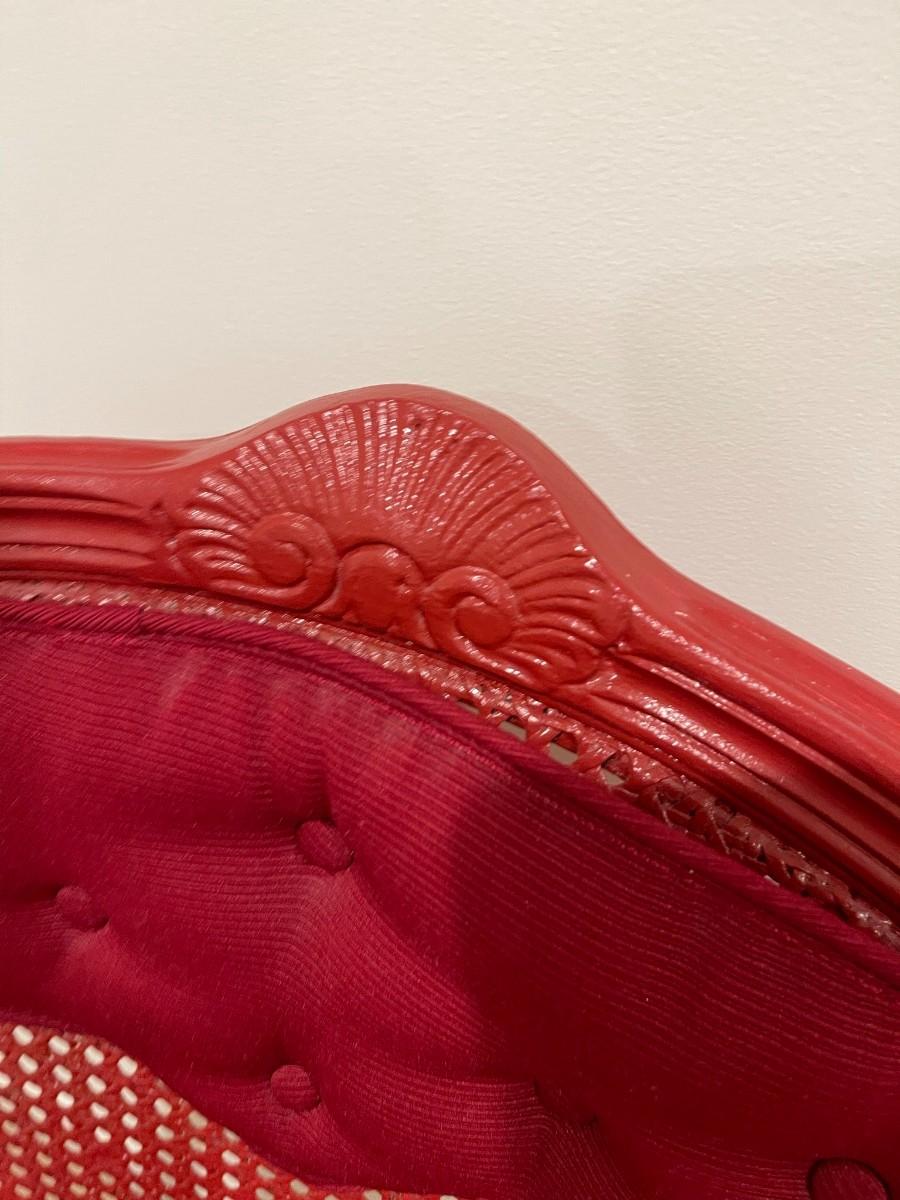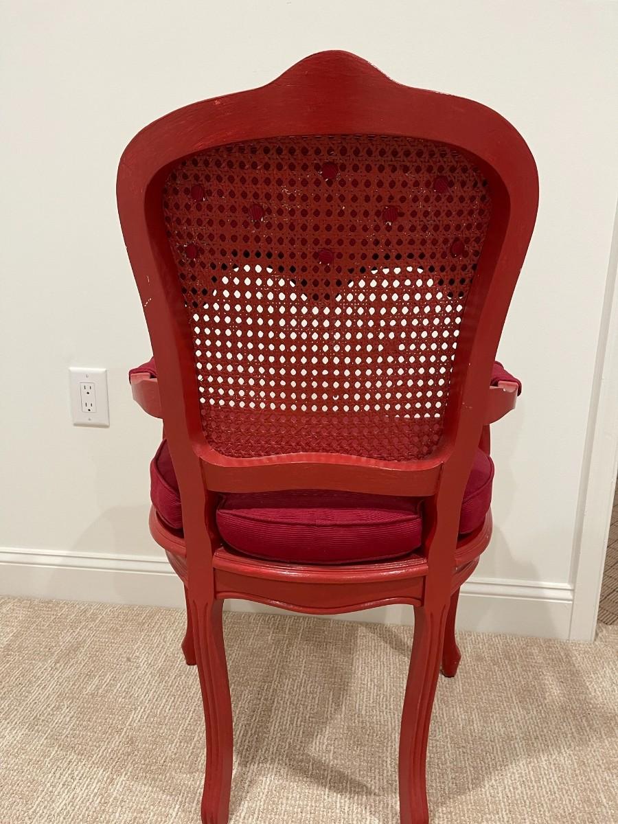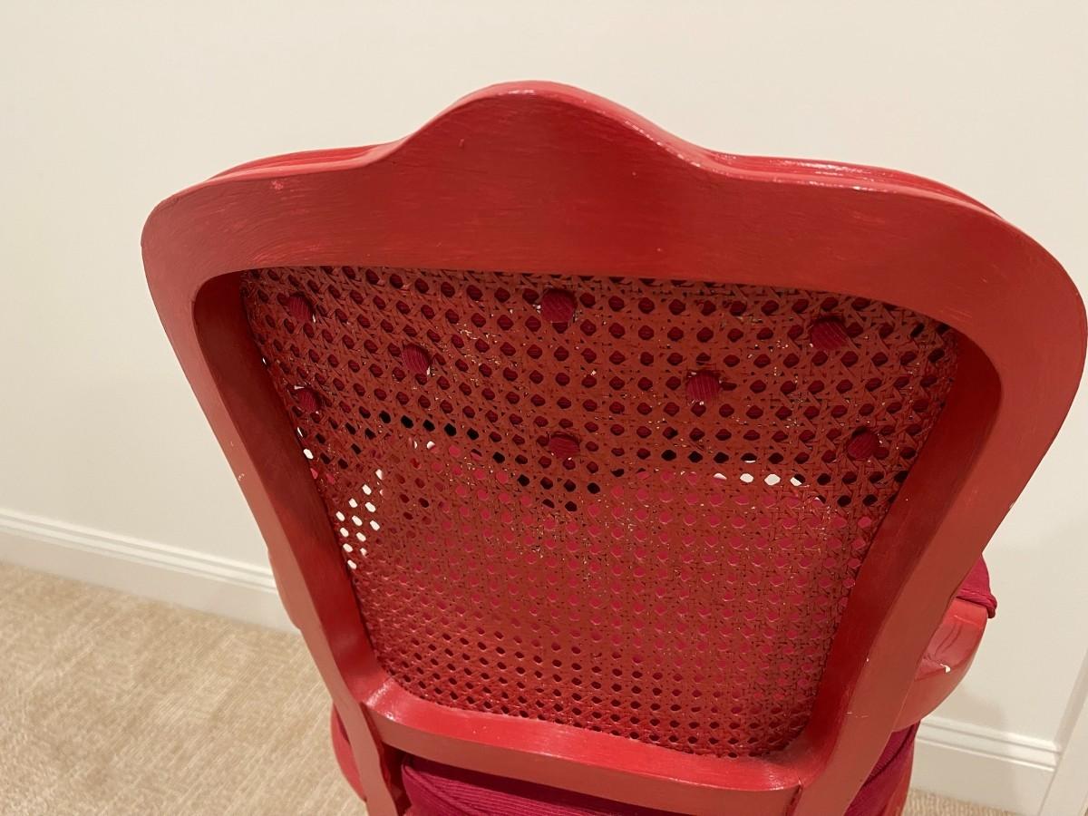 Custom upcycled cane chair with red custom upholstery. Chair has a couple chips. Upholstery is pristine. 19" wide x 22 1/2" deep x 38 3/4" high. # 1383