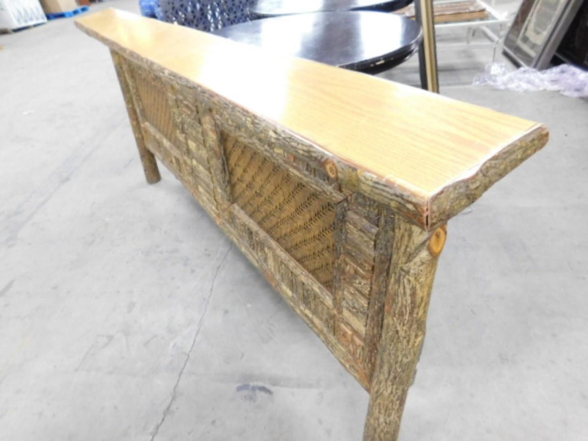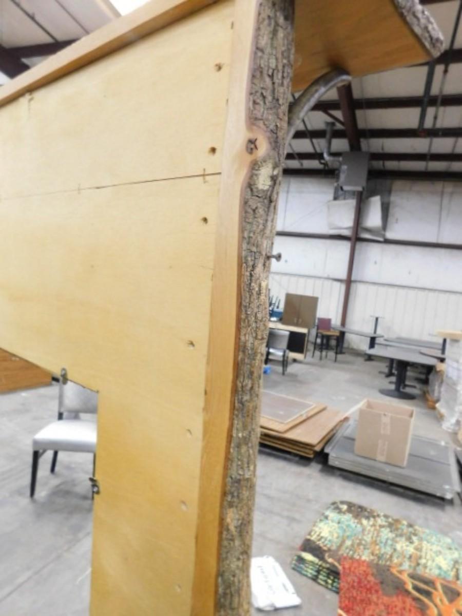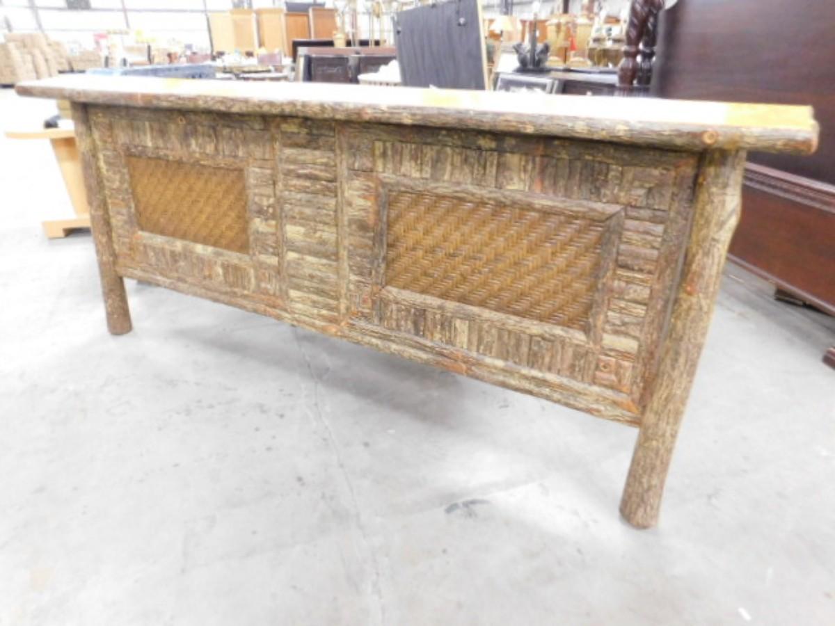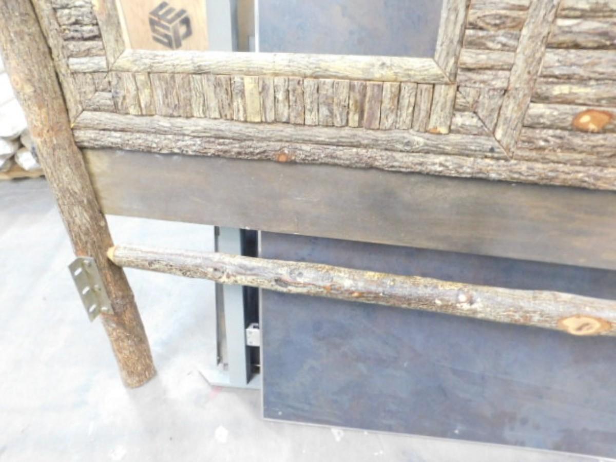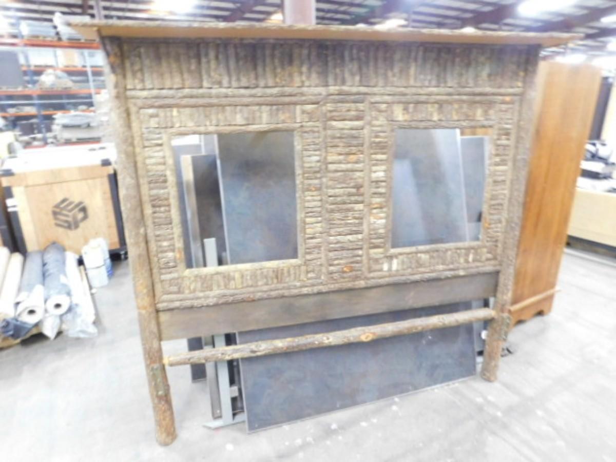 Custom Rustic King Sized Bed Frame by La Lune Collection Log and Twig Design. Has a missing corner brace on head board as shown. Open panels allow for a framed piece of art or decorative insert. Has clips to keep it secure as shown. Impressive item. Expect some wear or scratches to the finish. Shipping option available via freight or local mover at Buyer's expense. Buyer must have all shipping scheduled within the stated dates and times of pickup. Recommended local mover is Beaty Bros. Moving 828-201-2982