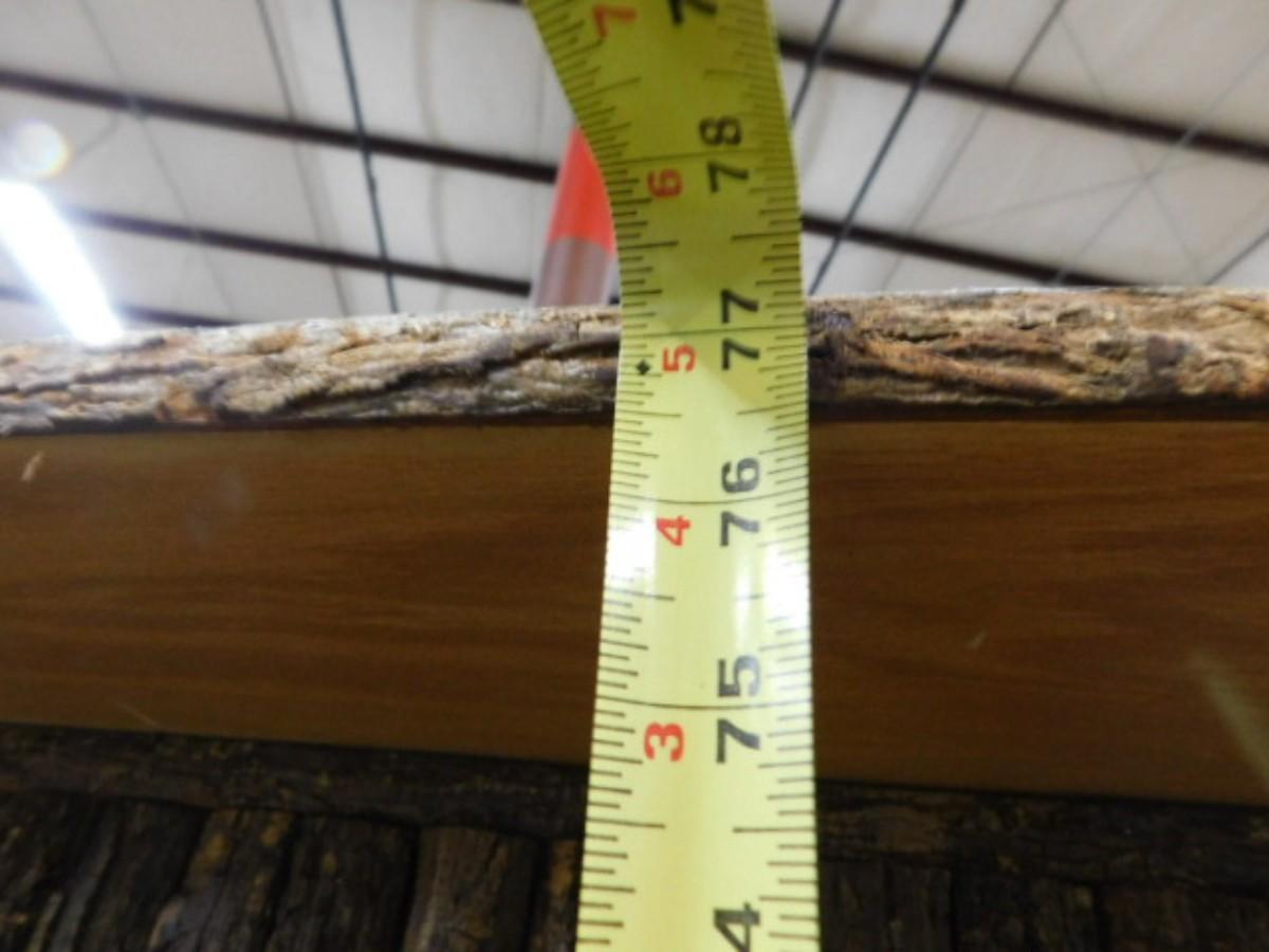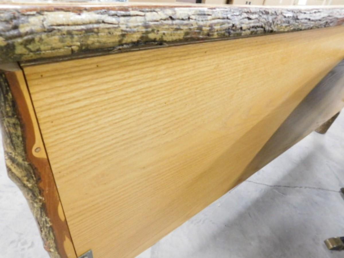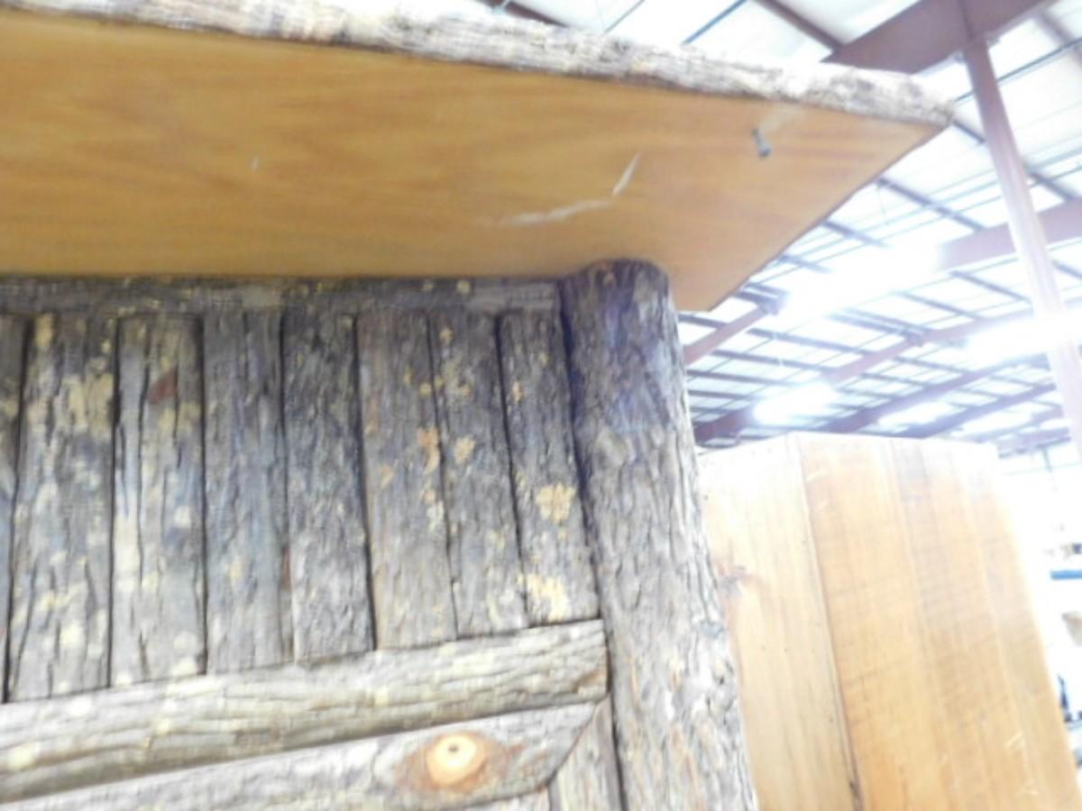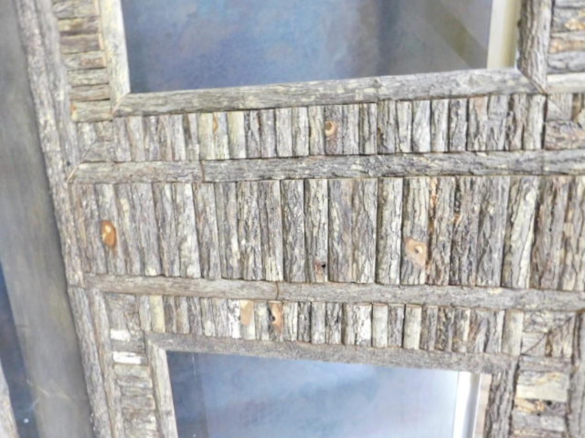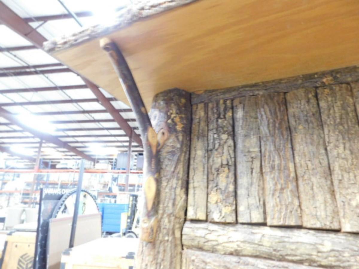 Custom Rustic King Sized Bed Frame by La Lune Collection Log and Twig Design. Has a missing corner brace on head board as shown. Open panels allow for a framed piece of art or decorative insert. Has clips to keep it secure as shown. Impressive item. Expect some wear or scratches to the finish. Shipping option available via freight or local mover at Buyer's expense. Buyer must have all shipping scheduled within the stated dates and times of pickup. Recommended local mover is Beaty Bros. Moving 828-201-2982