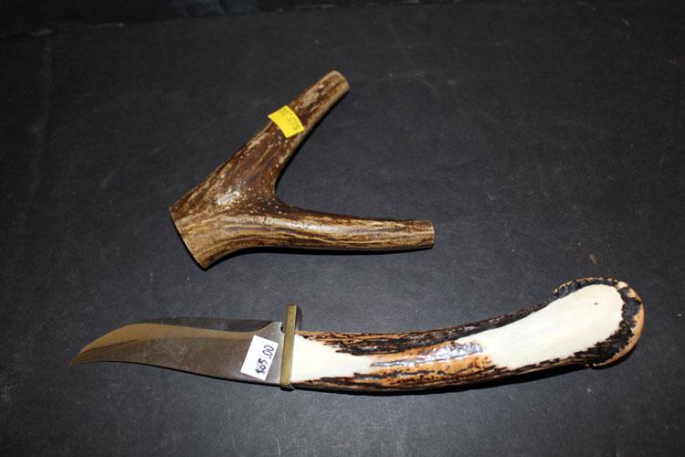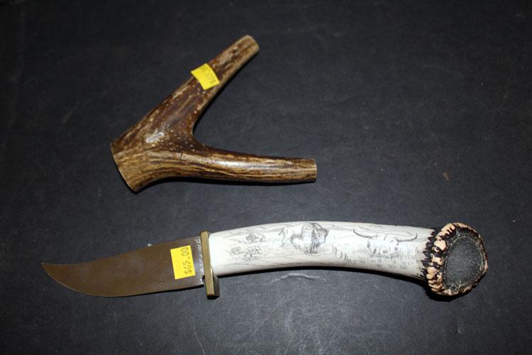 Custom scrimshaw hunting knife, antler stand