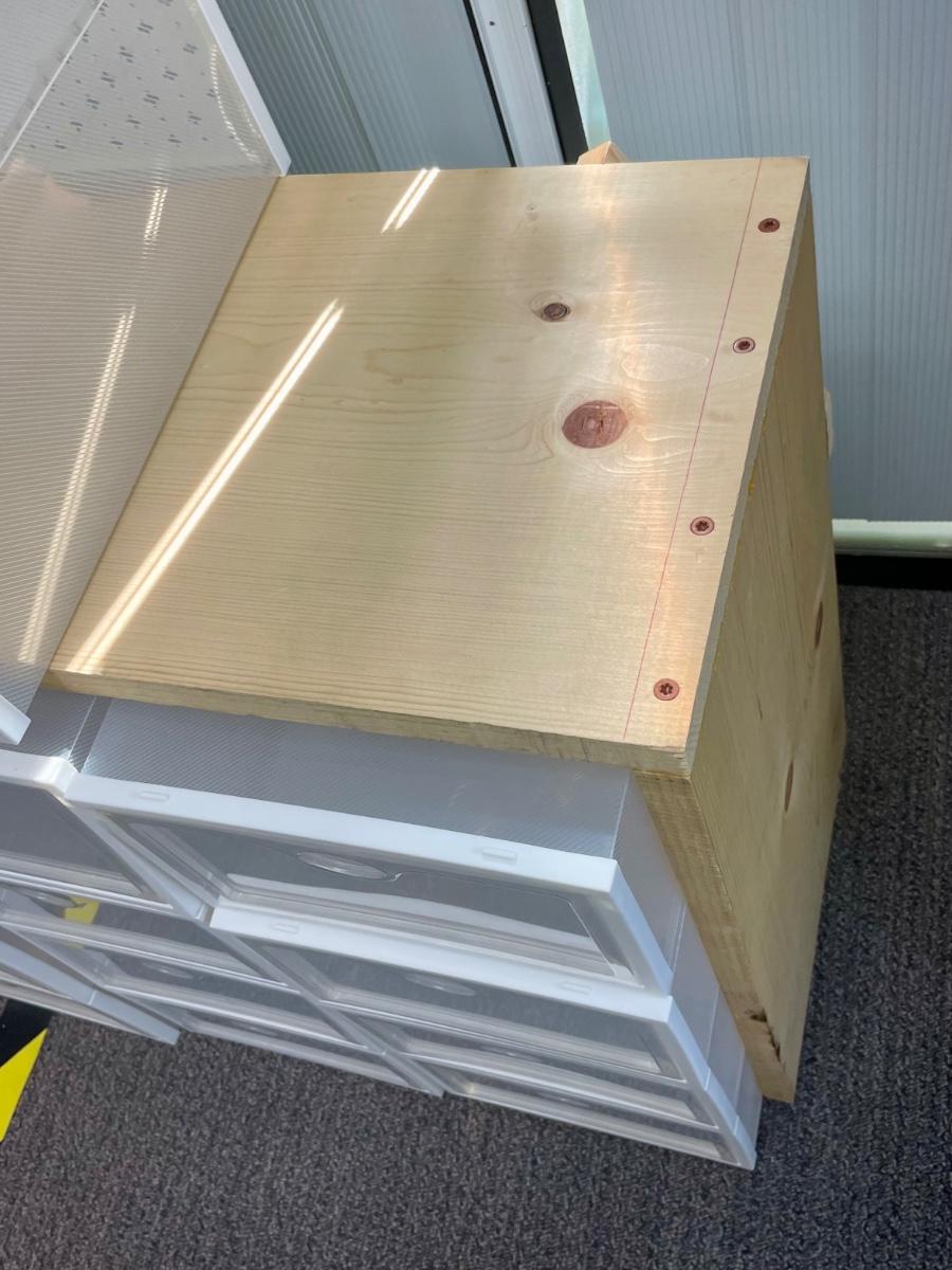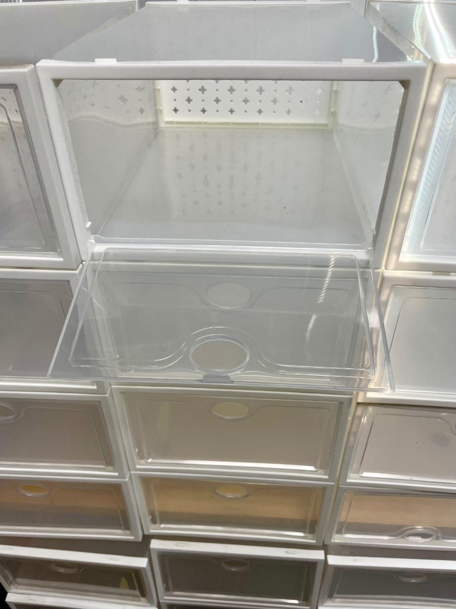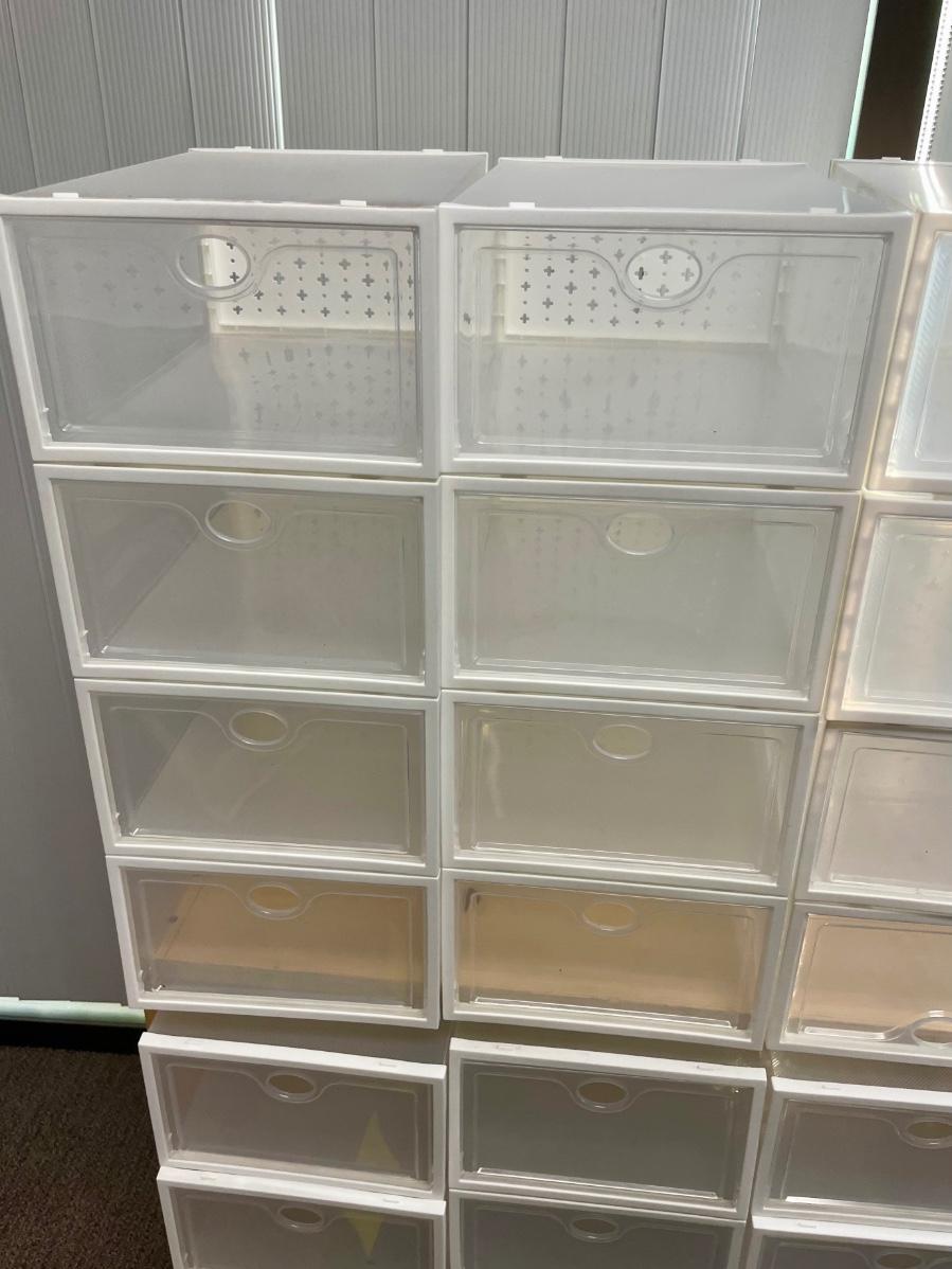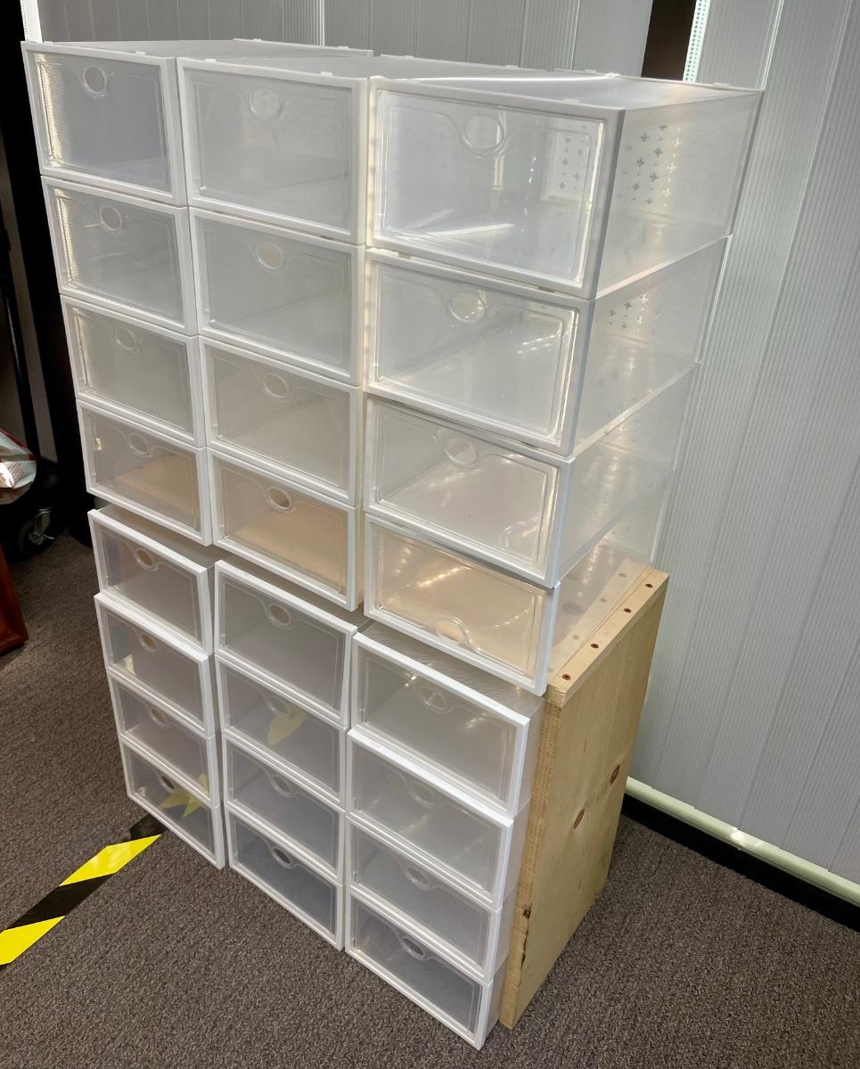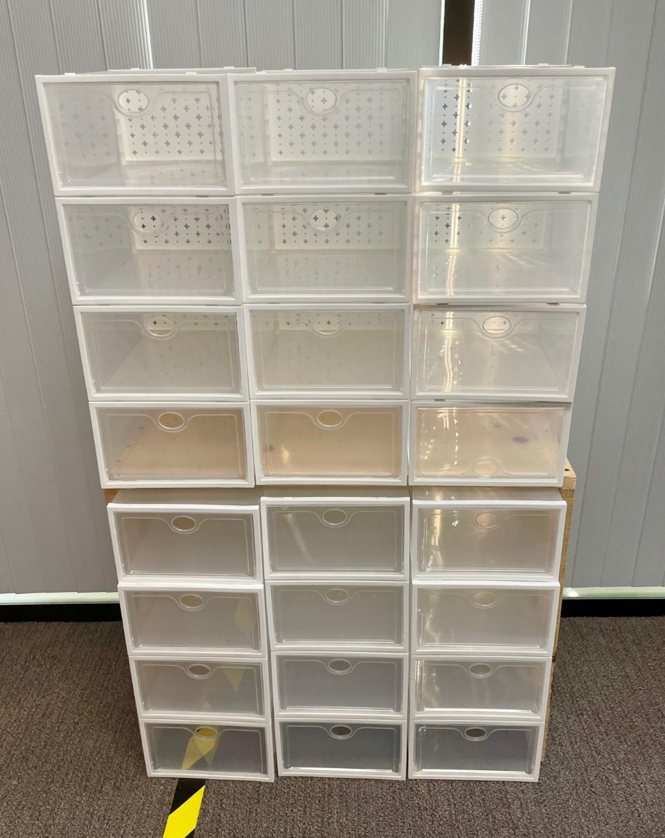 Holds 24 pair of shoes. Easily fits inside any closet. 24 stackable drop front storage boxes with a custom made wood bridge. Measures approx. 45” tall x 27” wide x 14” deep.