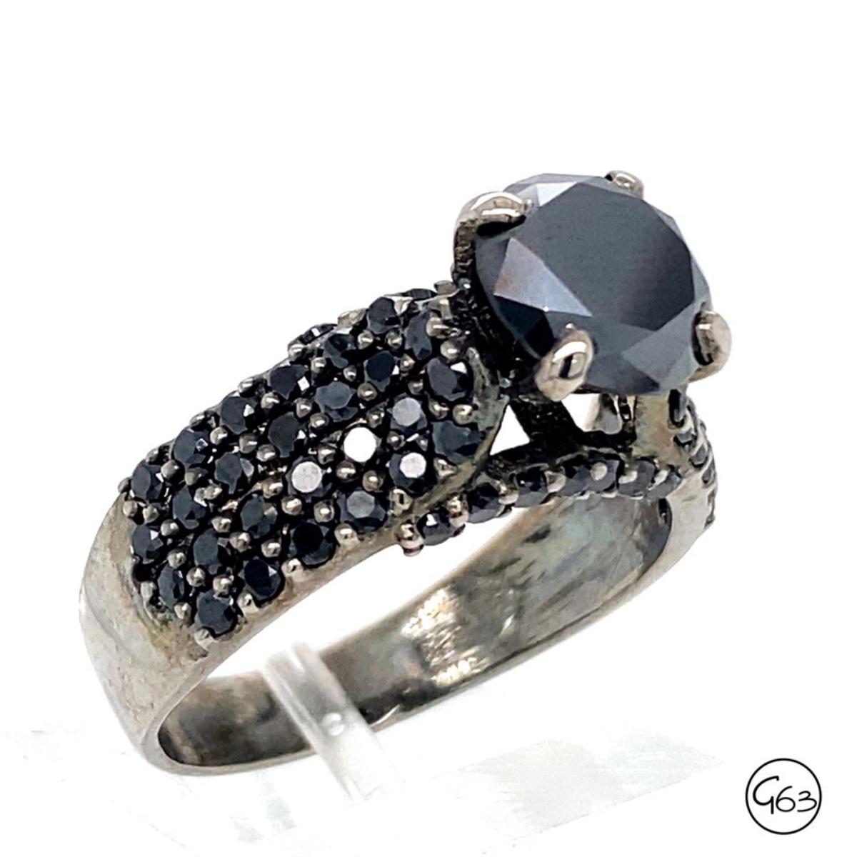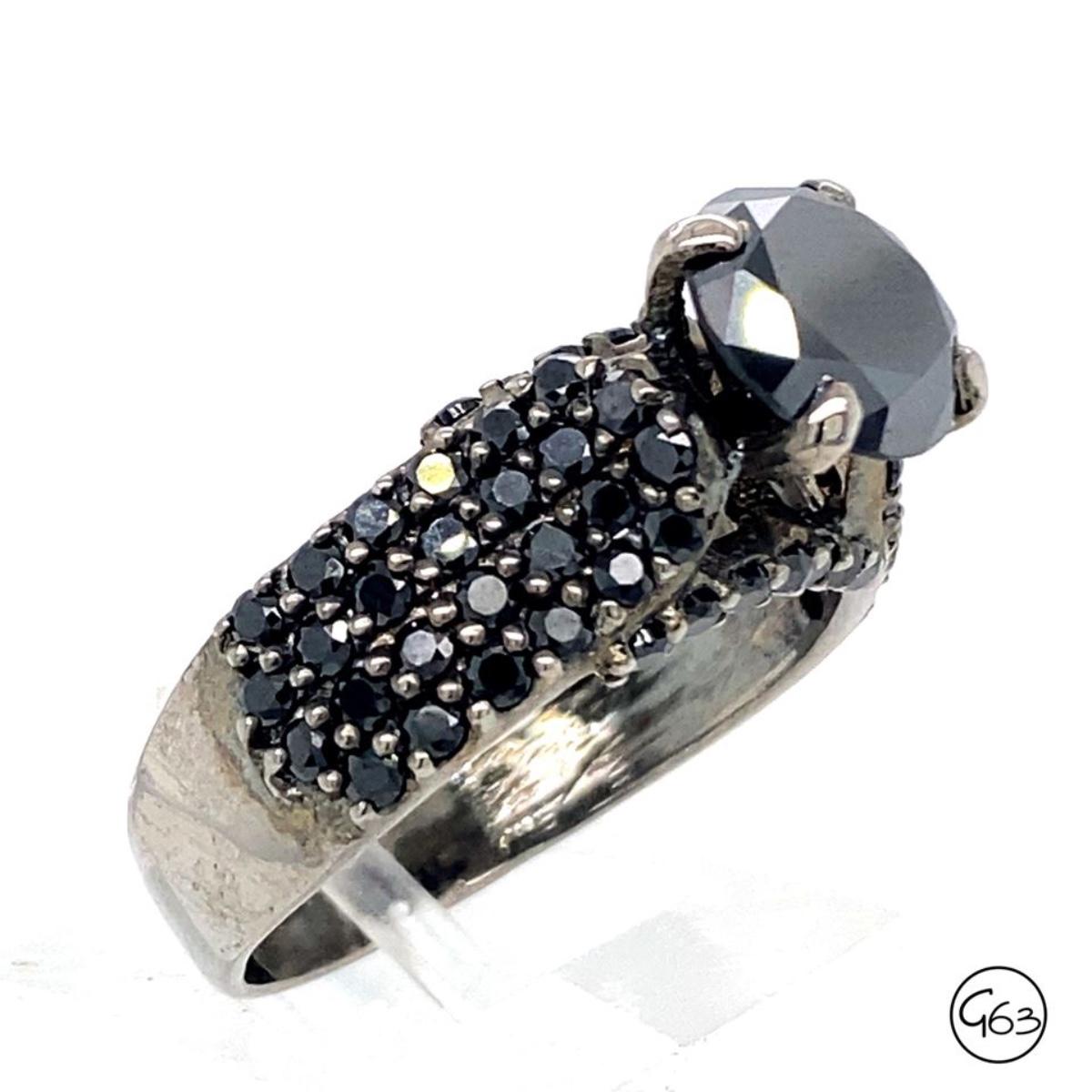 Sterling silver ring set with round cut 2.52ct black diamond with black diamonds accents. Ring size 8. Stamped 925 U SJ. Approx. overall weight 4.6 grams.