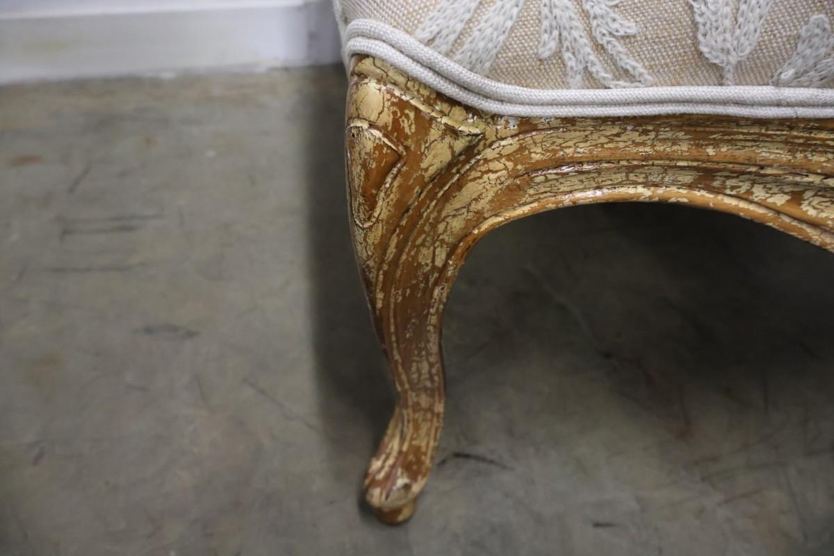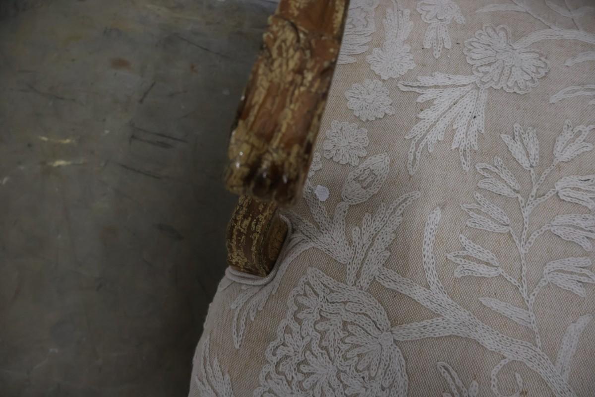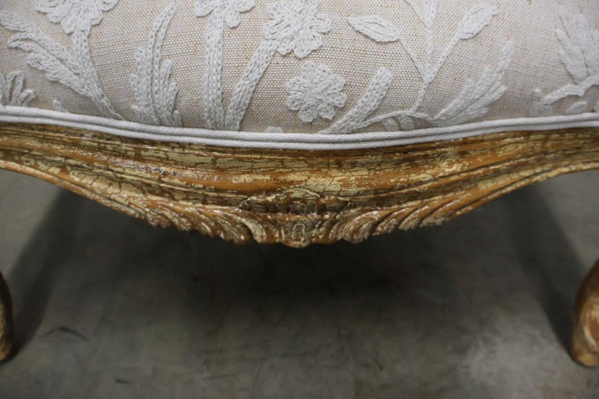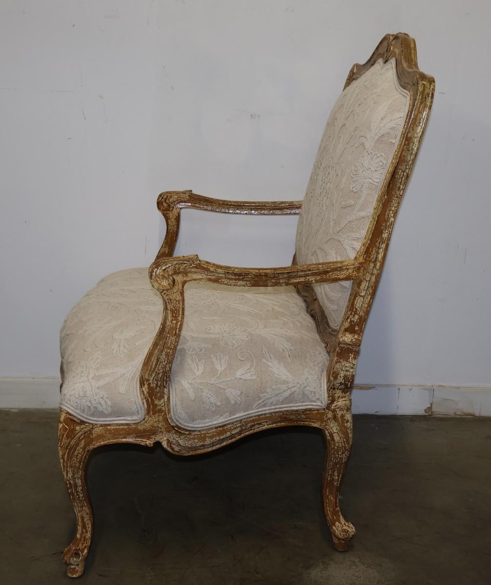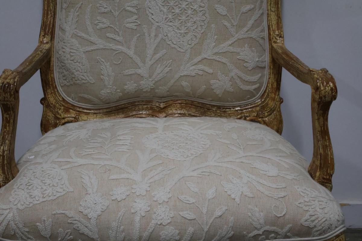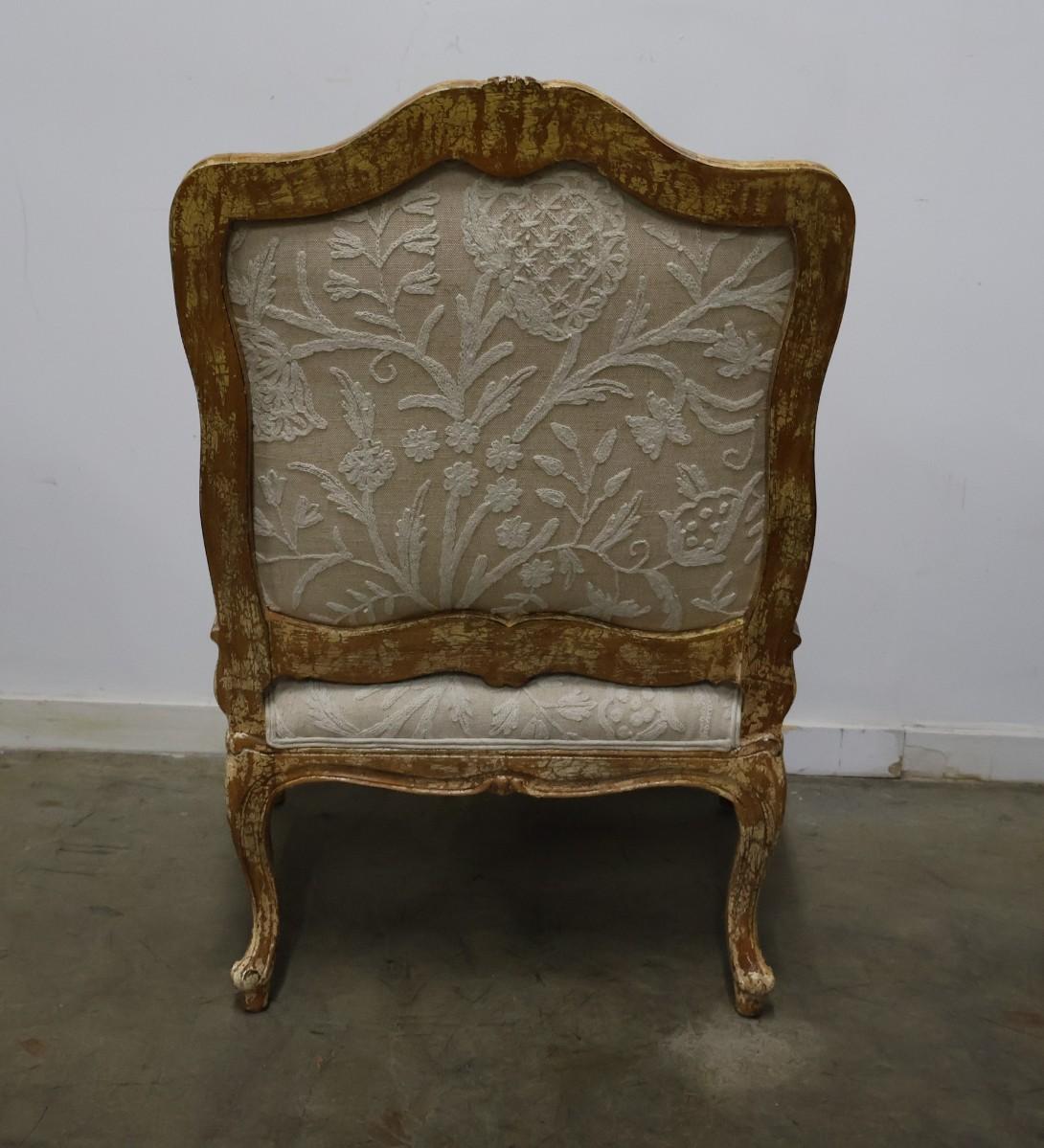 Custom upholstered arm chair with cabriole legs, crackle paint finish and embroidered cotton fabric in beige and white. Excellent condition. There is one small white paint drop on the seat fabric from when the house was painted. May or may not come off. 31" wide x 42" high. Seat is about 21" high x 23 1/4" deep. Comes from a smoke free and pet free home.