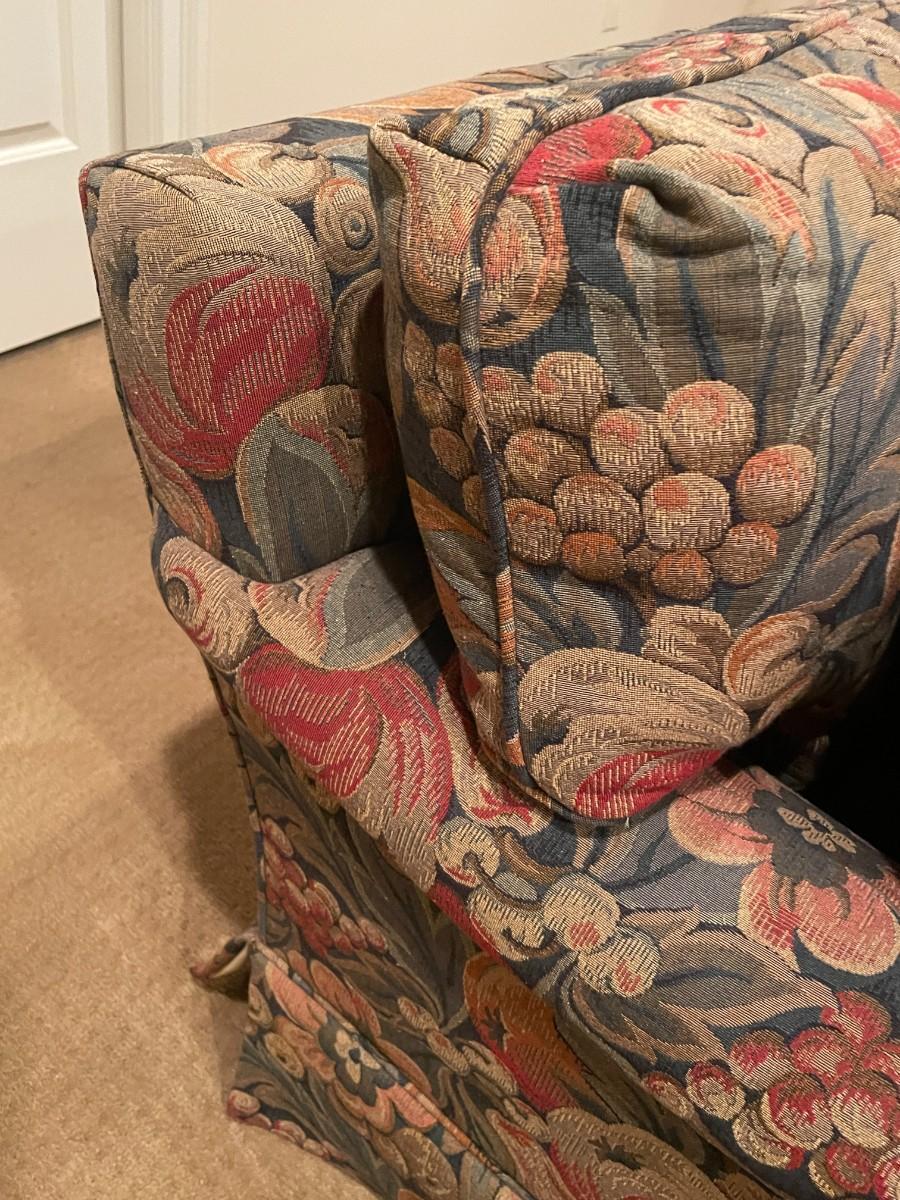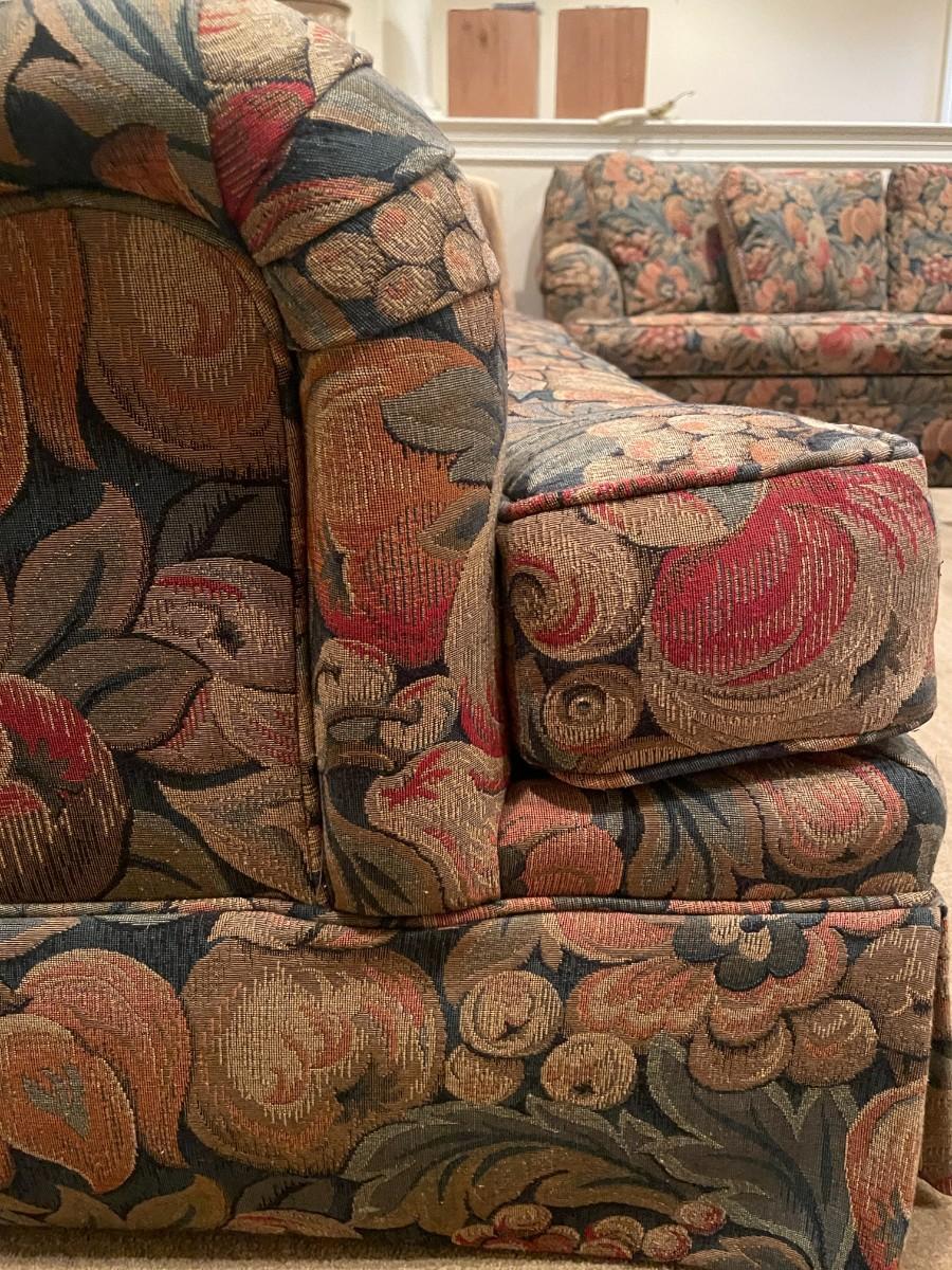 very good condition and comes from an immaculate smoke free and pet free estate. The sofas are upholstered in a heavy, jewelry toned, fruit patterned tapestry type fabric. There are no rips, tears or stains. Approximately 87" wide x 39" deep x 30" high. # 834