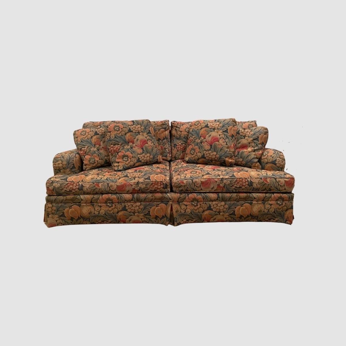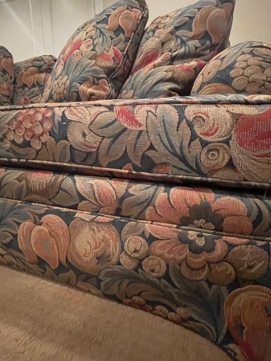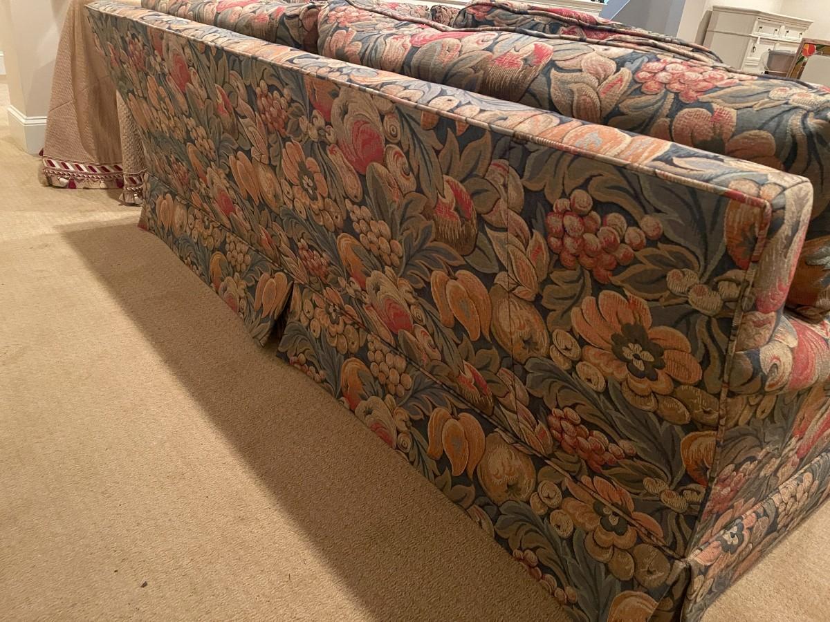 very good condition and comes from an immaculate smoke free and pet free estate. The sofas are upholstered in a heavy, jewelry toned, fruit patterned tapestry type fabric. There are no rips, tears or stains. Approximately 87" wide x 39" deep x 30" high. # 834
