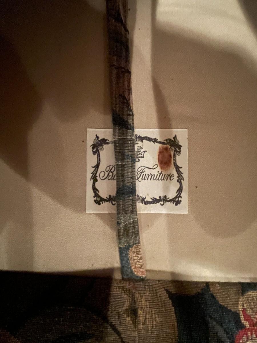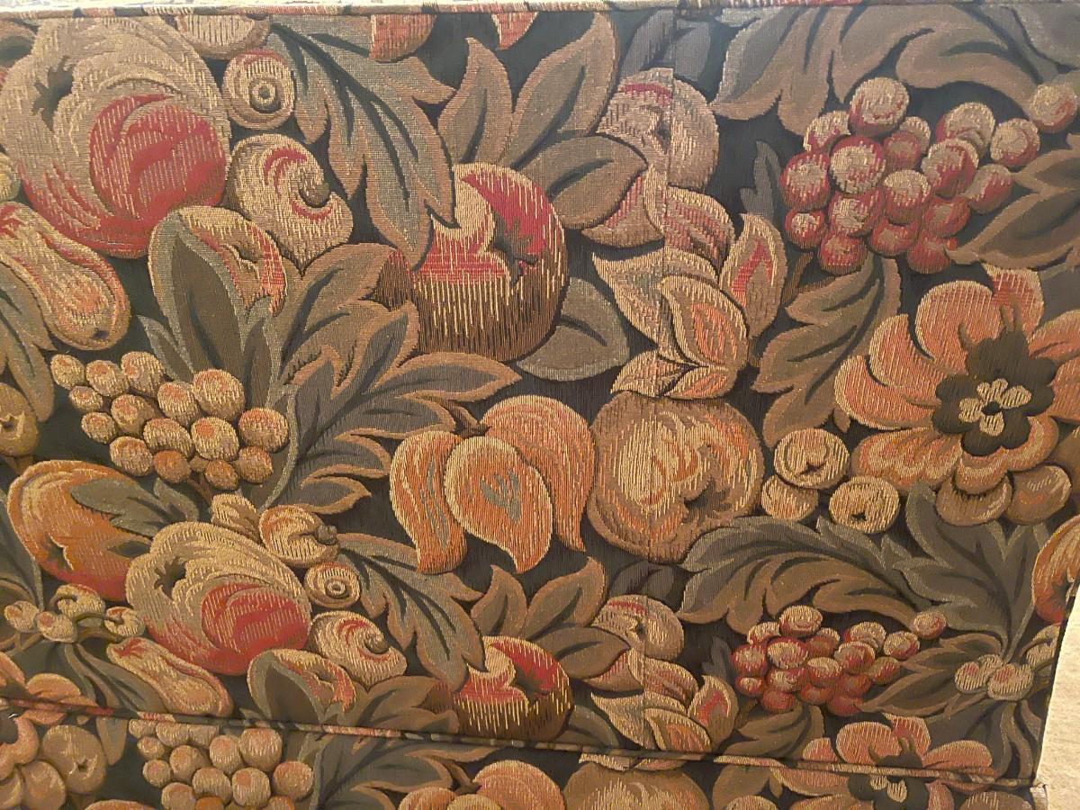 very good condition and comes from an immaculate smoke free and pet free estate. The sofas are upholstered in a heavy, jewelry toned, fruit patterned tapestry type fabric. There are no rips, tears or stains. Approximately 87" wide x 39" deep x 30" high. # 834