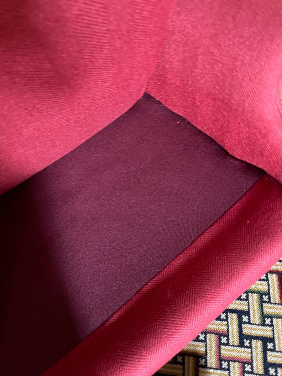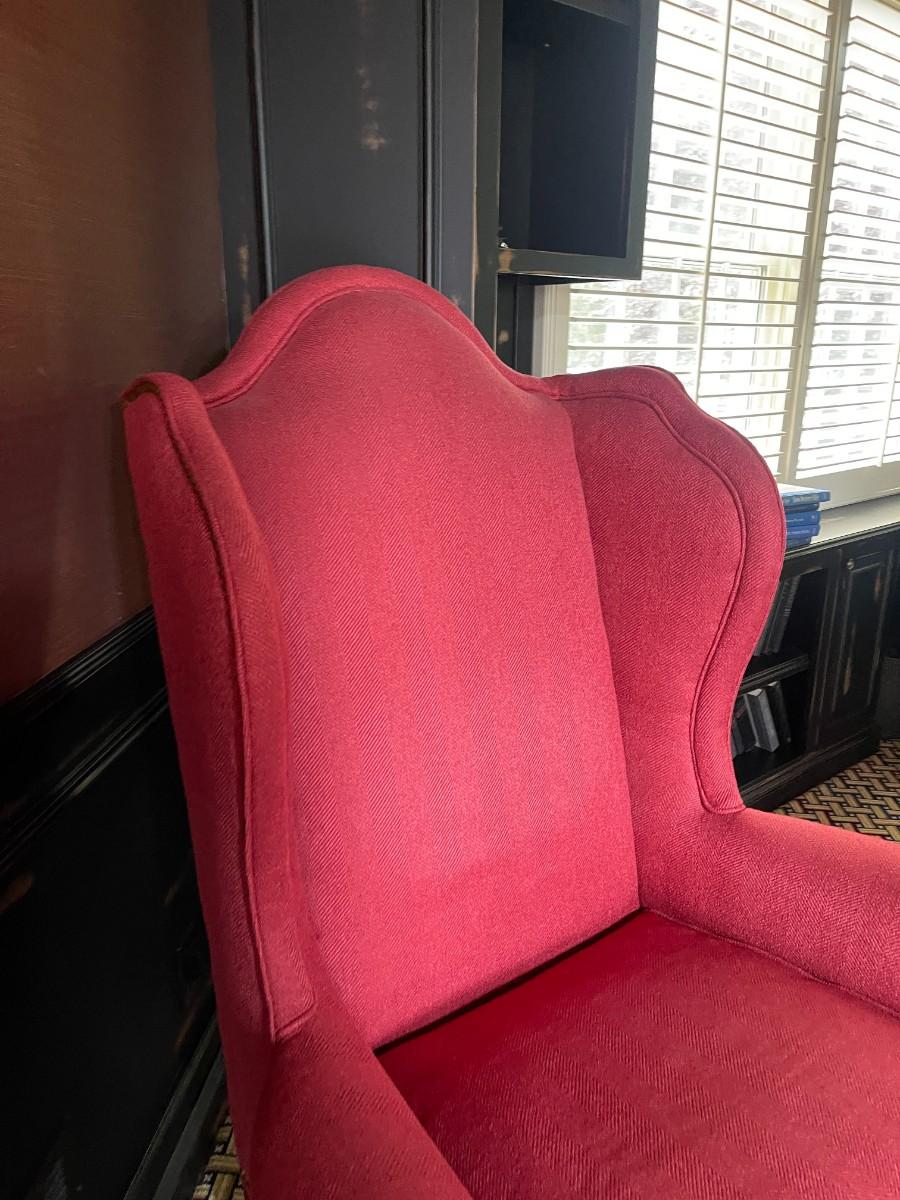Custom upholstered wing back chair in a heavy red fabric. Excellent condition. 36" wide x 53" high x 34" deep. Seat is 22" deep.