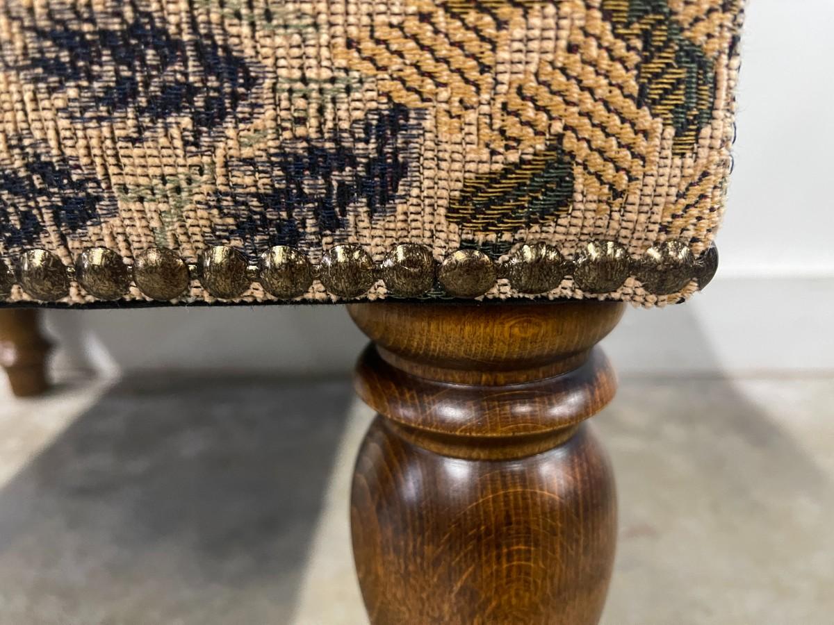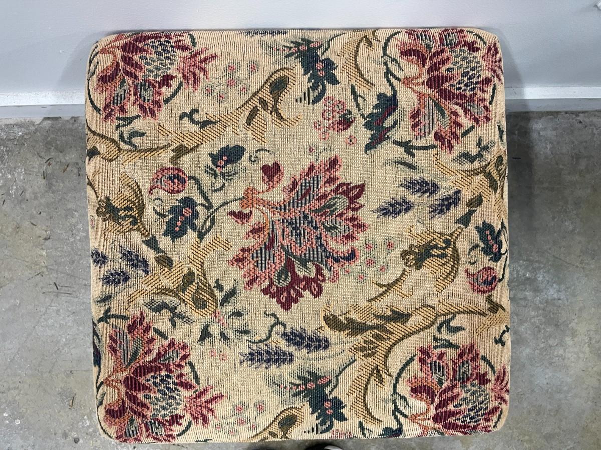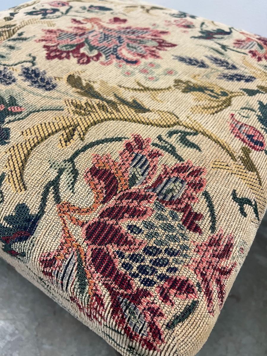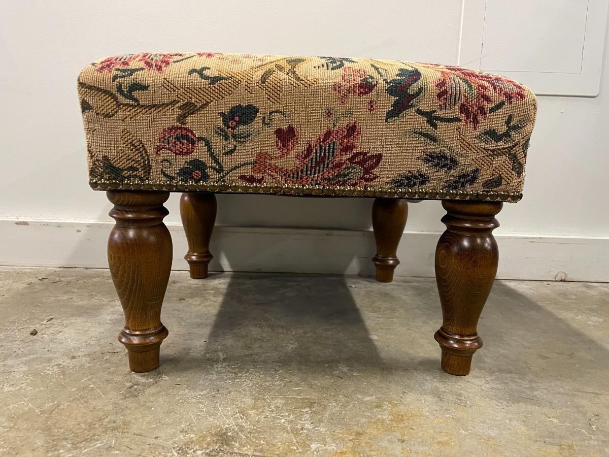 Custom upholstered stool with wood frame, tapestry fabric and brass nail head trim in excellent condition. 18" x 18" x 14" # 923