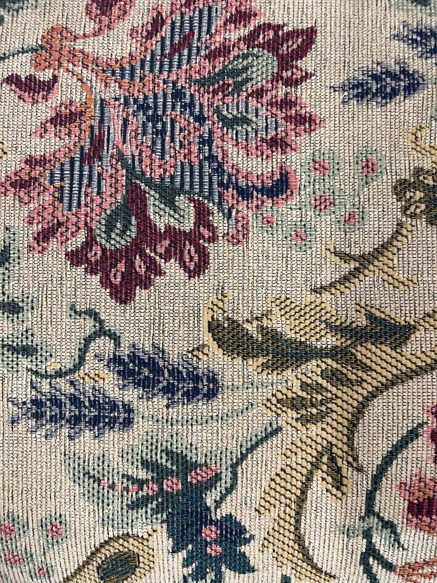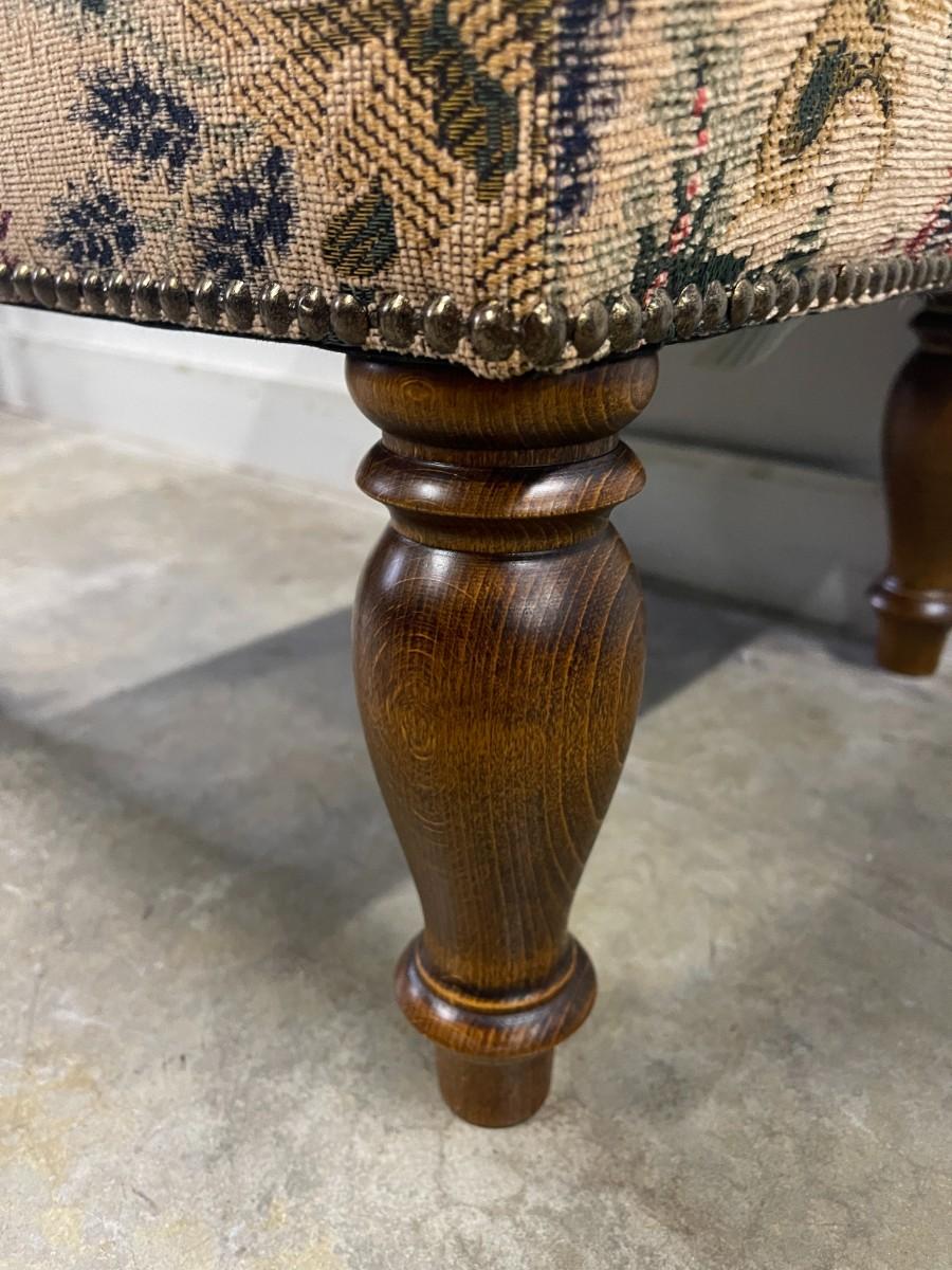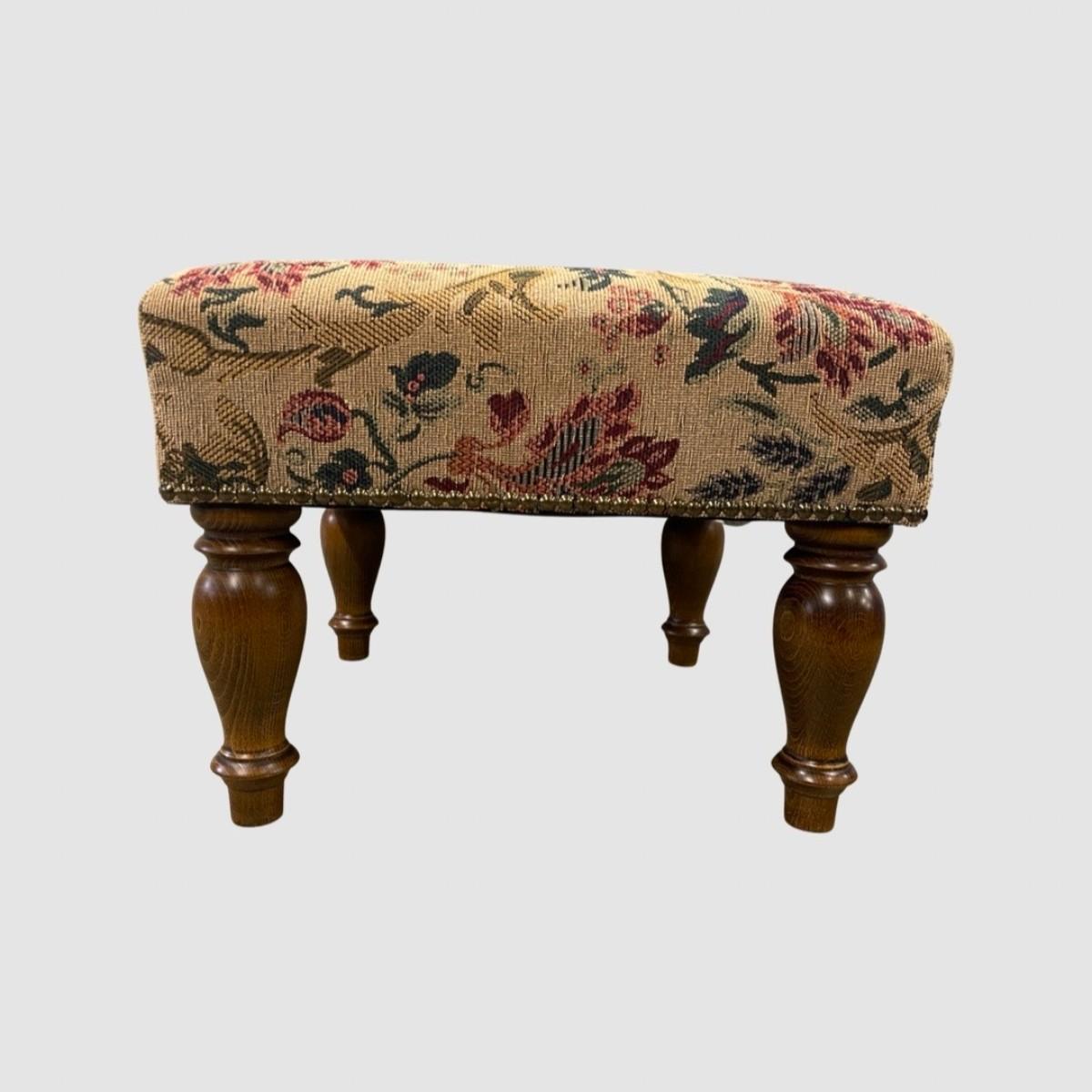 Custom upholstered stool with wood frame, tapestry fabric and brass nail head trim in excellent condition. 18" x 18" x 14" # 923