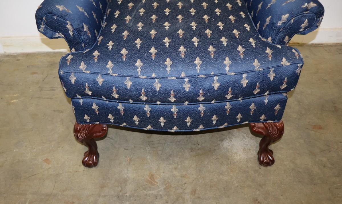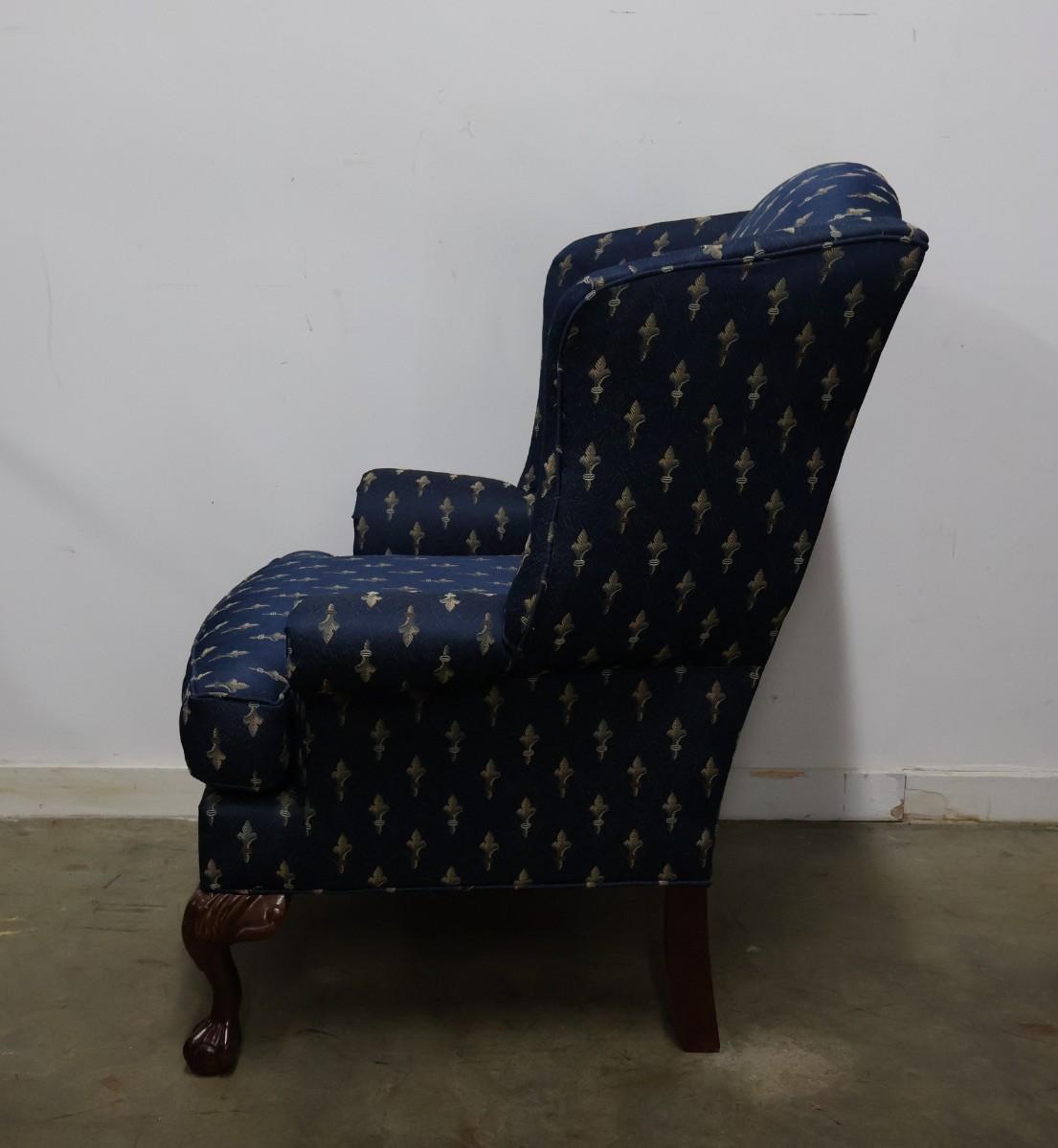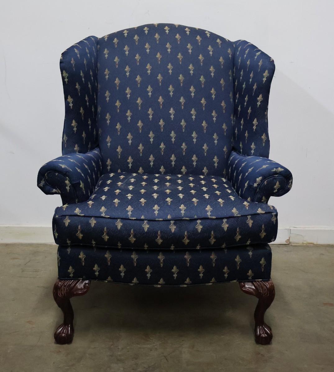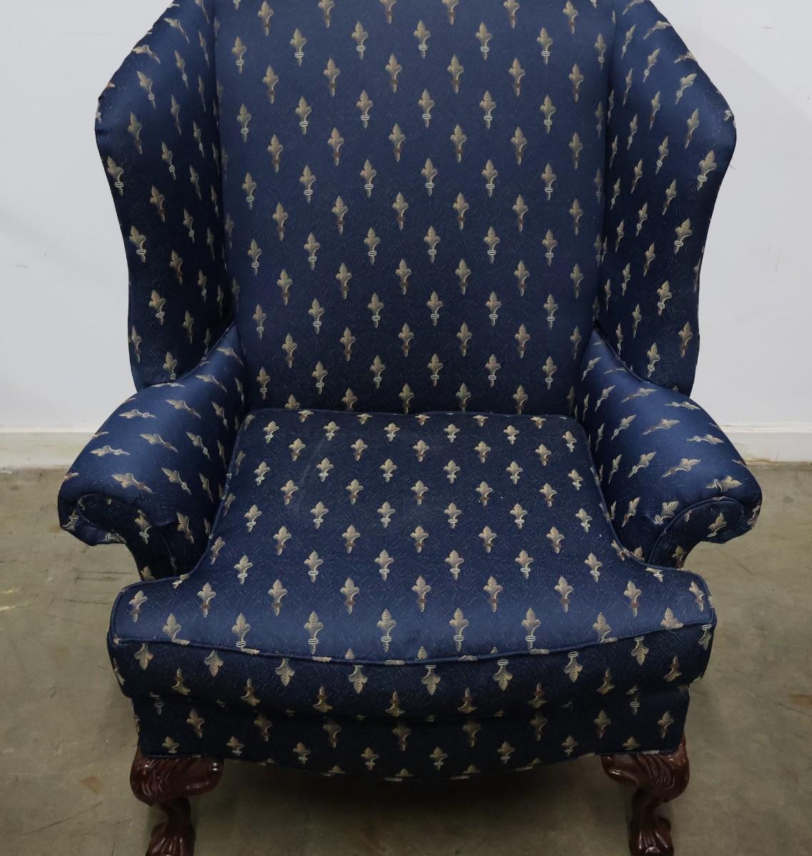 Custom upholstered Chippendale style wing back chair with ball and claw feet. Upholstery is pristine, legs show some wear. Chair back measures 42 1/2" high x 33 1/2" wide. Seat is 20 1/2" deep.