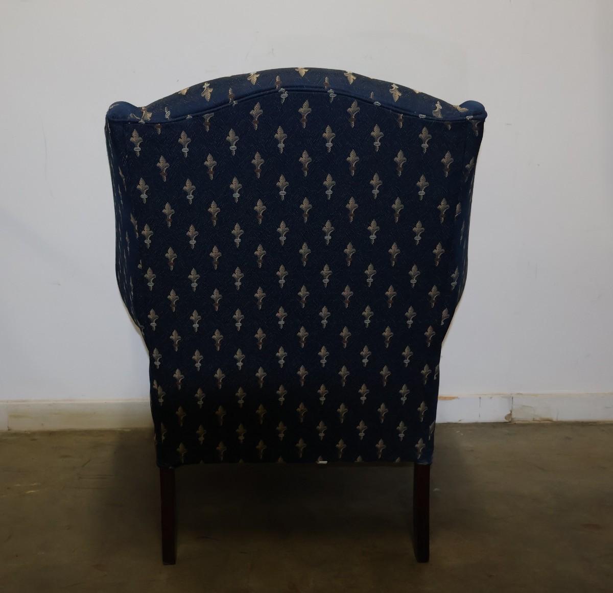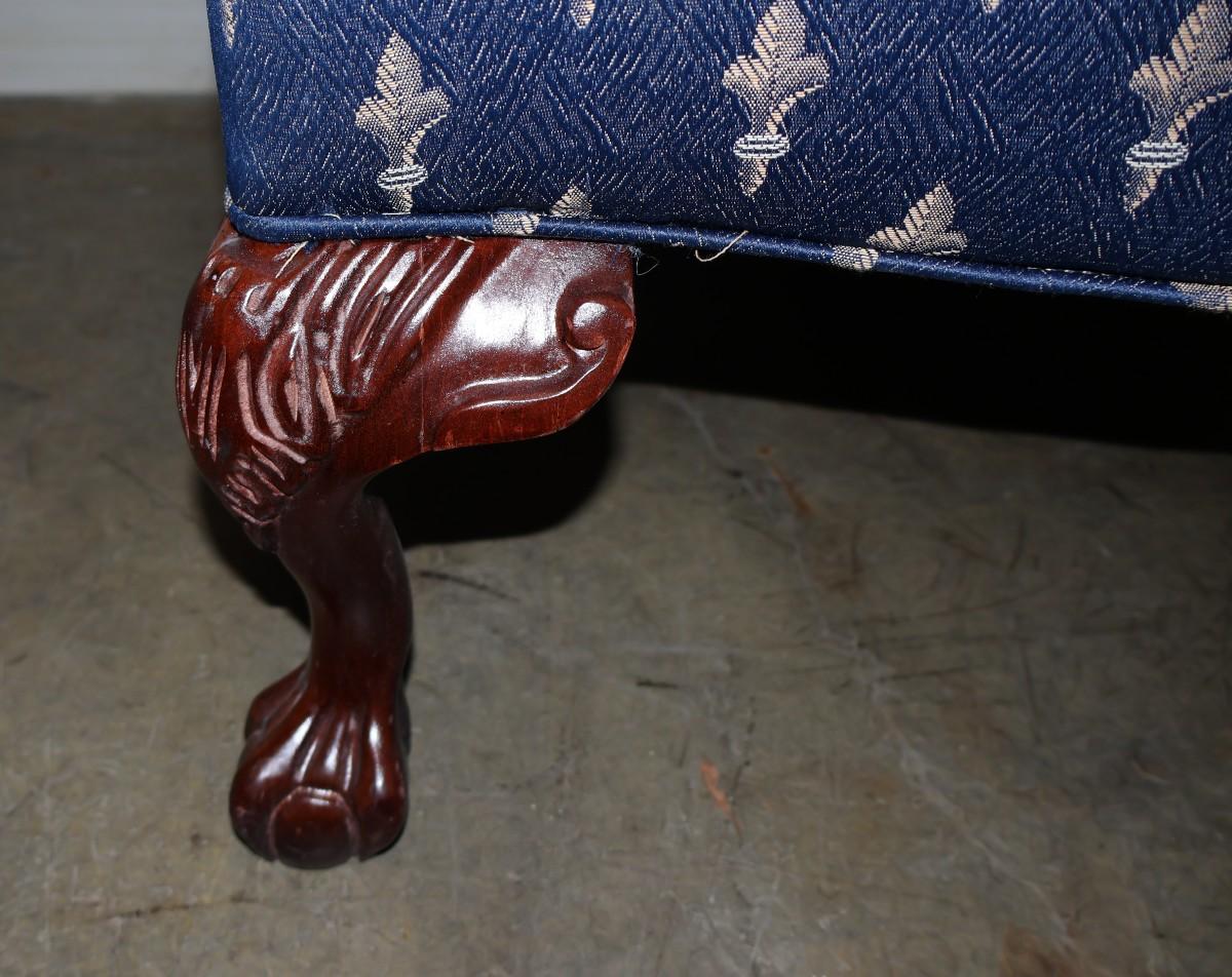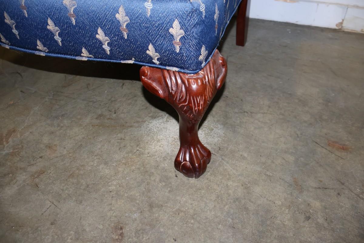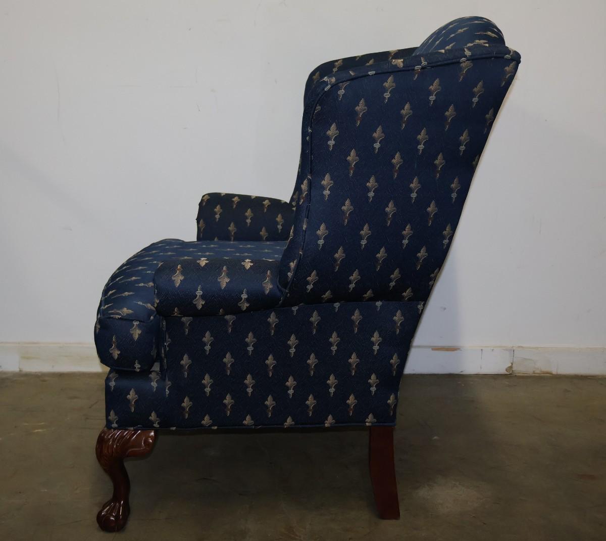 Custom upholstered Chippendale style wing back chair with ball and claw feet. Upholstery is pristine, legs show some wear. Chair back measures 42 1/2" high x 33 1/2" wide. Seat is 20 1/2" deep.