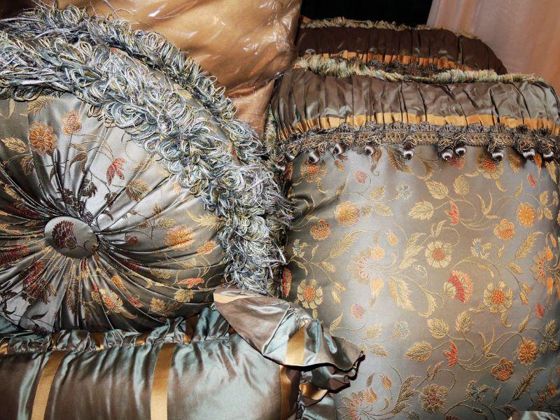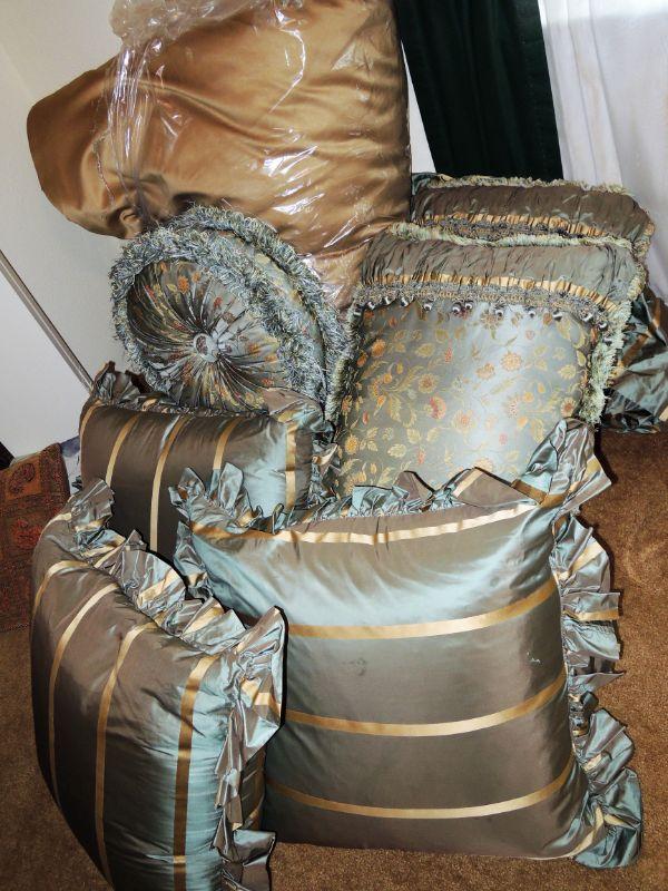 Beautiful bedding set! 3 euro pillows w shams, 2 king pillows with shams, comforter and sham. Silky green and gold. High end custom-made