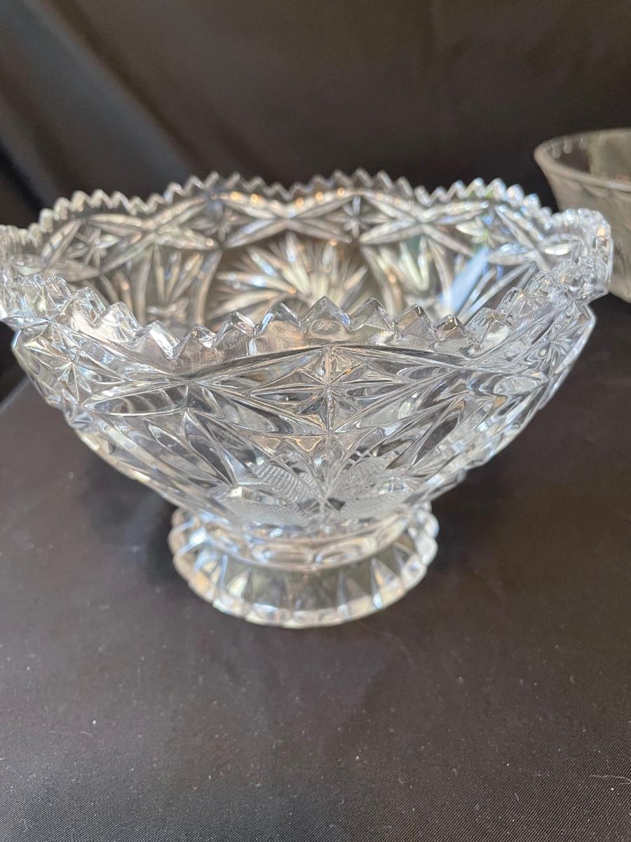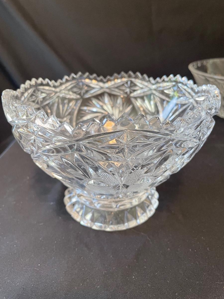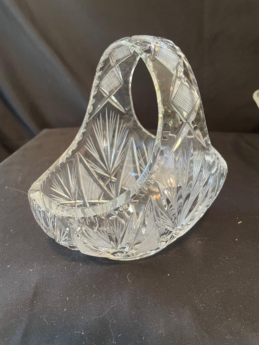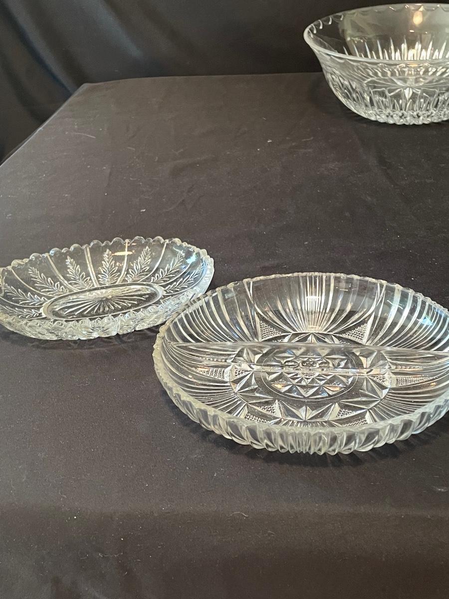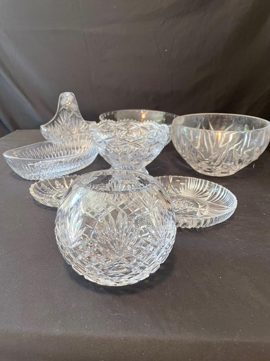 A nice assortment of cut and formed glass, eight items altogether that includes bowls, dishes and more all in good condition. Handled basket like piece measures 3” x 4” x 4”. Fishbowl in cover photo is 5" d x 4" h. Local Pickup Only