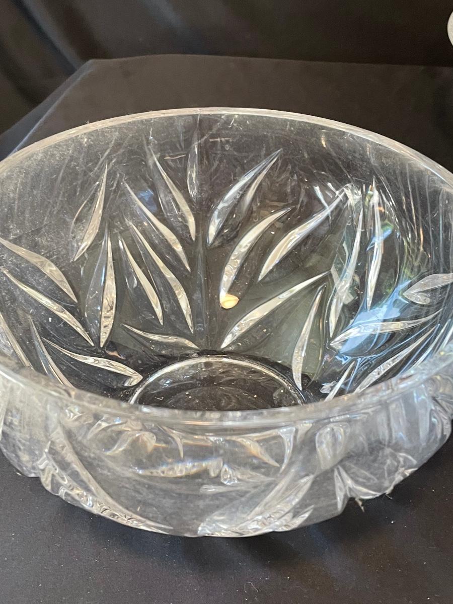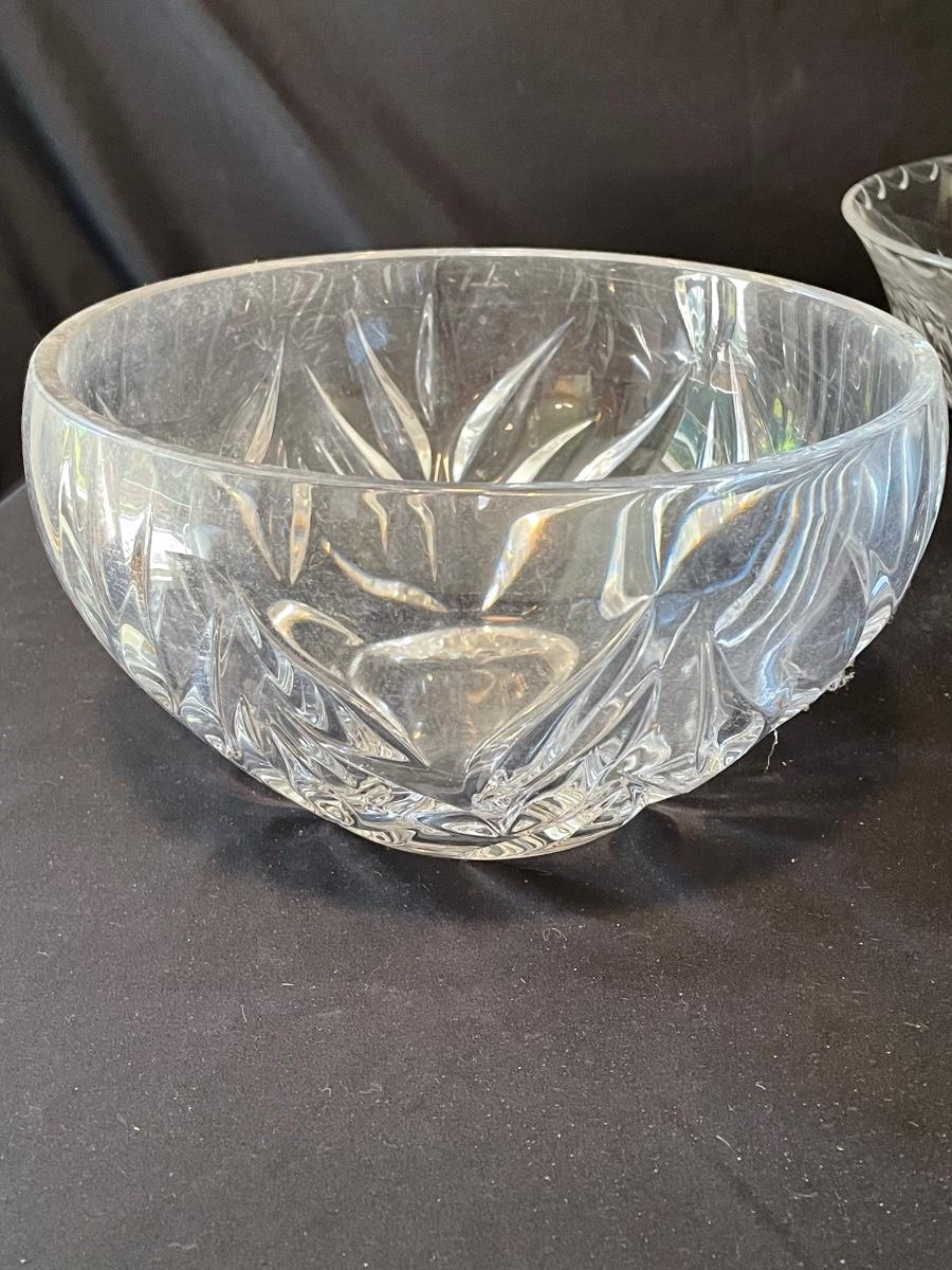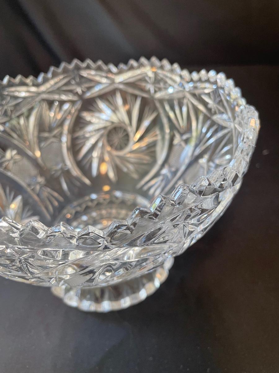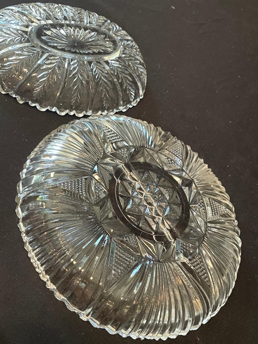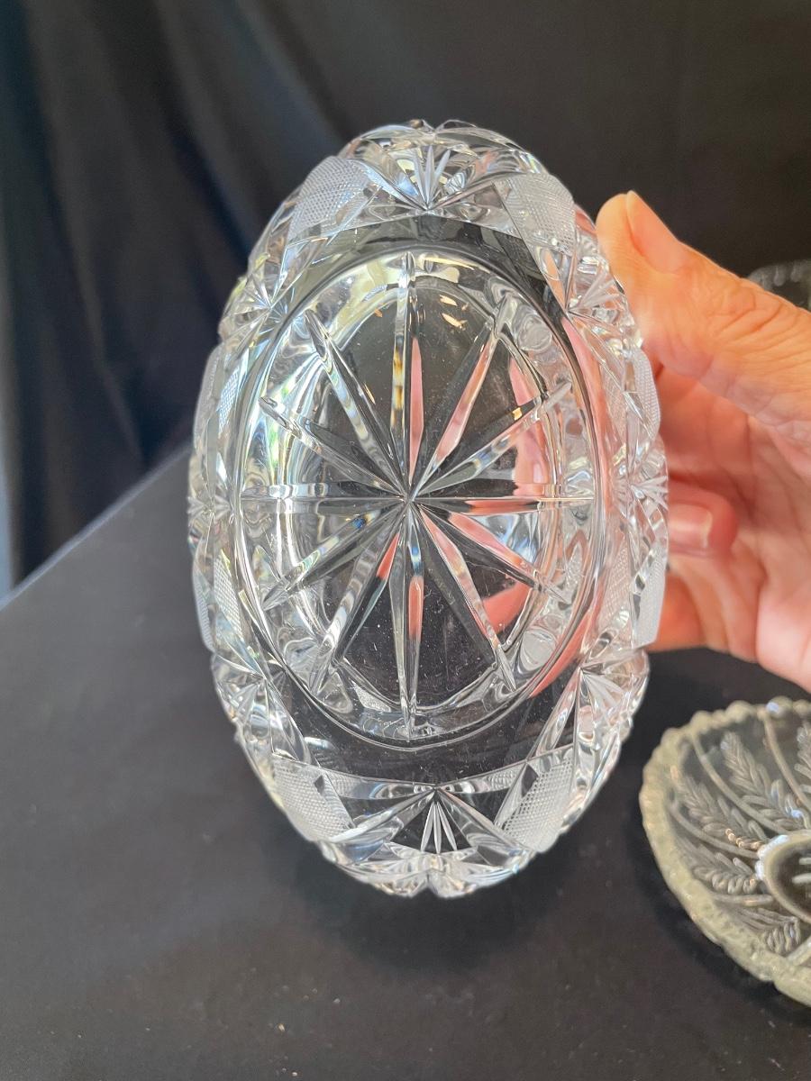 A nice assortment of cut and formed glass, eight items altogether that includes bowls, dishes and more all in good condition. Handled basket like piece measures 3” x 4” x 4”. Fishbowl in cover photo is 5" d x 4" h. Local Pickup Only