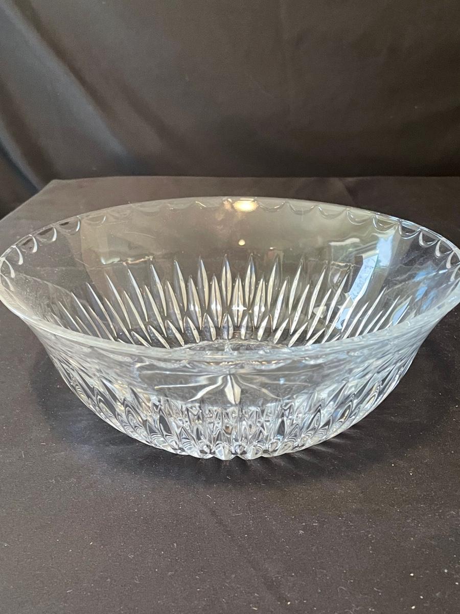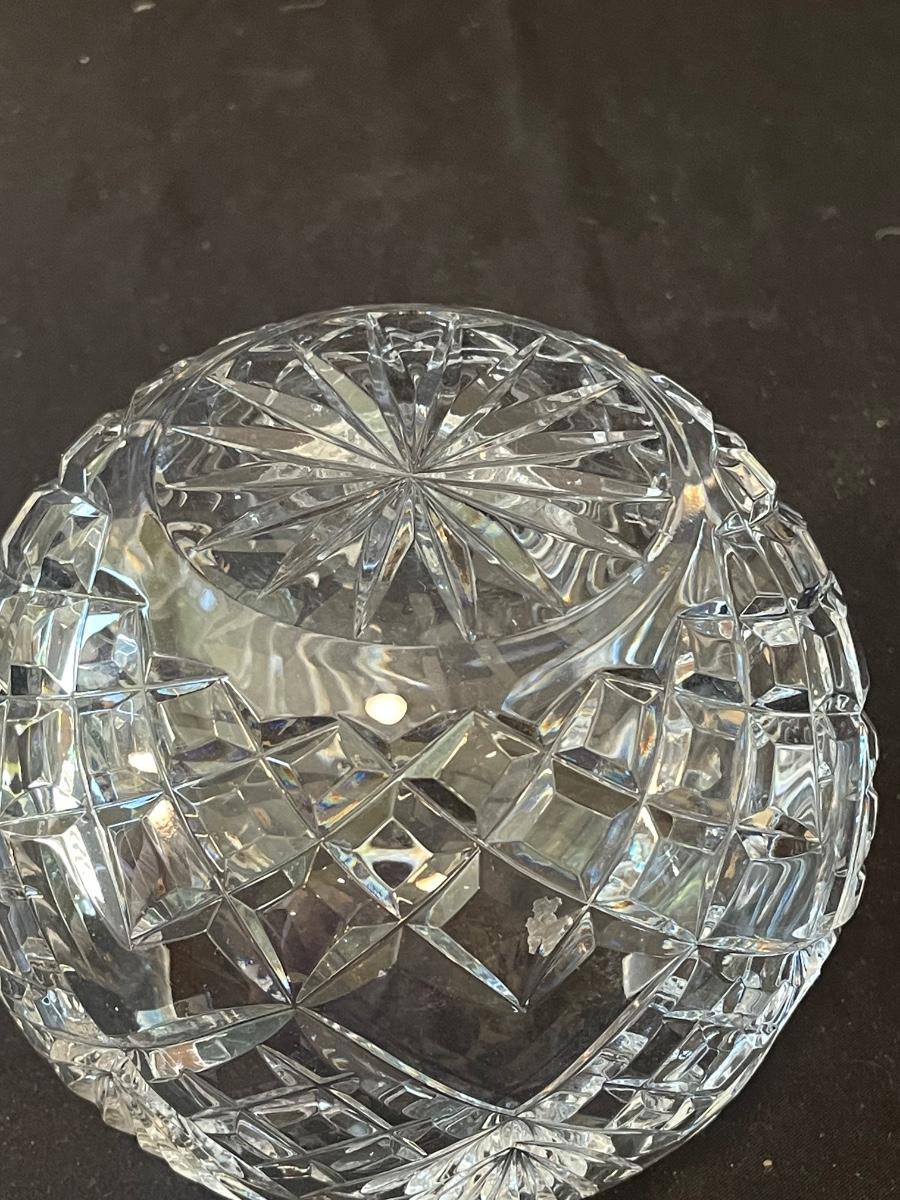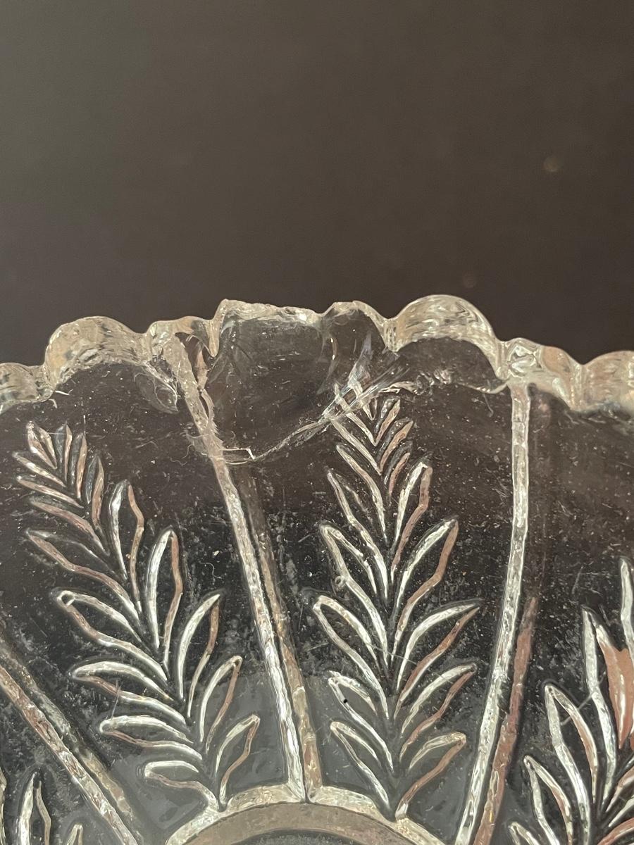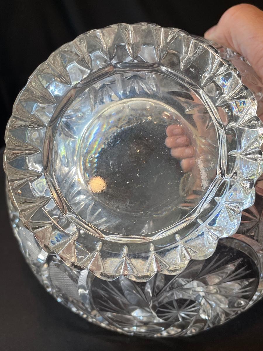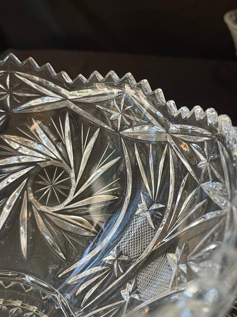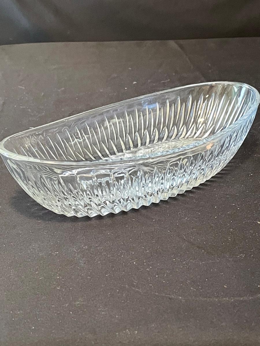 A nice assortment of cut and formed glass, eight items altogether that includes bowls, dishes and more all in good condition. Handled basket like piece measures 3” x 4” x 4”. Fishbowl in cover photo is 5" d x 4" h. Local Pickup Only