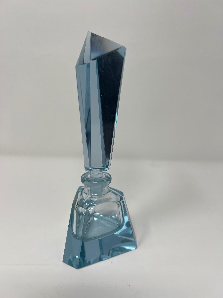 5” tall and 2” x 2” x 2” triangular empty perfume bottle made by K - West Germany. Cut Lead Blue Crystal.