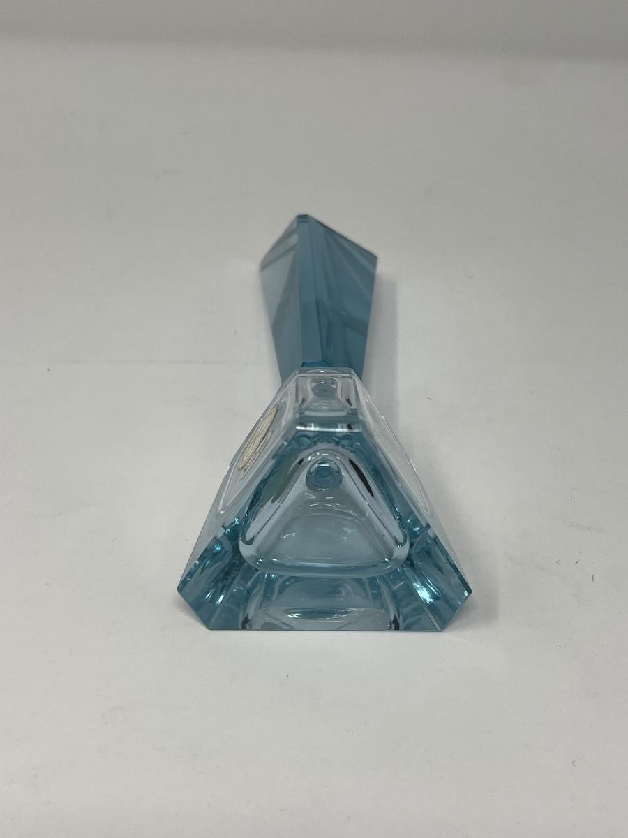 5” tall and 2” x 2” x 2” triangular empty perfume bottle made by K - West Germany. Cut Lead Blue Crystal.