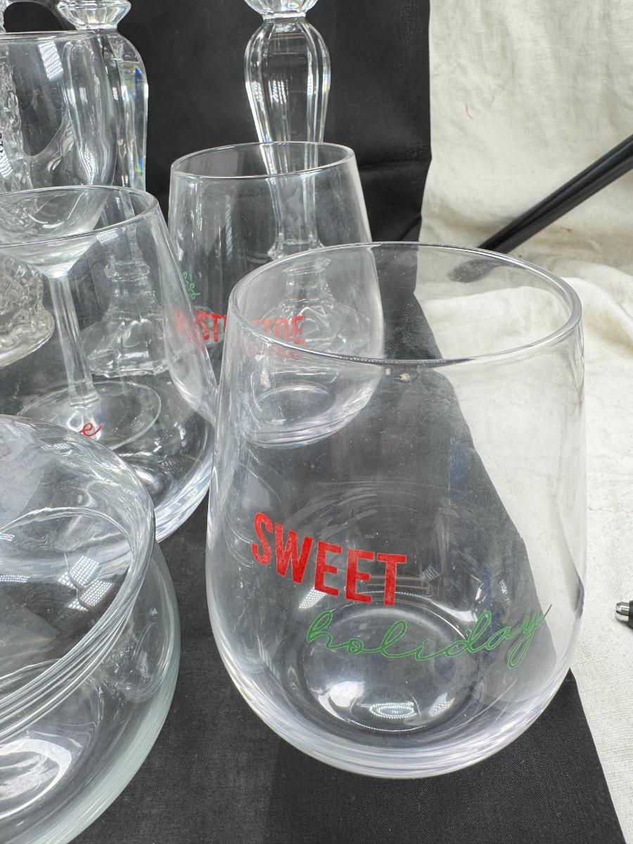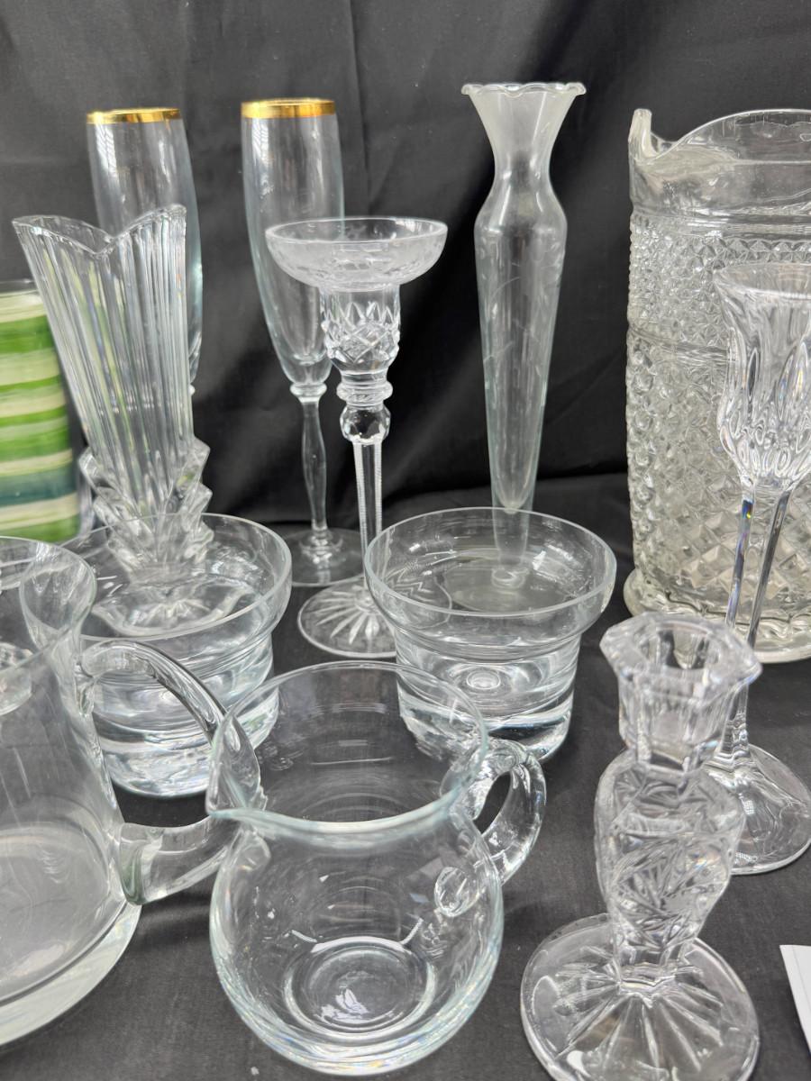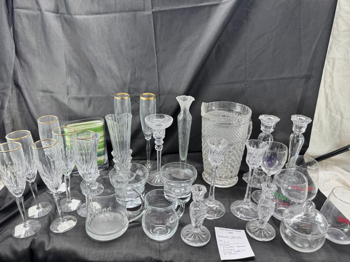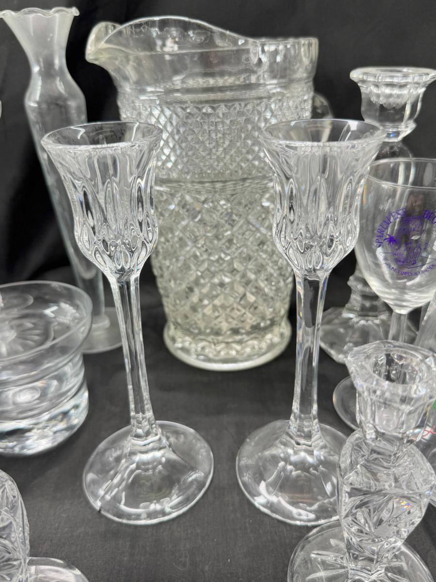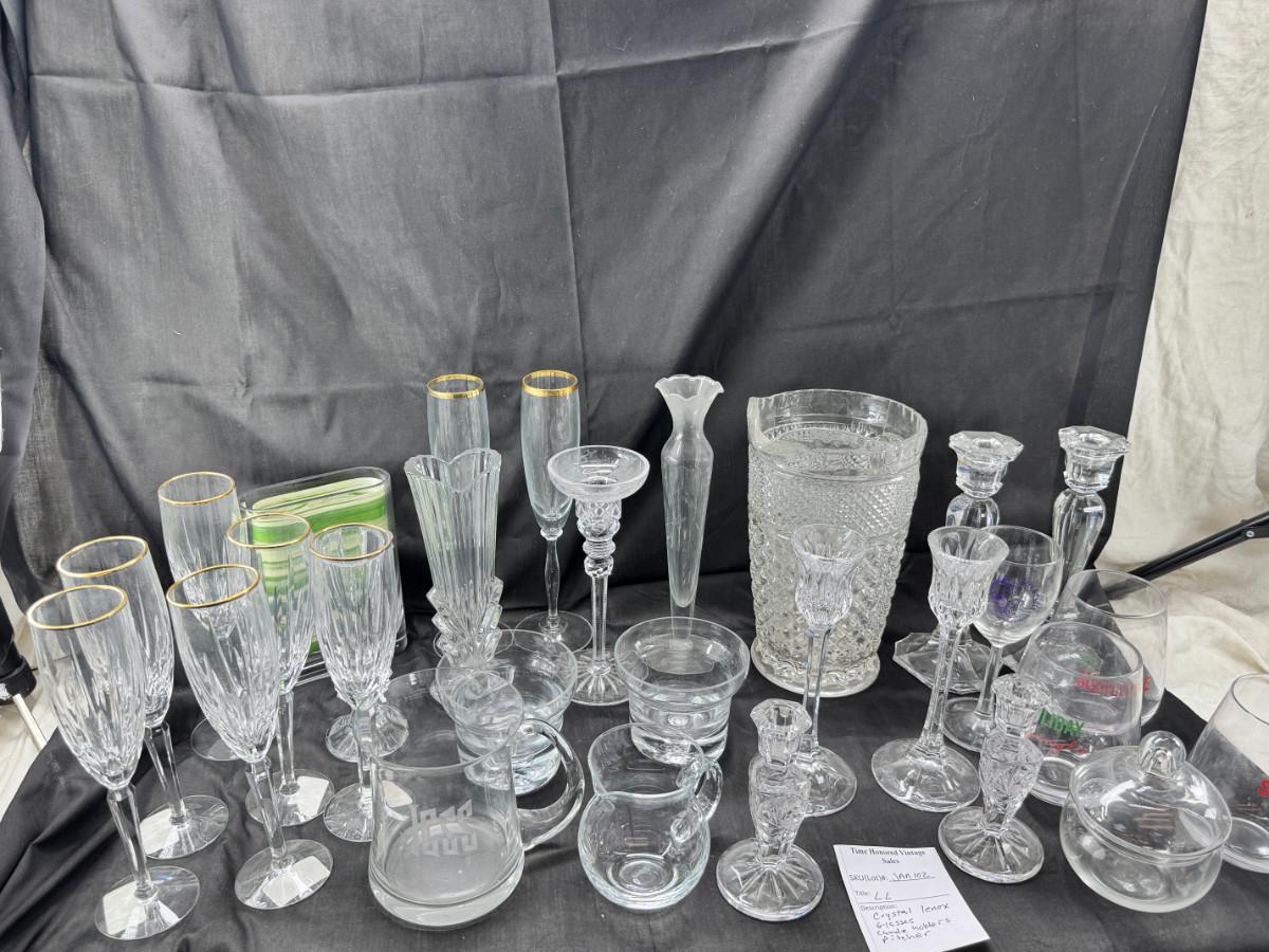 Lenox wine glasses , Crystal candle holders, bud vases, 3 holiday cups. Large cut crystal pitcher