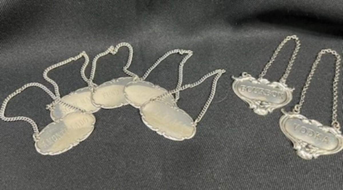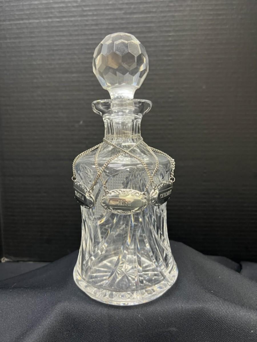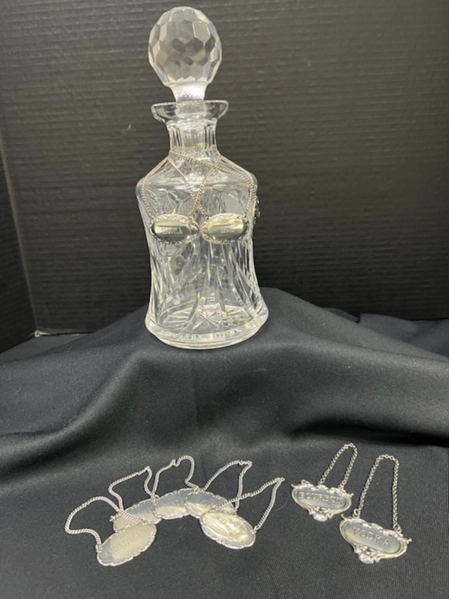 Beautiful cut crystal decanter, 3 pewter bracelets, 7 sterling silver beverage bracelets.
