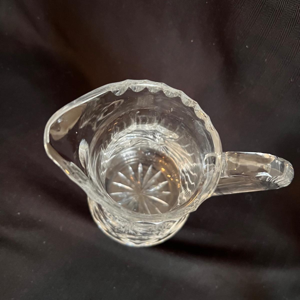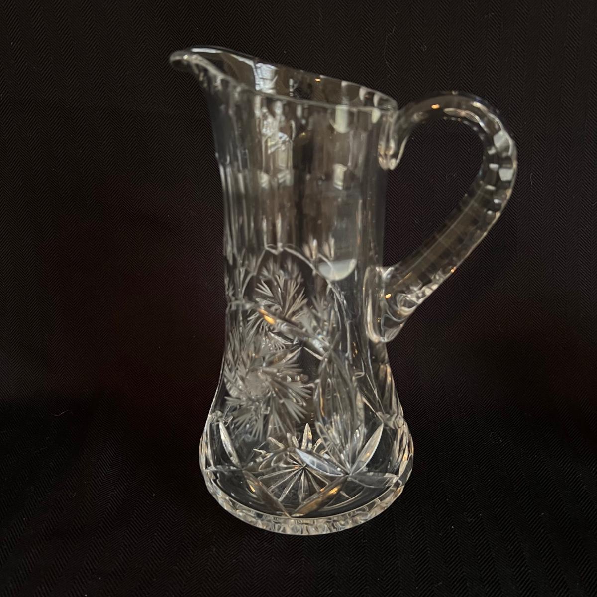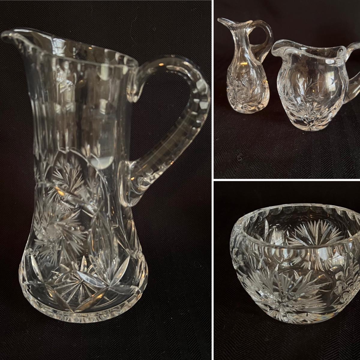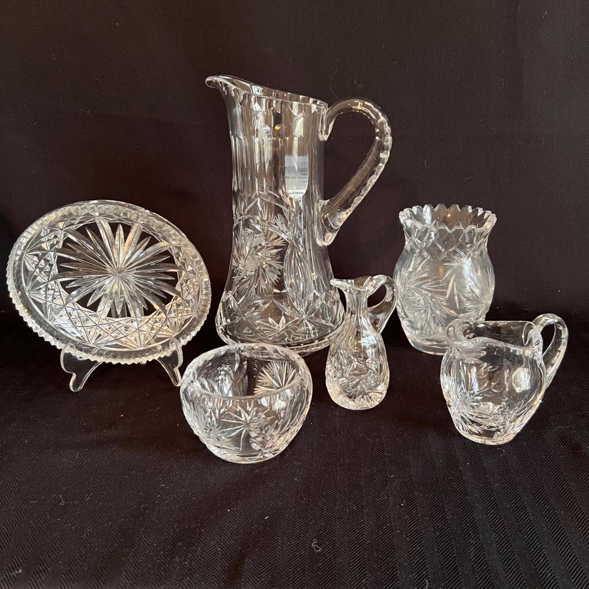 Six glass items includes what appears to be a tall cut glass pitcher with a distinctive crystal ping to it; no markings on this item to determine this or on any other items in this lot. A small dish has a similar design and ping to it; this bowl measures 4”D x 2.5”H and the pitcher measures 5”D (base) x 10”H. A small plate with plastic stand, a vase and two small pitchers also included. Note the small chip on the rim of the vase.