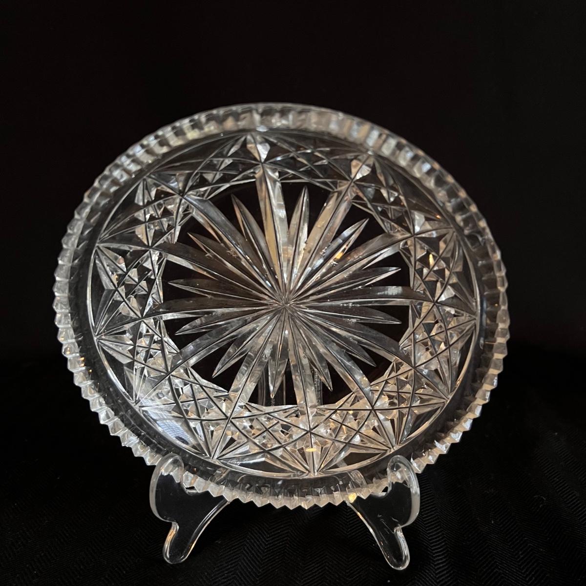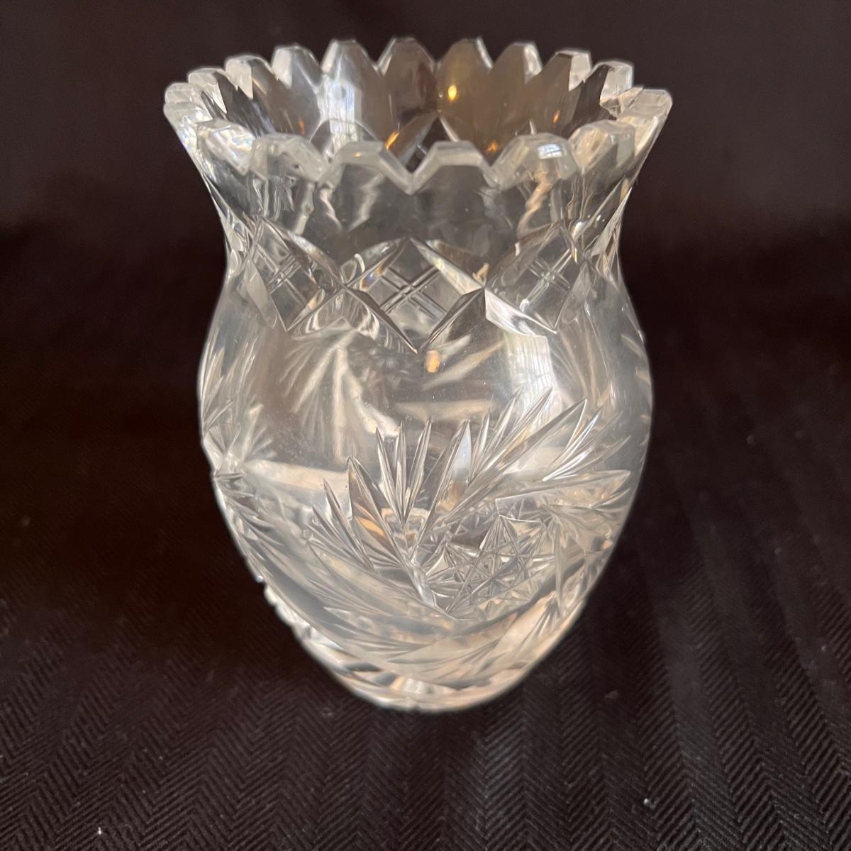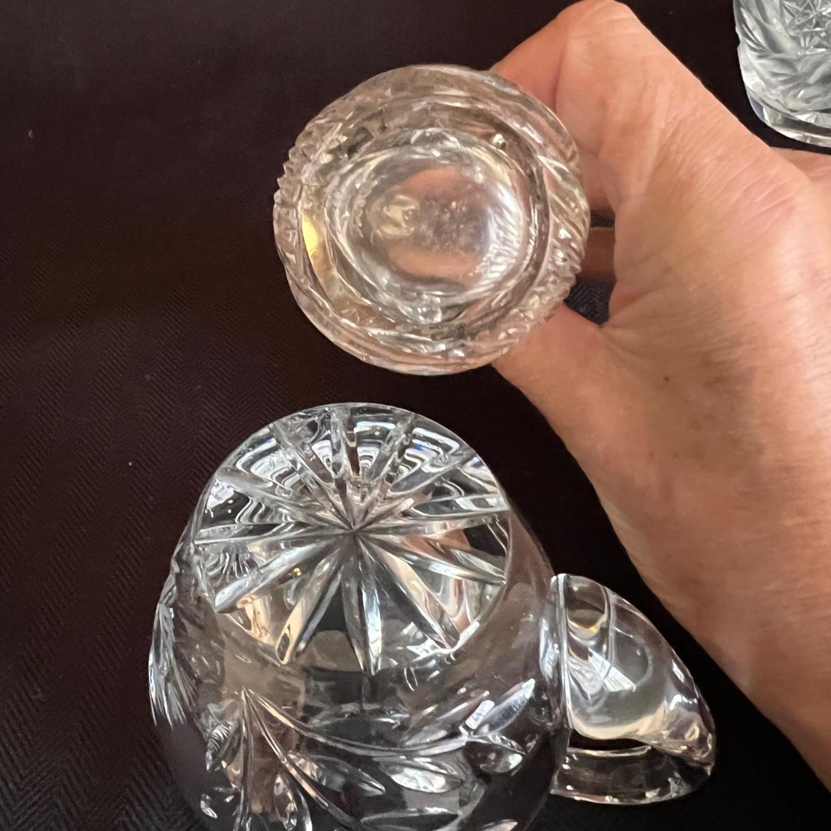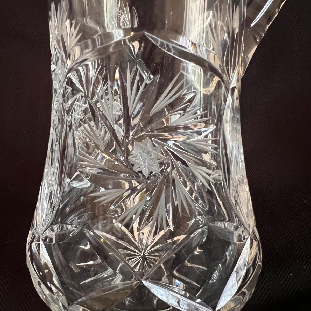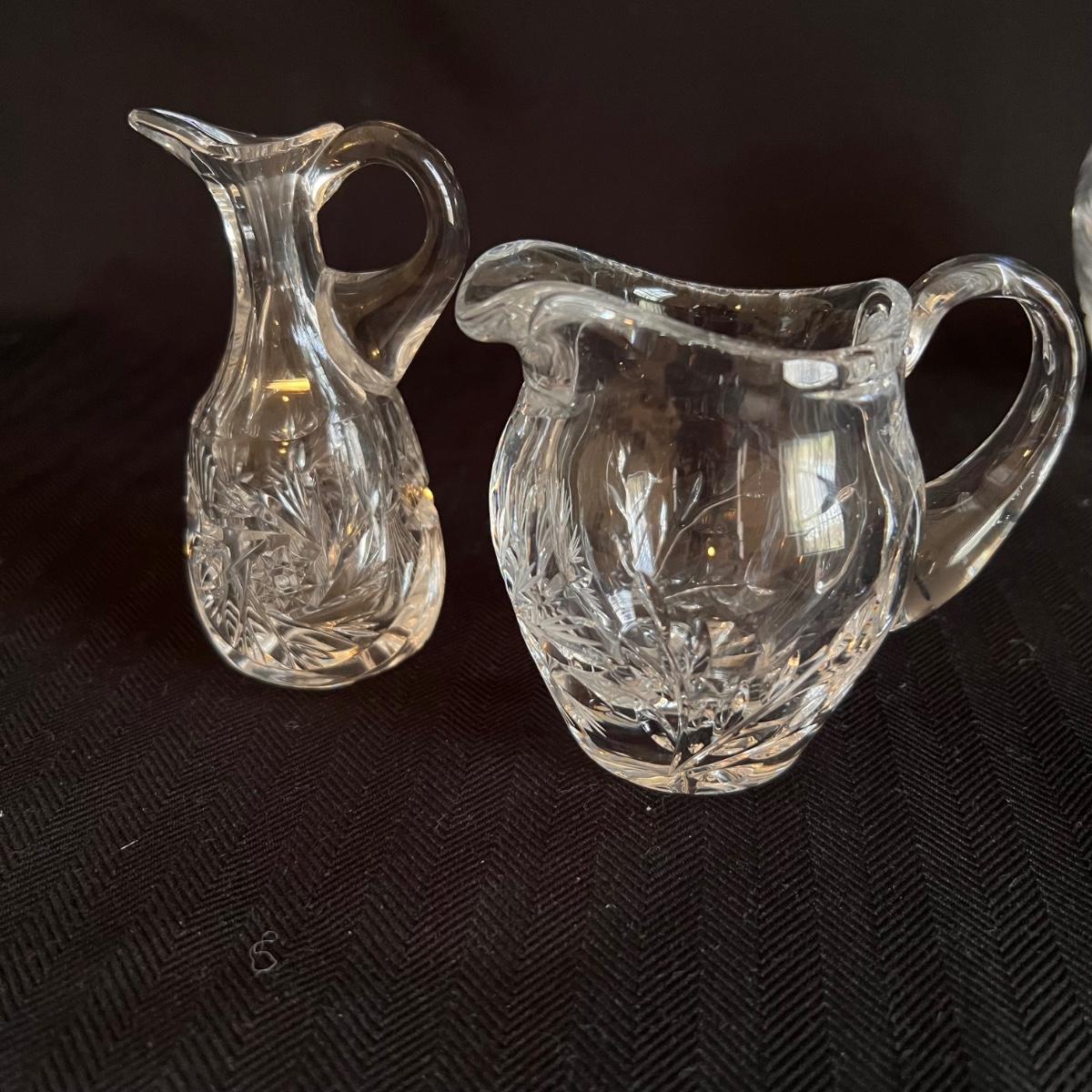 Six glass items includes what appears to be a tall cut glass pitcher with a distinctive crystal ping to it; no markings on this item to determine this or on any other items in this lot. A small dish has a similar design and ping to it; this bowl measures 4”D x 2.5”H and the pitcher measures 5”D (base) x 10”H. A small plate with plastic stand, a vase and two small pitchers also included. Note the small chip on the rim of the vase.