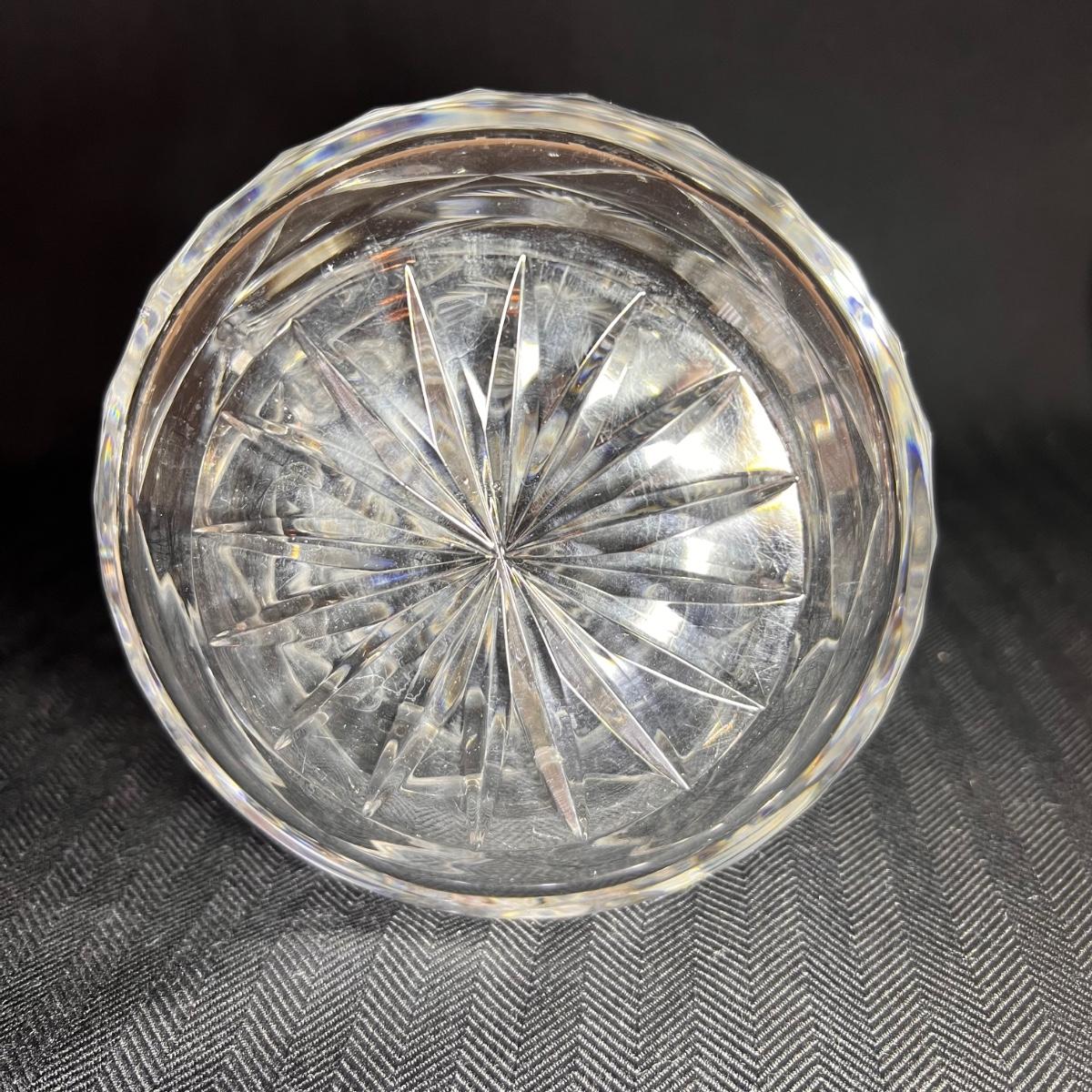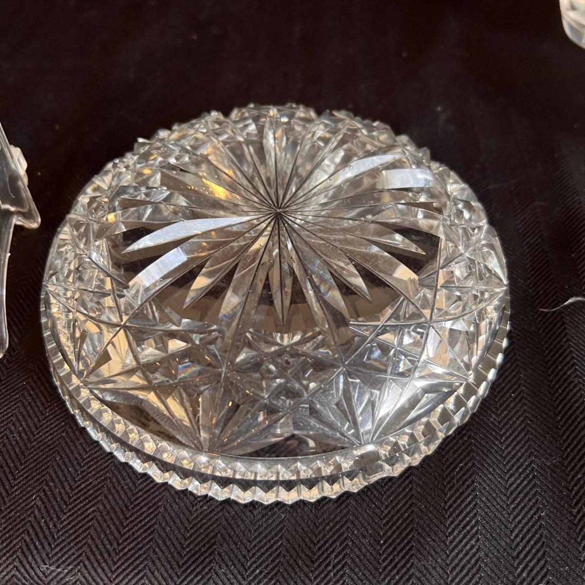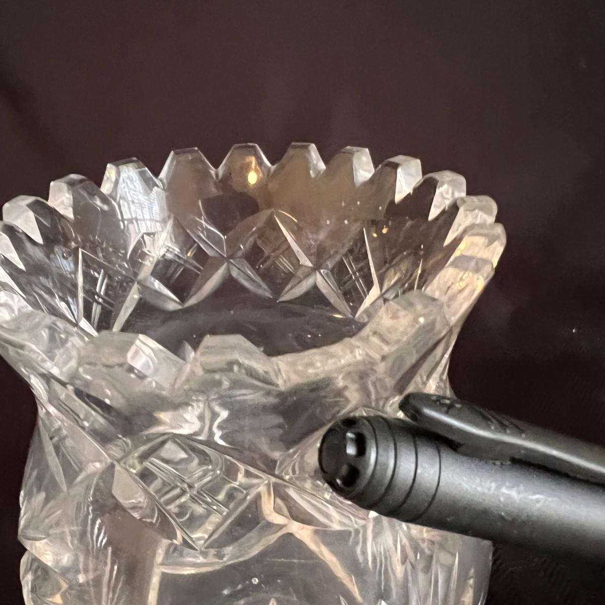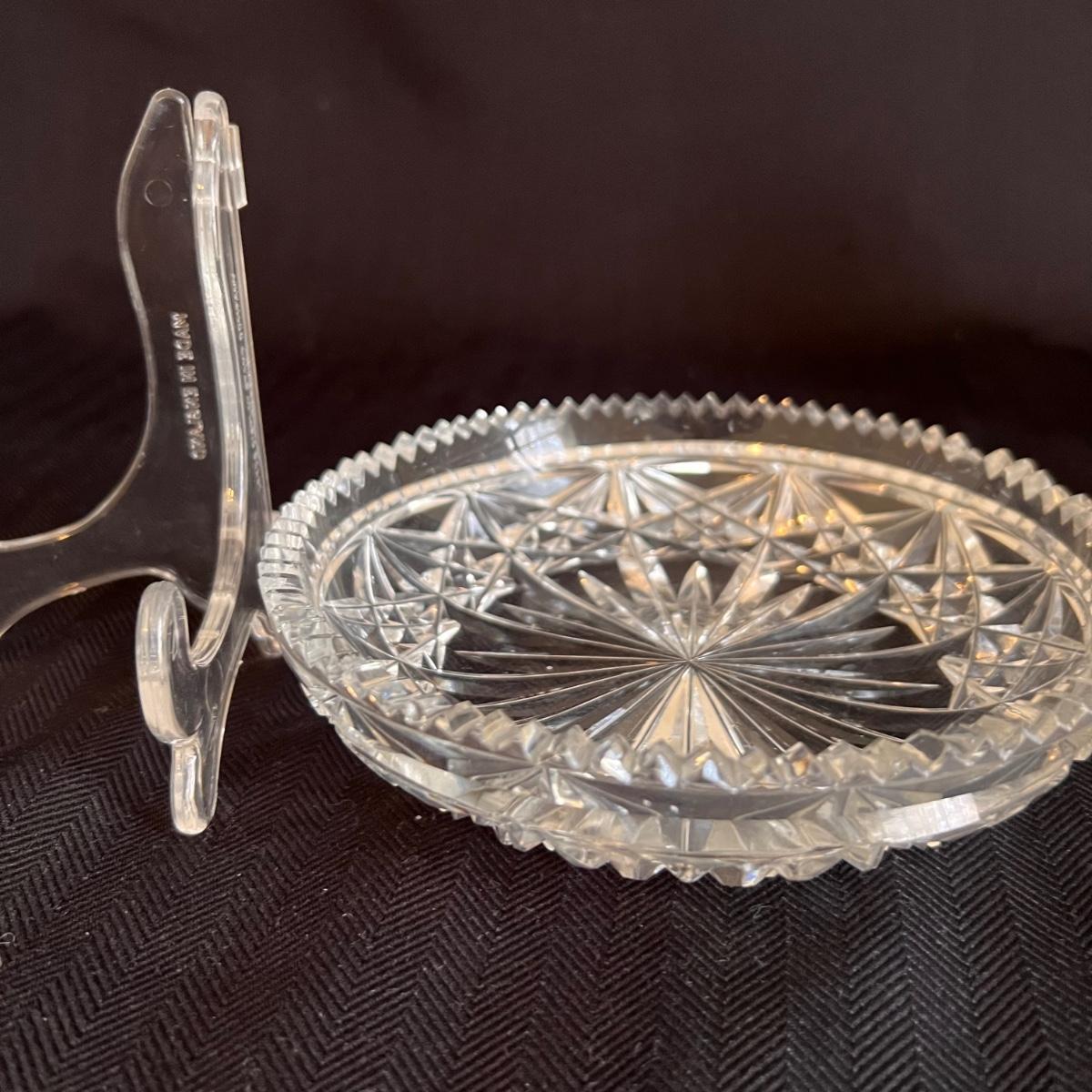 Six glass items includes what appears to be a tall cut glass pitcher with a distinctive crystal ping to it; no markings on this item to determine this or on any other items in this lot. A small dish has a similar design and ping to it; this bowl measures 4”D x 2.5”H and the pitcher measures 5”D (base) x 10”H. A small plate with plastic stand, a vase and two small pitchers also included. Note the small chip on the rim of the vase.
