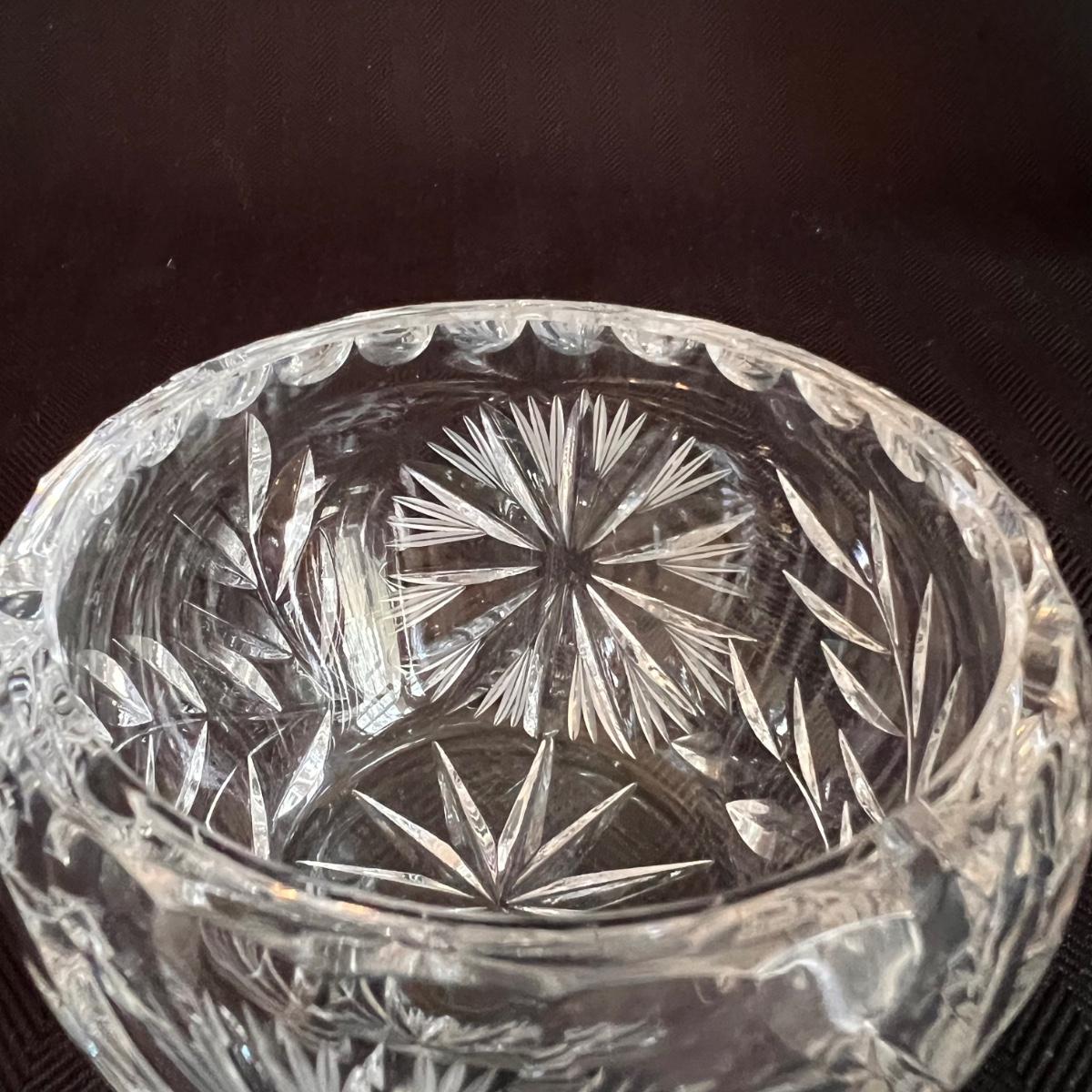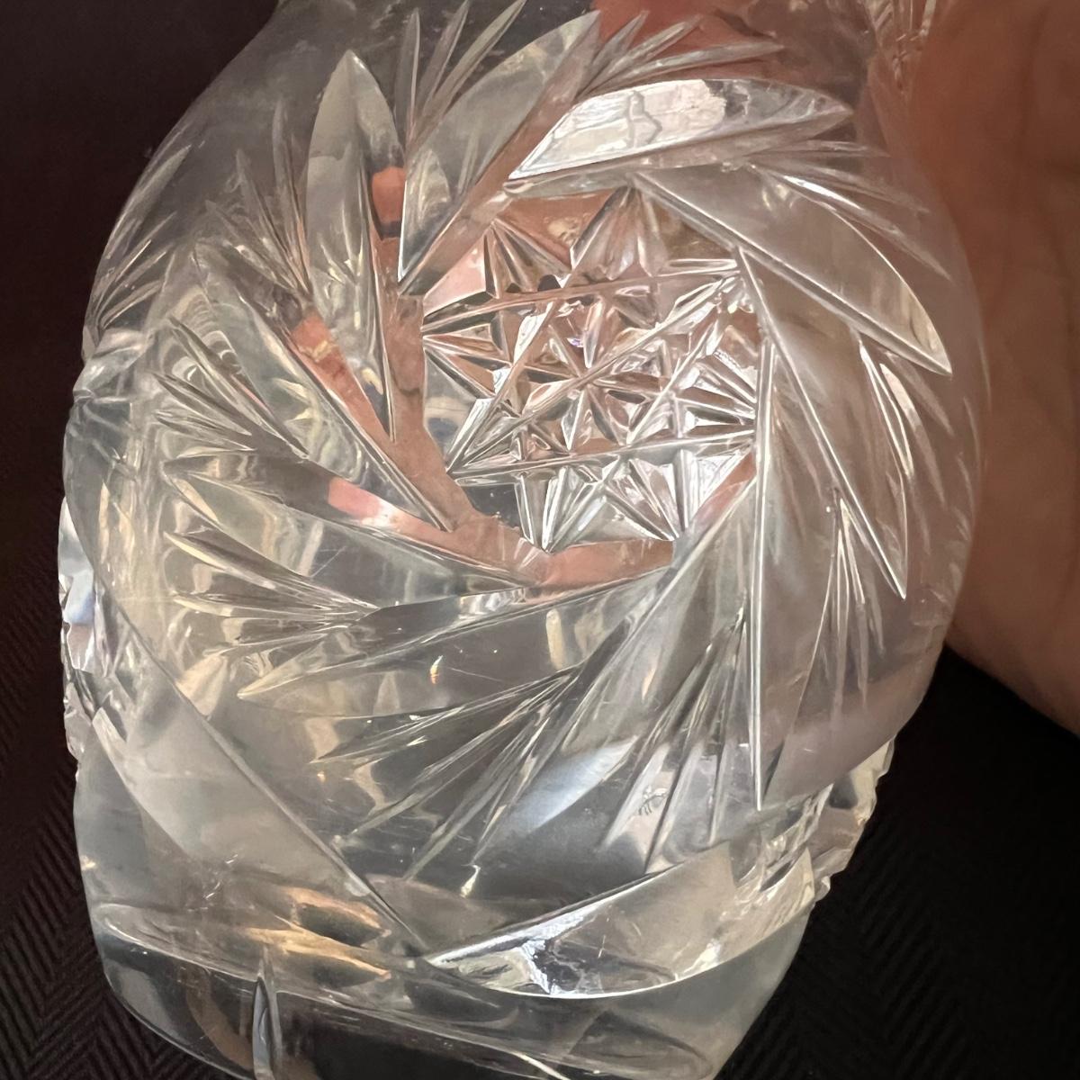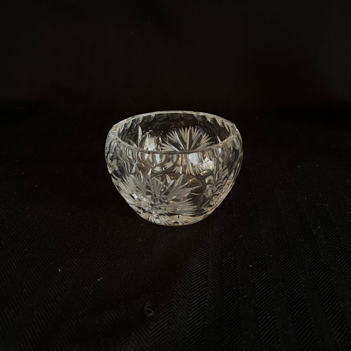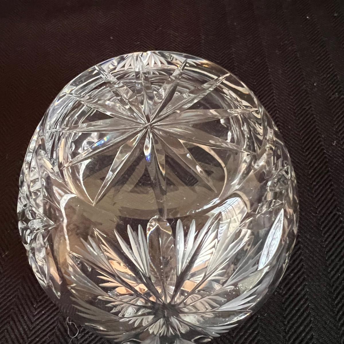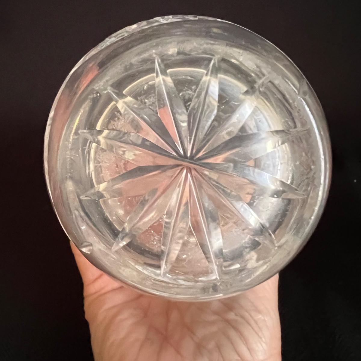 Six glass items includes what appears to be a tall cut glass pitcher with a distinctive crystal ping to it; no markings on this item to determine this or on any other items in this lot. A small dish has a similar design and ping to it; this bowl measures 4”D x 2.5”H and the pitcher measures 5”D (base) x 10”H. A small plate with plastic stand, a vase and two small pitchers also included. Note the small chip on the rim of the vase.