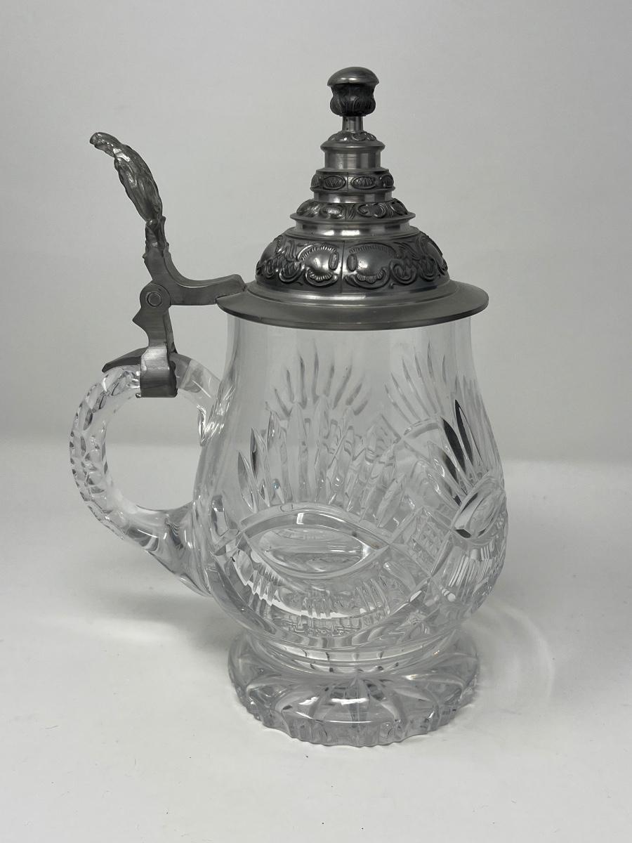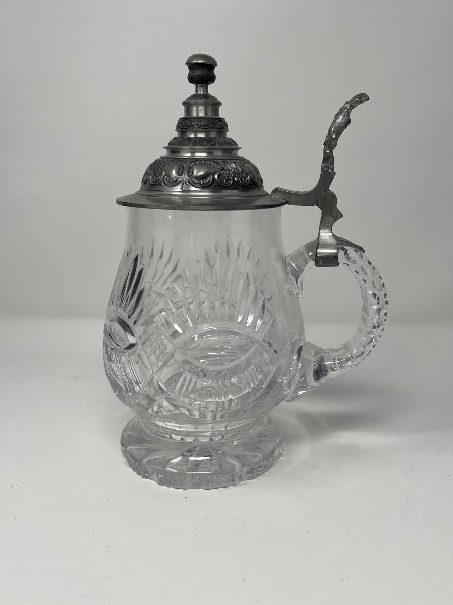 9.5” tall intricately cut crystal stein with hinged pewter lid. 7” wide to handle.