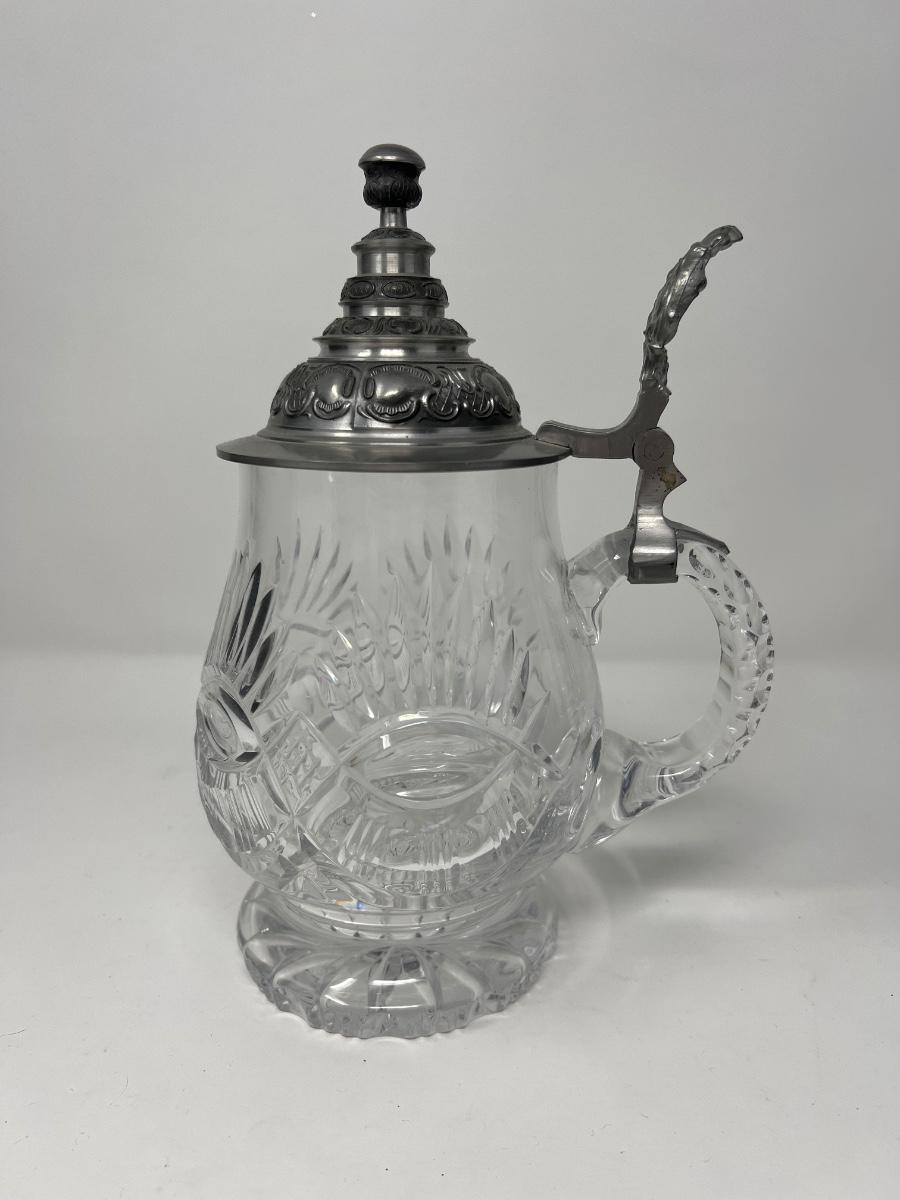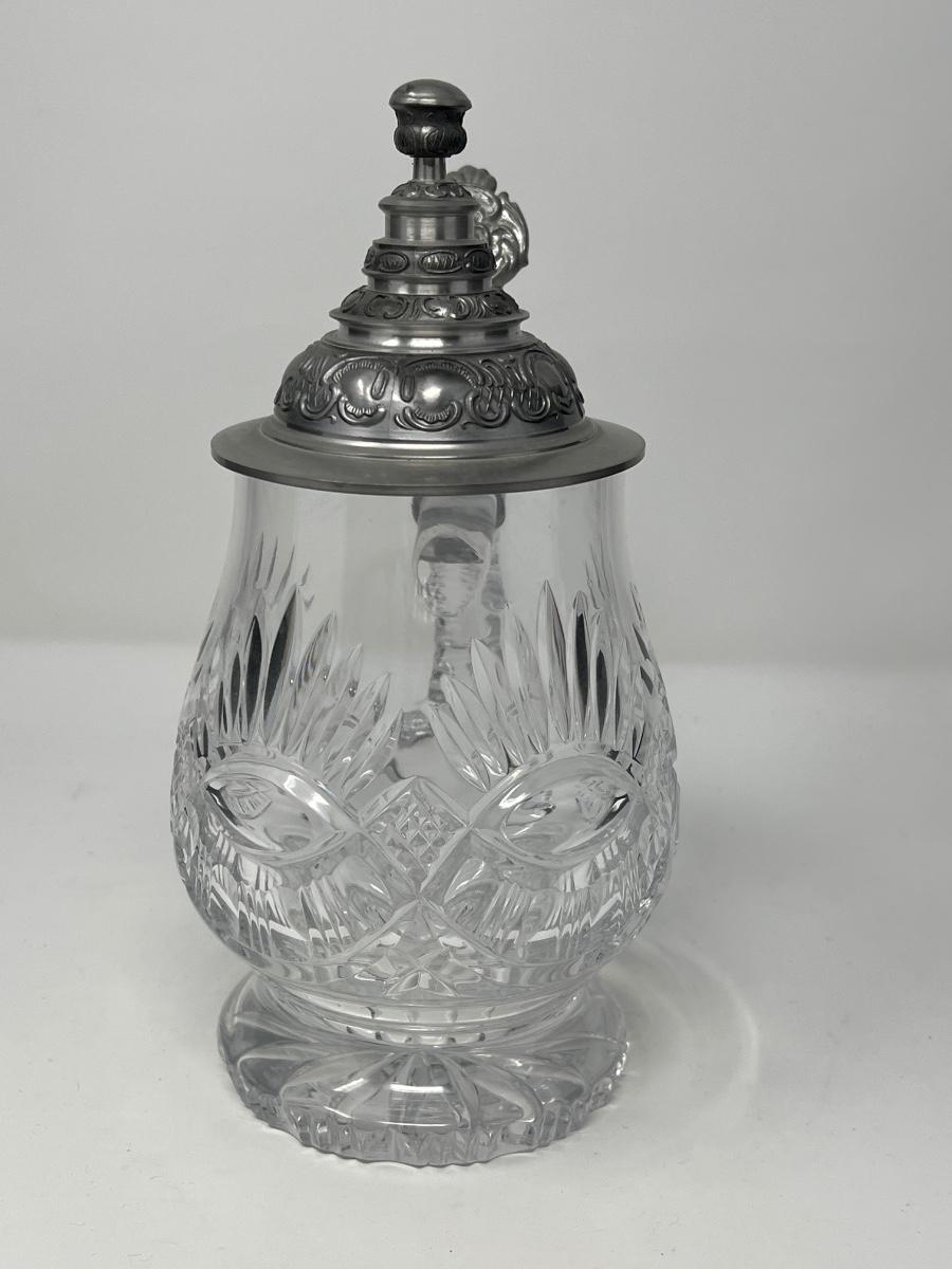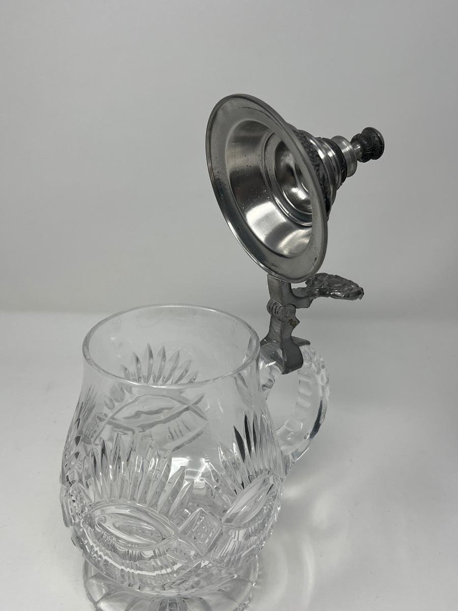 9.5” tall intricately cut crystal stein with hinged pewter lid. 7” wide to handle.